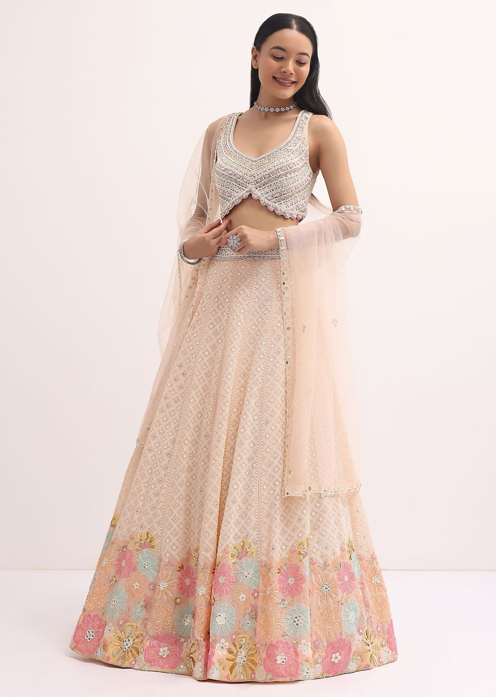 Exude glamour with our elegant peach lehenga choli set, meticulously fashioned for wedding receptions and special events. Made from luxurious net georgette fabric, it showcases intricate embellishments, including sequins, moti, cut dana, stones, and resham work. This set includes a lehenga, choli, and dupatta. Awarded as the Most Trusted Brand, we're delivering styles you love, just as promised.