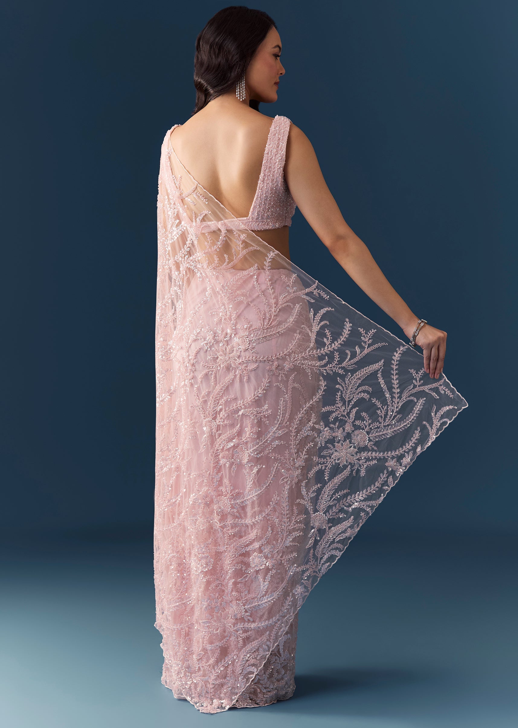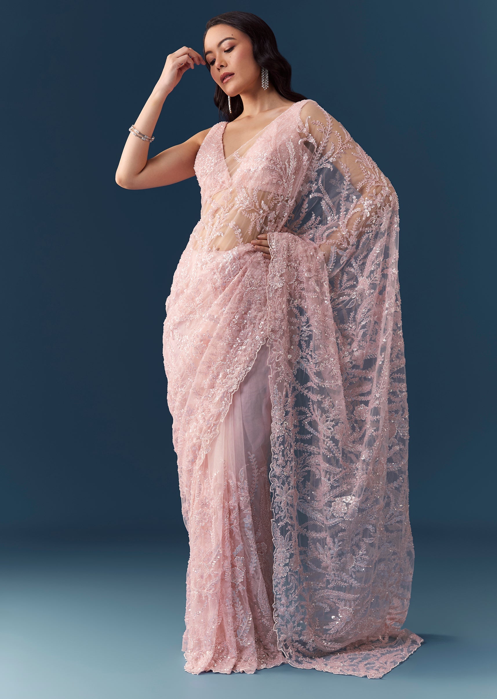 Peach Net Floral Jaal Cutwork Saree with Unstitched Blouse