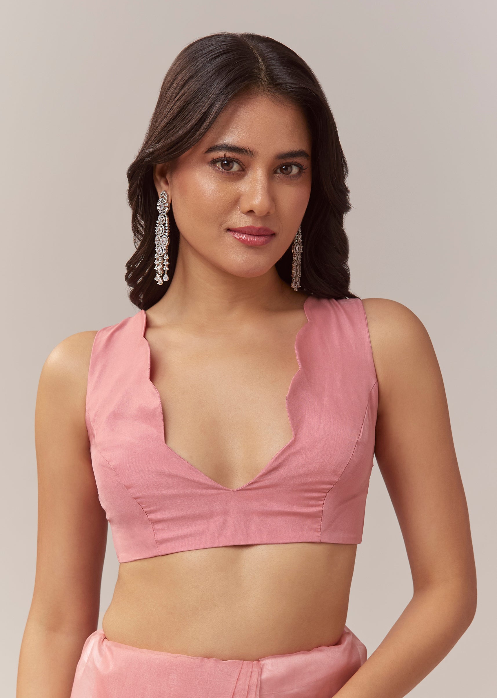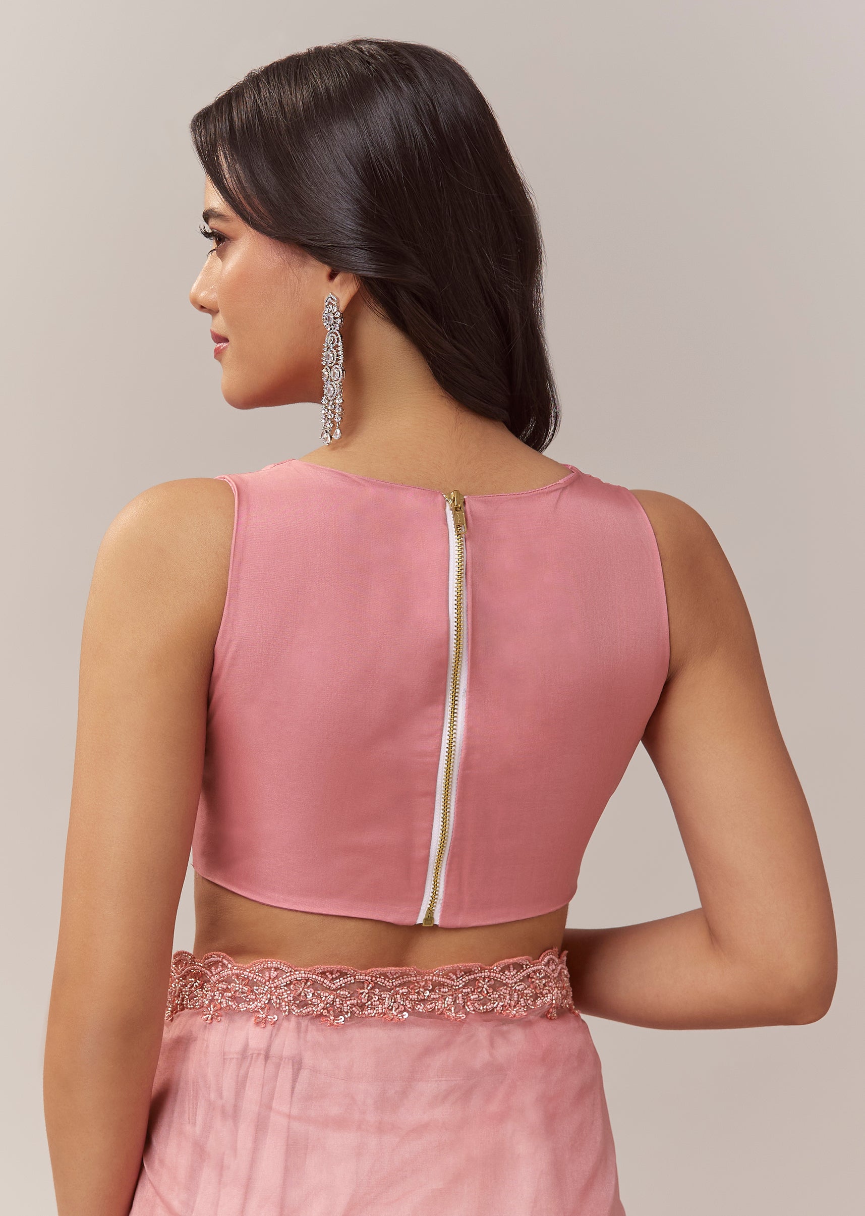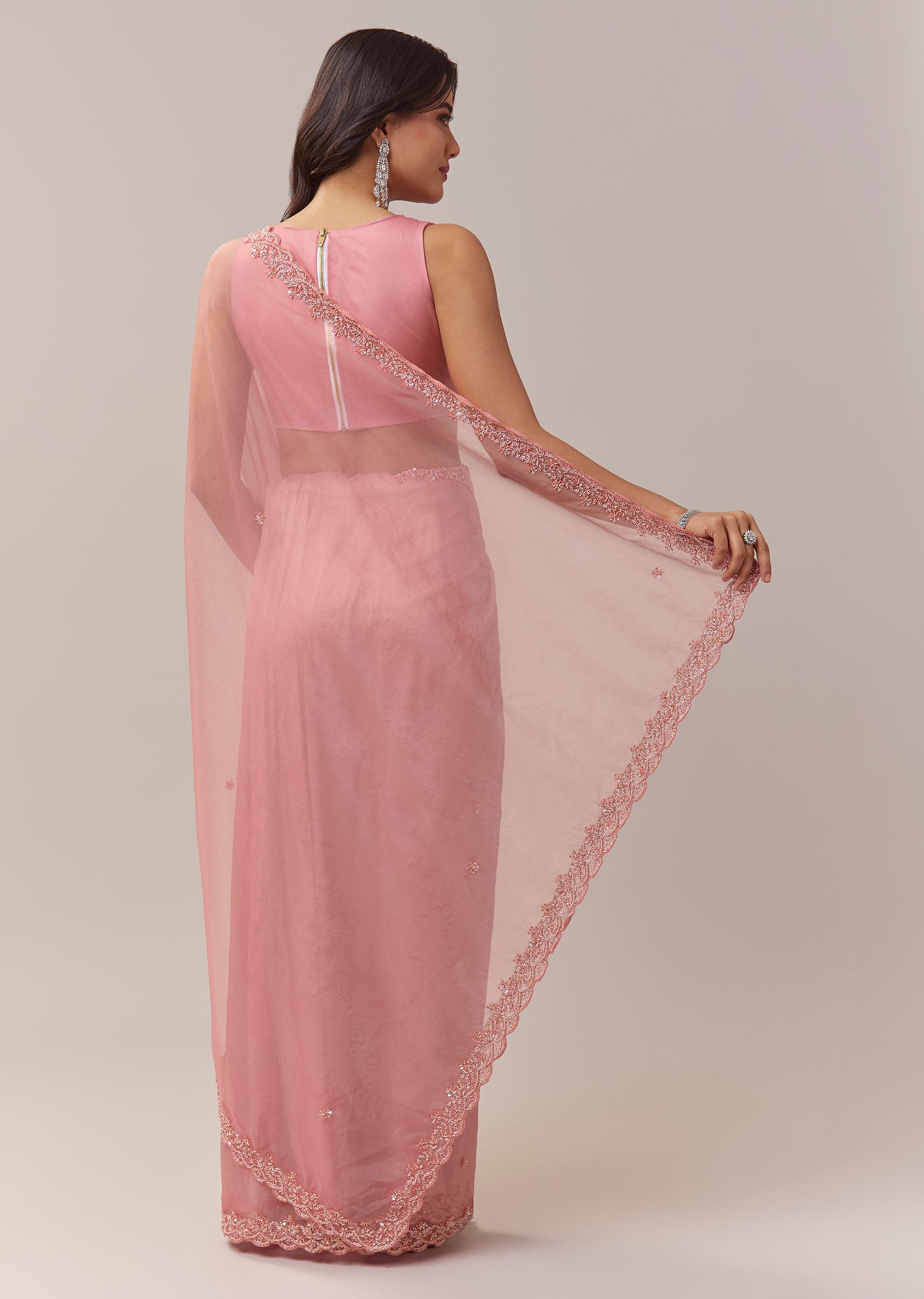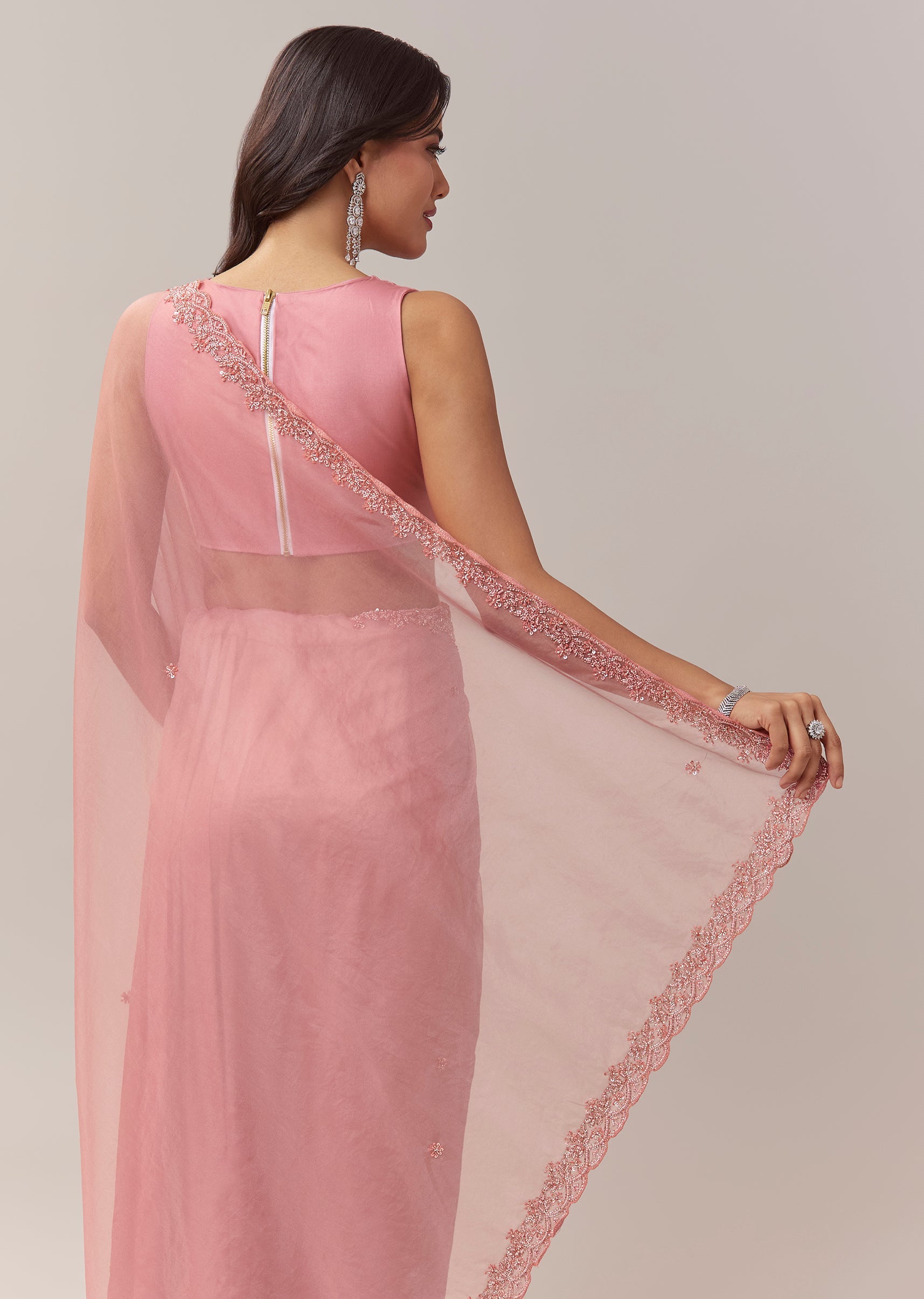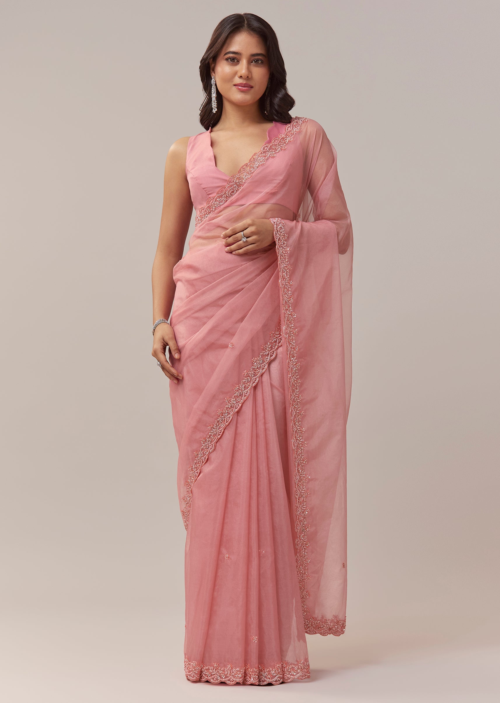 This peach organza saree brings a soft pastel elegance with a delicate festive charm. The sheer organza base offers a graceful flow, highlighted by a beautifully crafted scallop border that adds refined structure to the drape. Small butti motifs embroidered with cutdana, beads, and sequins create a gentle shimmer throughout, giving the saree a subtle yet captivating glow. It comes with an unstitched blouse, allowing you to tailor it to your preferred style for a perfectly personalised fit. Awarded as the Most Trusted Brand, we're delivering styles you love, just as promised.