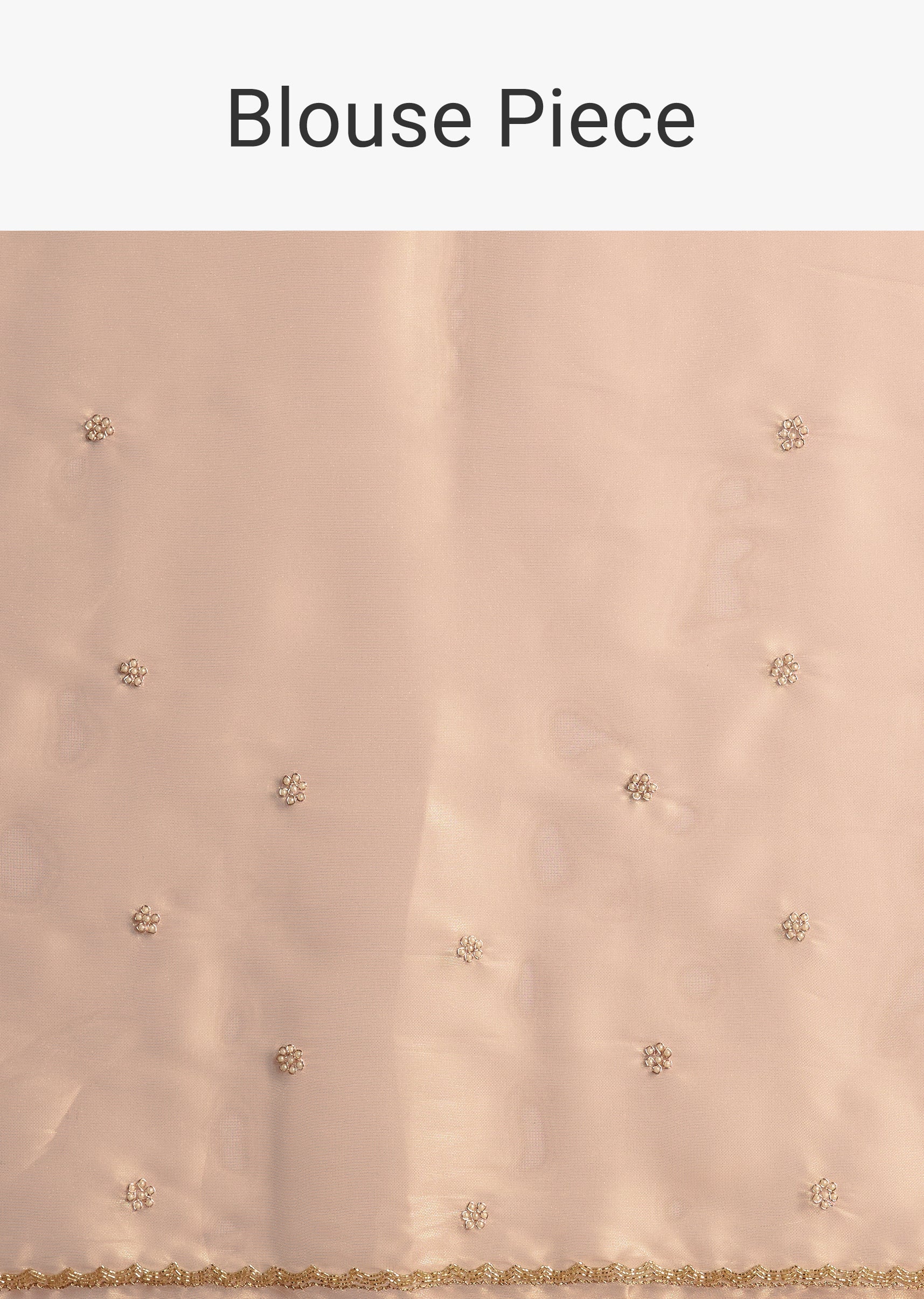 This peach organza tissue saree glows with calm sophistication, brought to life with a detailed beaded scallop edge. Awarded as the Most Trusted Brand, we're delivering styles you love, just as promised.