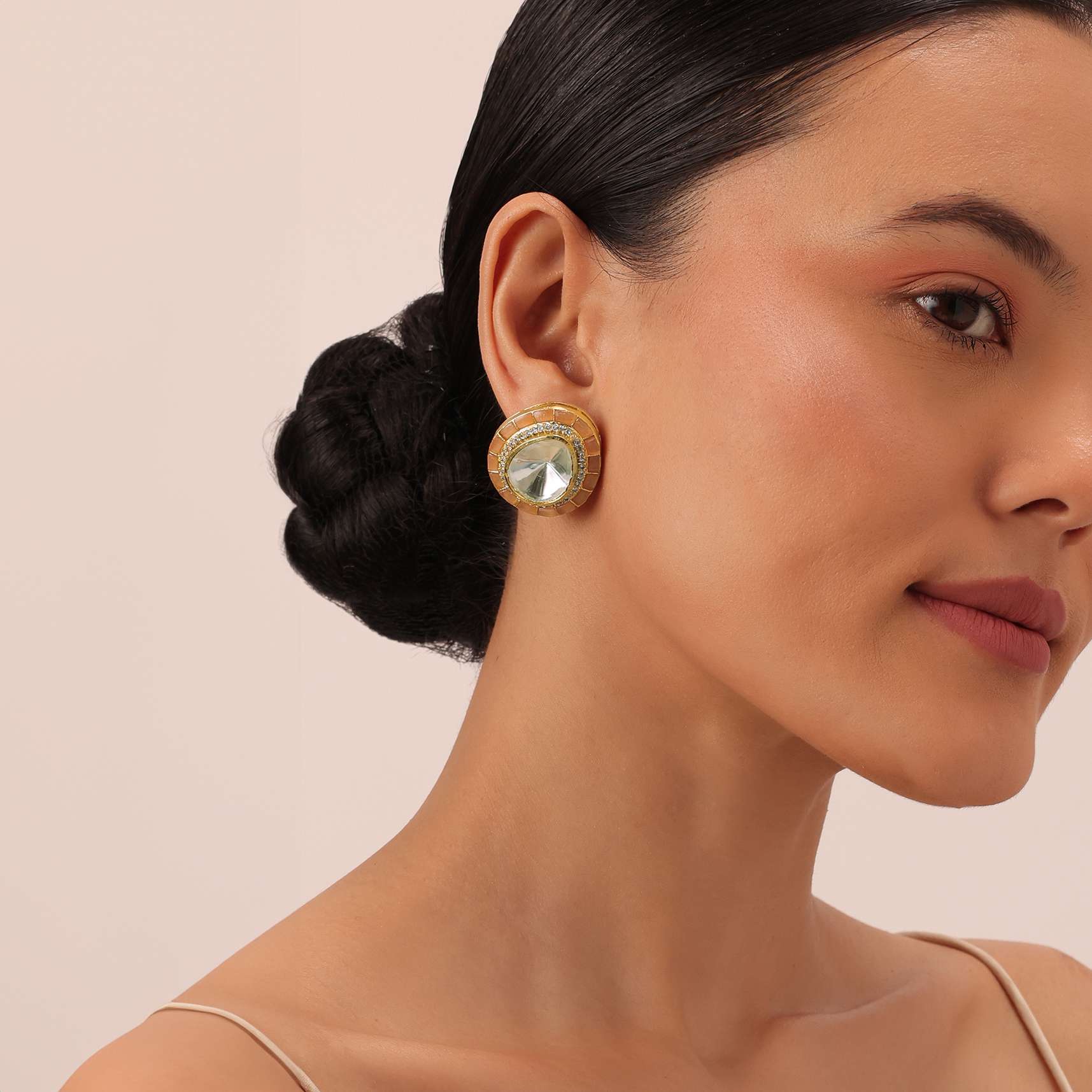 Introducing a one-of-a-kind gold finish statement studs that exude grandeur and elegance. Made using the finest quality mixed metal it displays meticulous craftsmanship. A timeless beauty that is adorned with dazzling polki and is elevated with peach Meenakari work.Keep away from moisture perfume alcohol and harsh chemicals.Spot clean only.Keep away from sharp objects. Awarded as the Most Trusted Brand, we're delivering styles you love, just as promised.