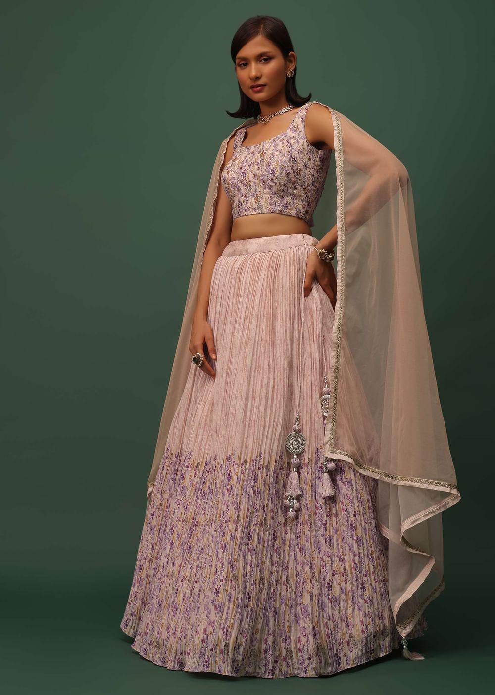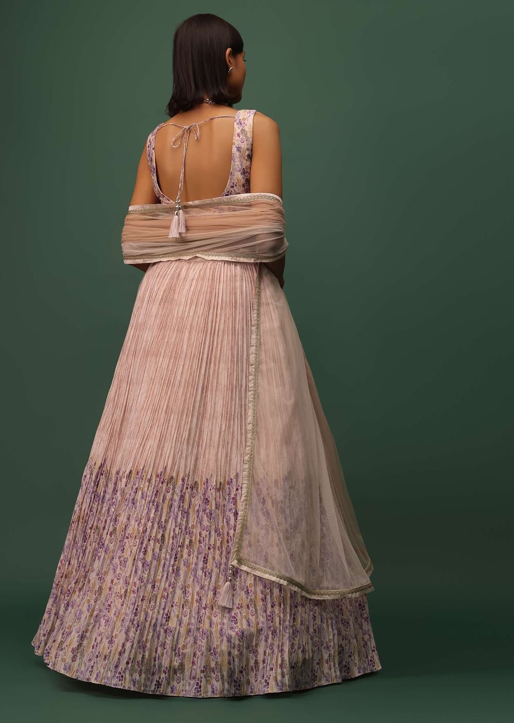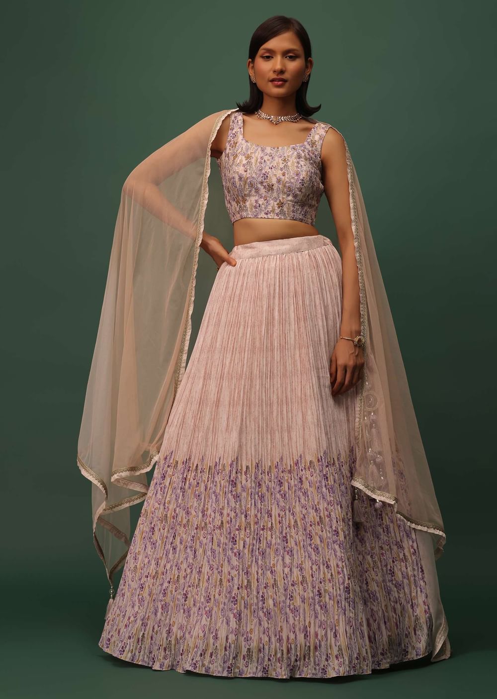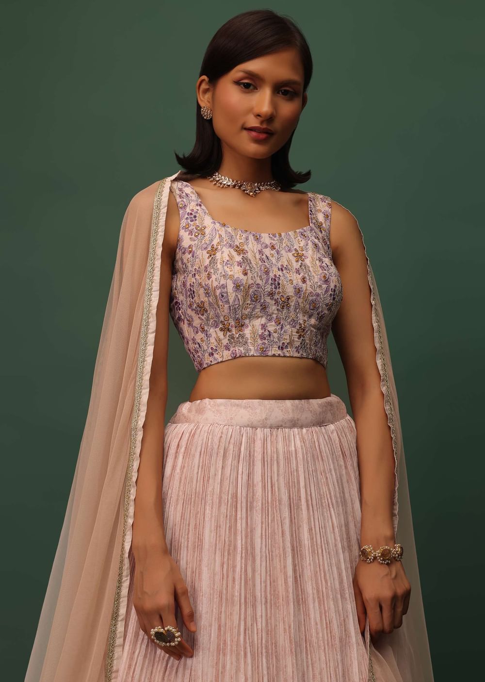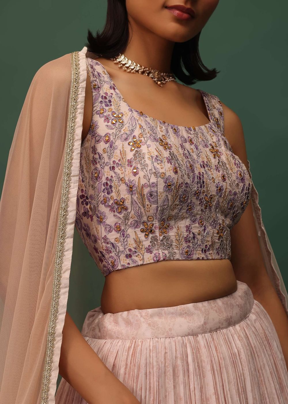 Peach Pink Embroidered Lehenga Set In Silk With Floral Print