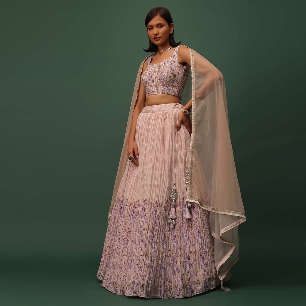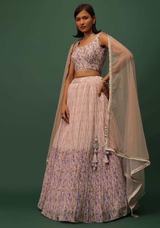 Introducing our stunning peach pink lehenga and blouse set adorned with an elegant floral print designed to make you look like a vision of grace. The lehenga set features intricate... More Product Details