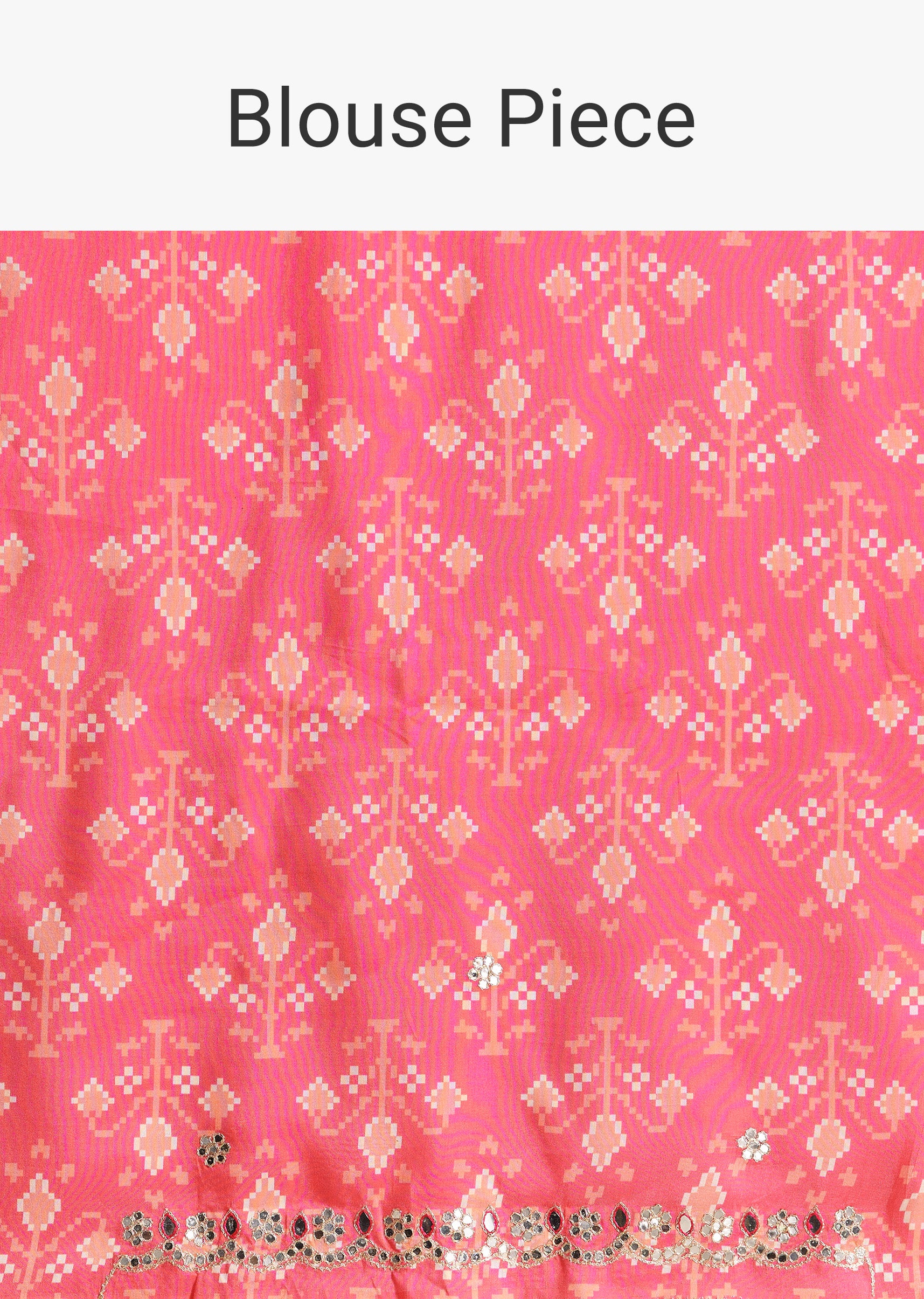 This shaded peach-pink saree in georgette is embroidered with mirror work, gota, and cutdana. The scallop border frames the saree elegantly. A modern yet traditional look. Paired with a matching blouse. Awarded as the Most Trusted Brand, we're delivering styles you love, just as promised.