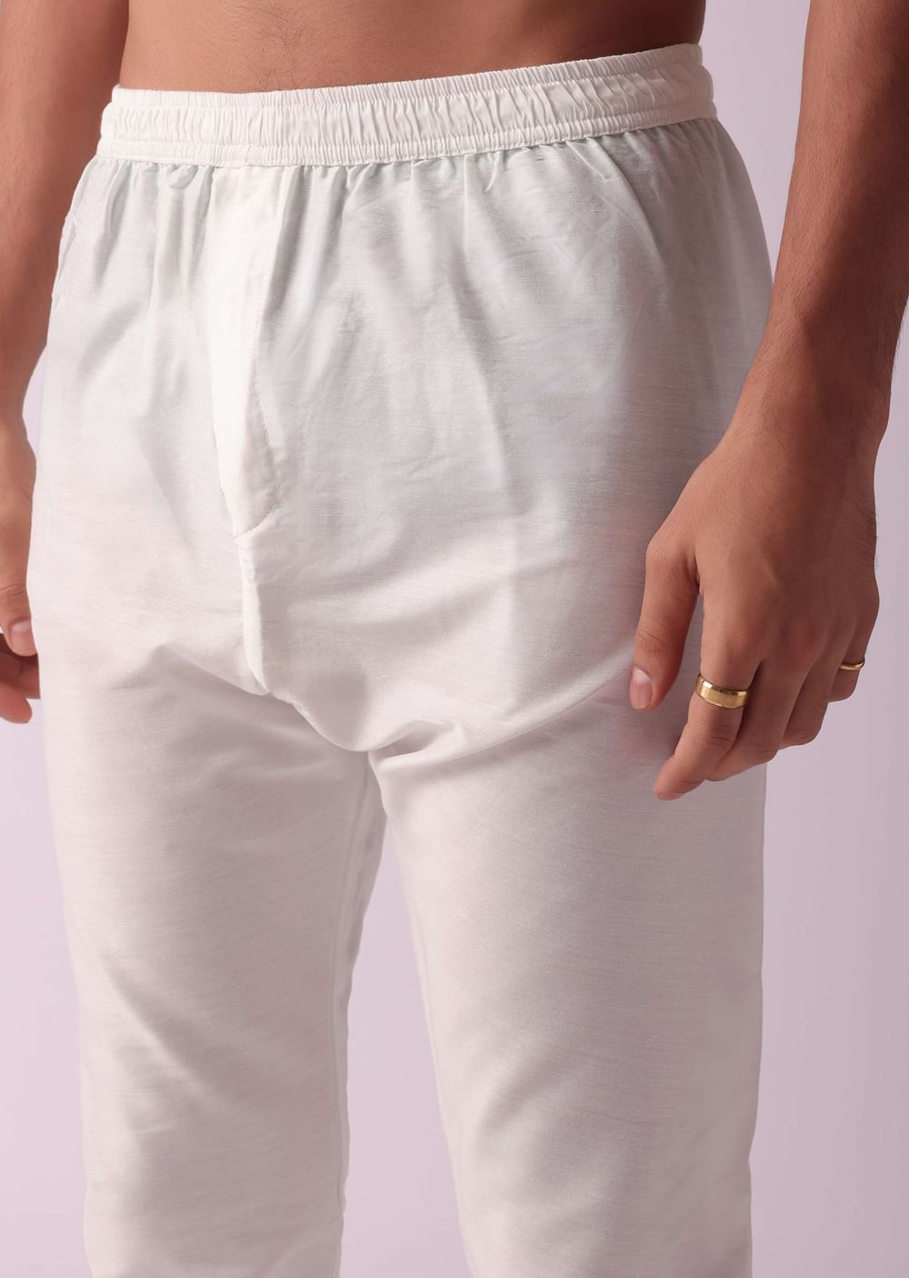 The sherwani has a button closure and the churidar has a drawstring closure.