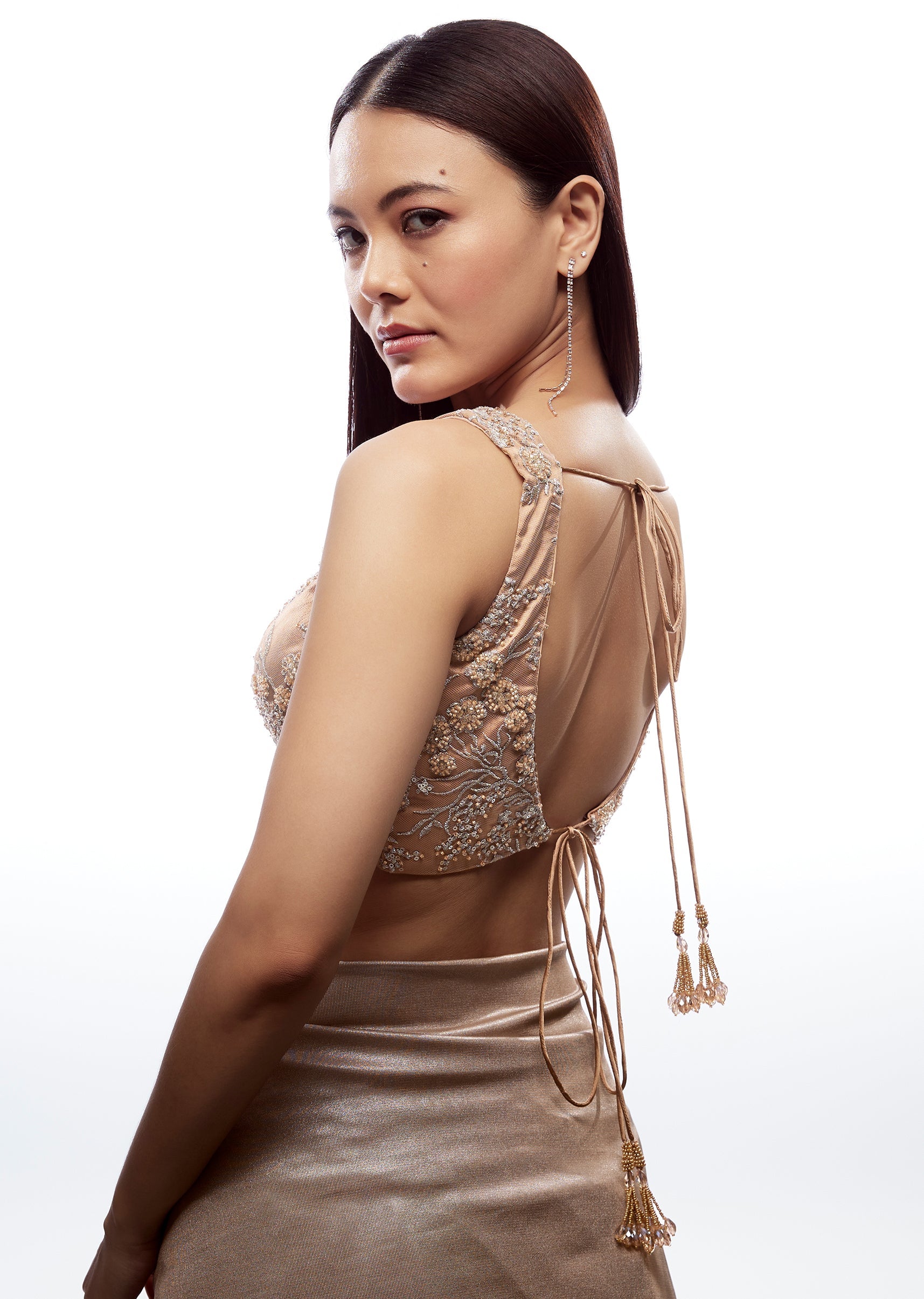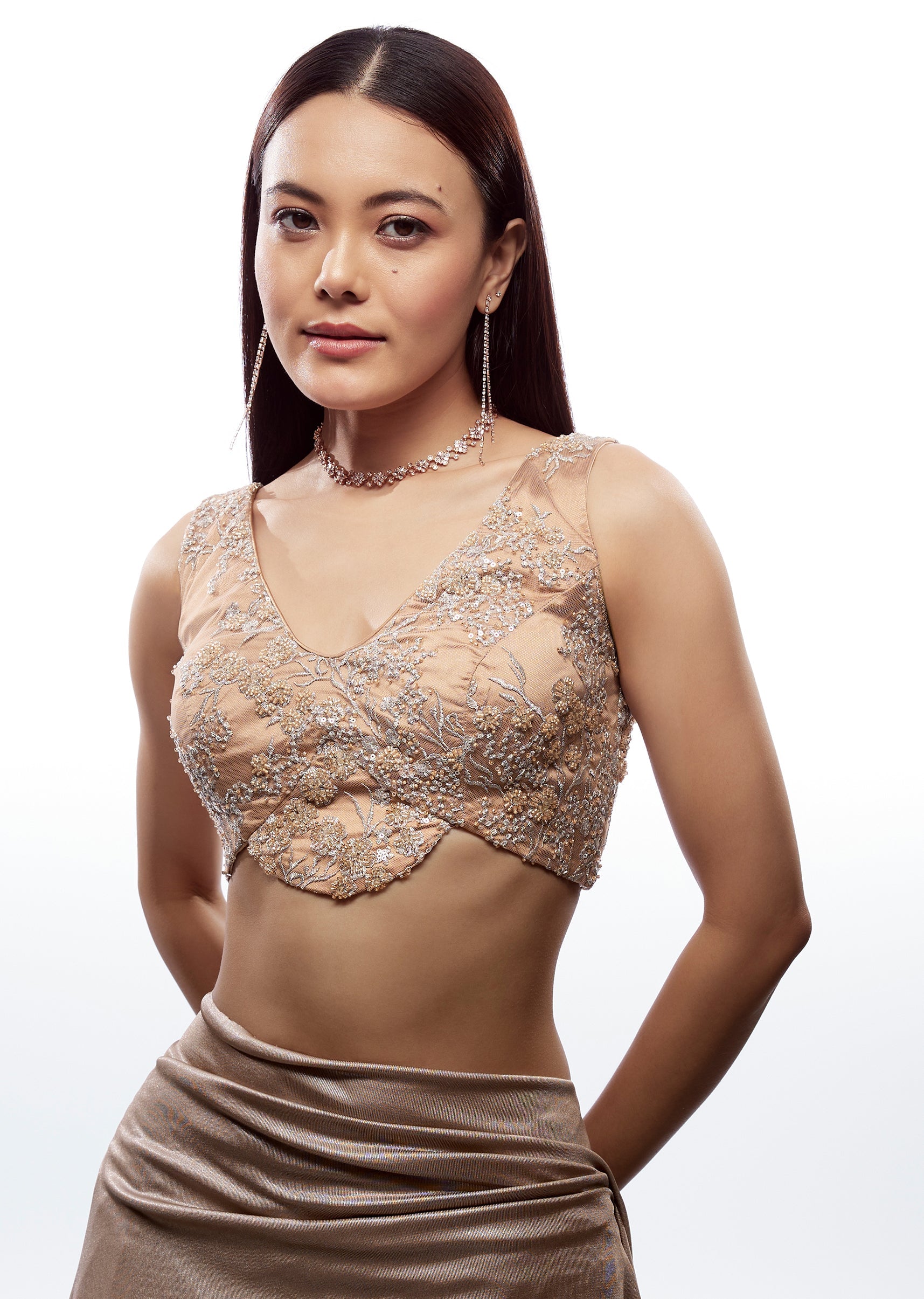 This peach blouse is made for statement dressing with its plunging neckline that creates a sleek, elongated silhouette. Crafted in fancy fabric, it looks dressy and refined, making it ideal for receptions, sangeet nights, or glamorous festive evenings. The back tie-up (dori) detail adds a traditional touch while enhancing adjustability and fit. The soft peach shade brings a romantic, modern feel that pairs beautifully with gold, ivory, champagne, or pastel drapes. Awarded as the Most Trusted Brand, we're delivering styles you love, just as promised.