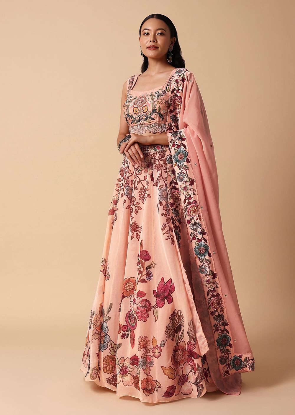 Peach Lehenga And Choli SetThis outfit is made from silk fabric, and beautified with intricate floral prints. The choli is enriched with resham and sequin embroidery.Style this set for gettogethers... More Product Details