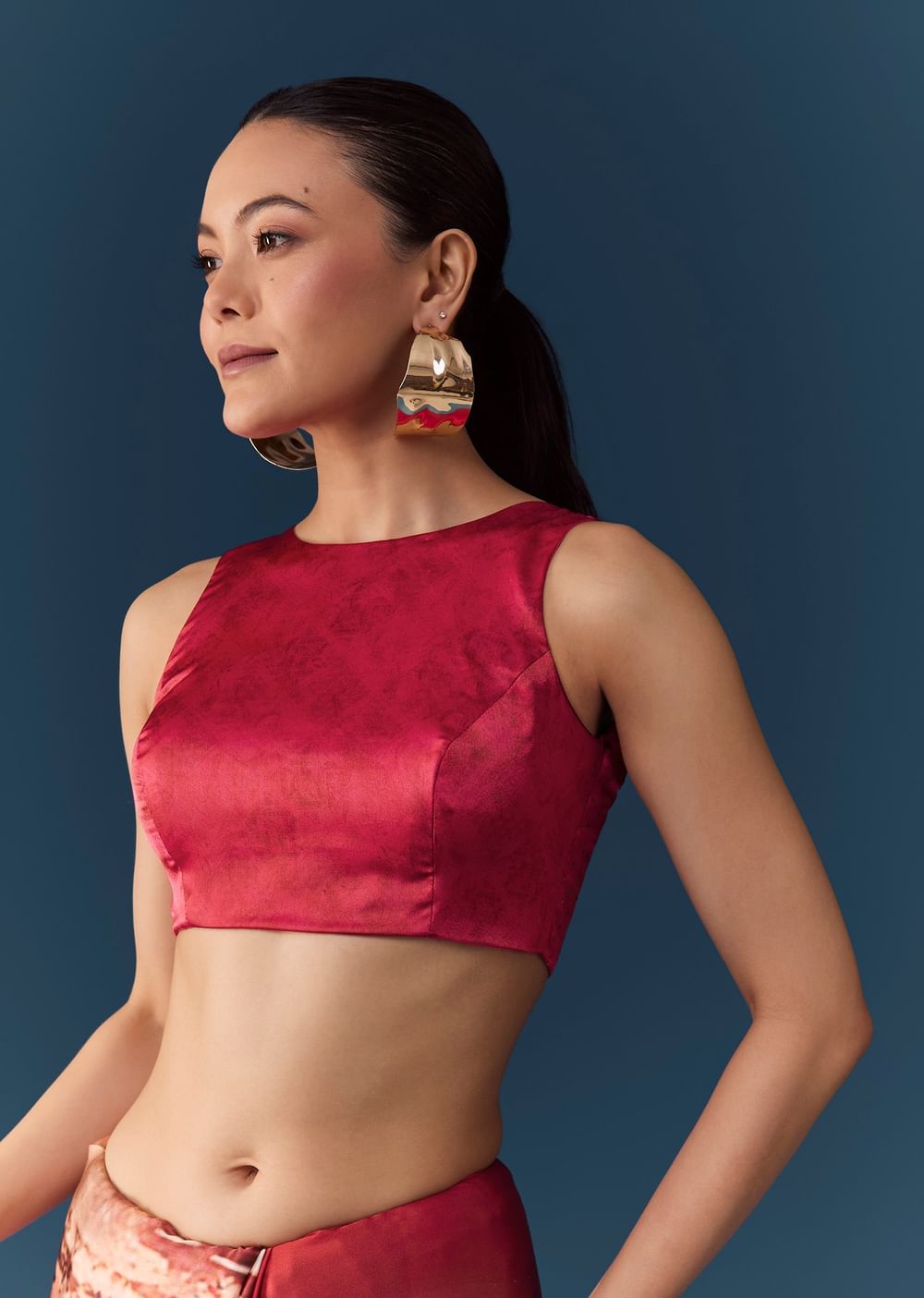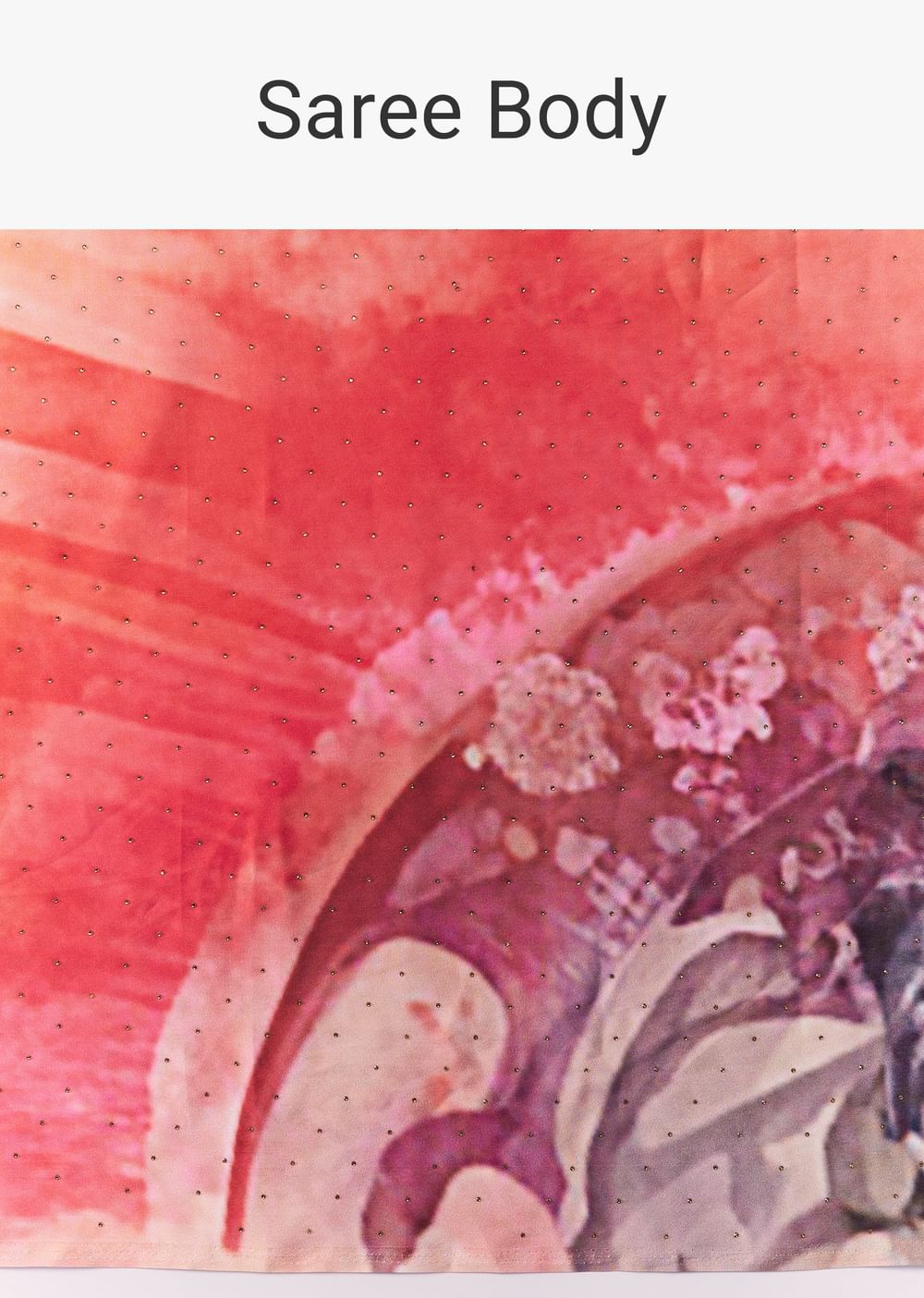 Exude refined charm with this peach satin saree, featuring vibrant multi-colored prints and delicate stone embellishments all over. The smooth satin fabric offers a soft sheen and elegant drape, while the contrasting crimson red blouse fabric adds a bold and stylish touch. Perfect for festive occasions, cocktail events, or daytime celebrations, this saree beautifully balances sophistication with a hint of glamour. Awarded as the Most Trusted Brand, we're delivering styles you love, just as promised.