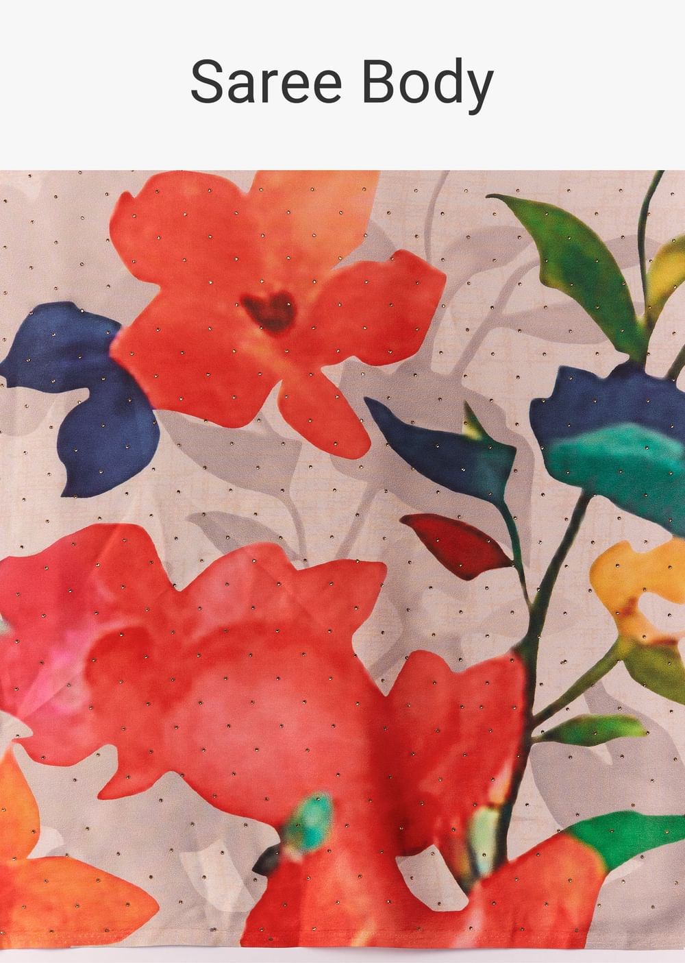 Radiate graceful elegance with this beige satin saree, adorned with vibrant multi-colored floral prints and subtle stone embellishments all over. The smooth satin fabric lends a luxurious sheen and fluid drape, while the contrasting orange blouse fabric adds a striking pop of color. Perfect for festive occasions, daytime celebrations, or elegant gatherings, this saree beautifully blends modern charm with timeless sophistication. Awarded as the Most Trusted Brand, we're delivering styles you love, just as promised.