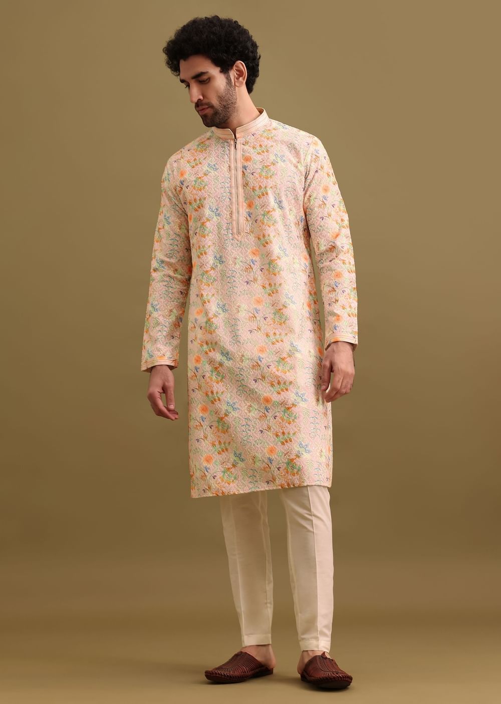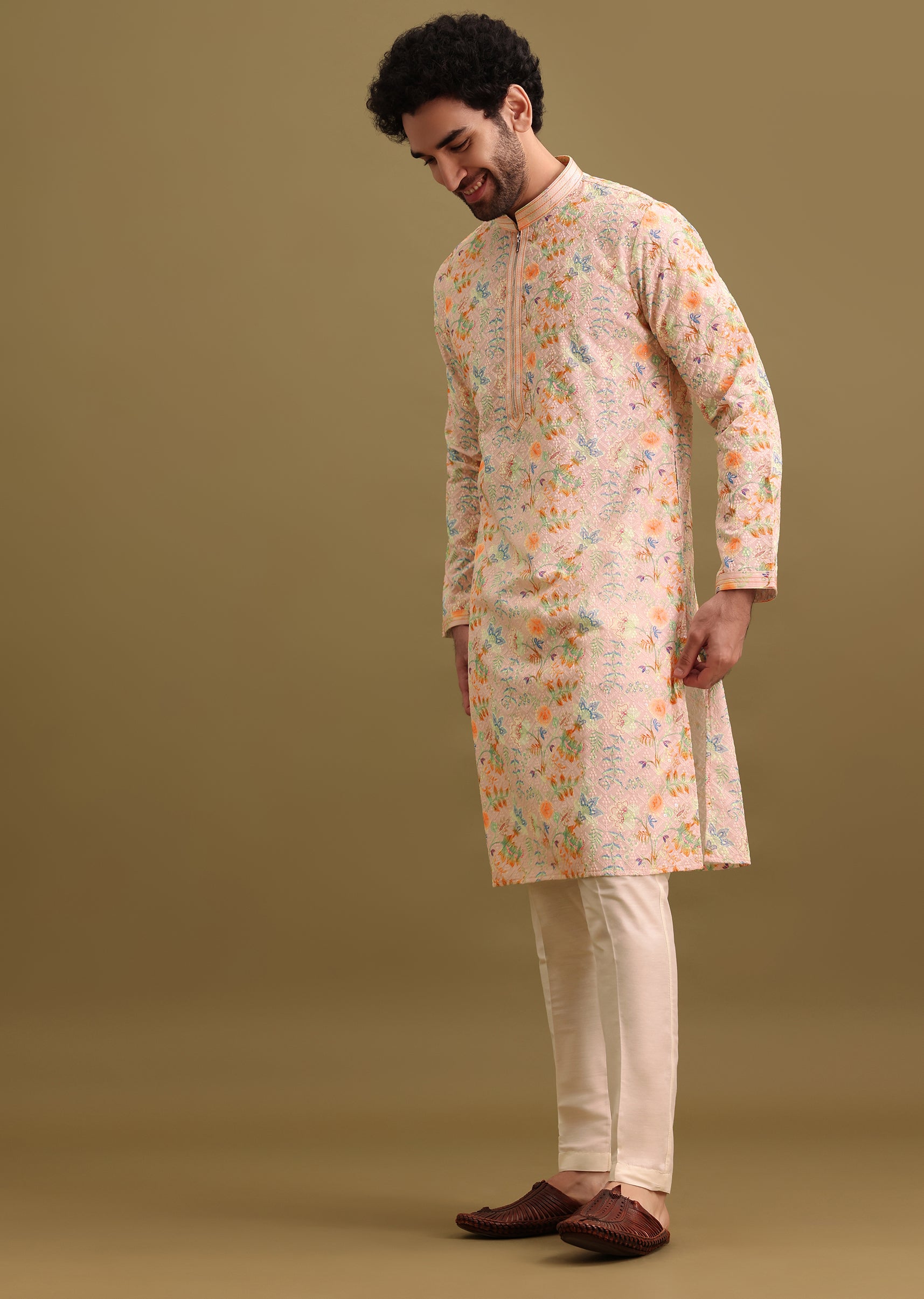 Unveil your elegance with our peach kurta set. Adorned with intricate digital prints and schiffli work detailing, this ensemble is a masterpiece of modern craftsmanship. The soft peach hue exudes sophistication, while the silk fabric ensures comfort and style. Perfect for festive occasions. The kurta is paired with pants. Button design, shape, and size may vary as per availability. Awarded as the Most Trusted Brand, we're delivering styles you love, just as promised.