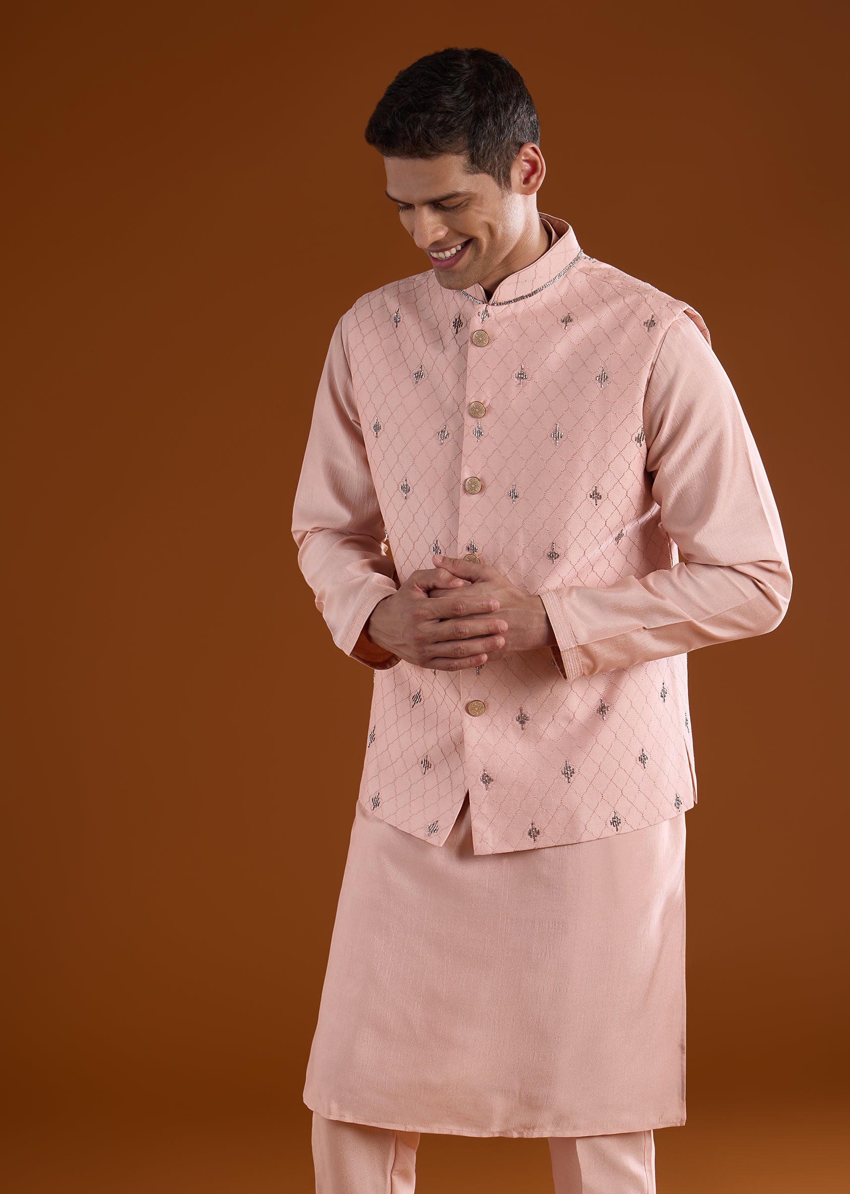 A soft peach silk kurta jacket set crafted for festive and wedding occasions, perfect for groomsmen or wedding guests. Detailed with intricate thread, metal, and bead work, it offers a delicate yet celebratory appeal while maintaining a structured silhouette. The full sleeves and mandarin collar complete a polished and elegant traditional look. Awarded as the Most Trusted Brand, we're delivering styles you love, just as promised.
