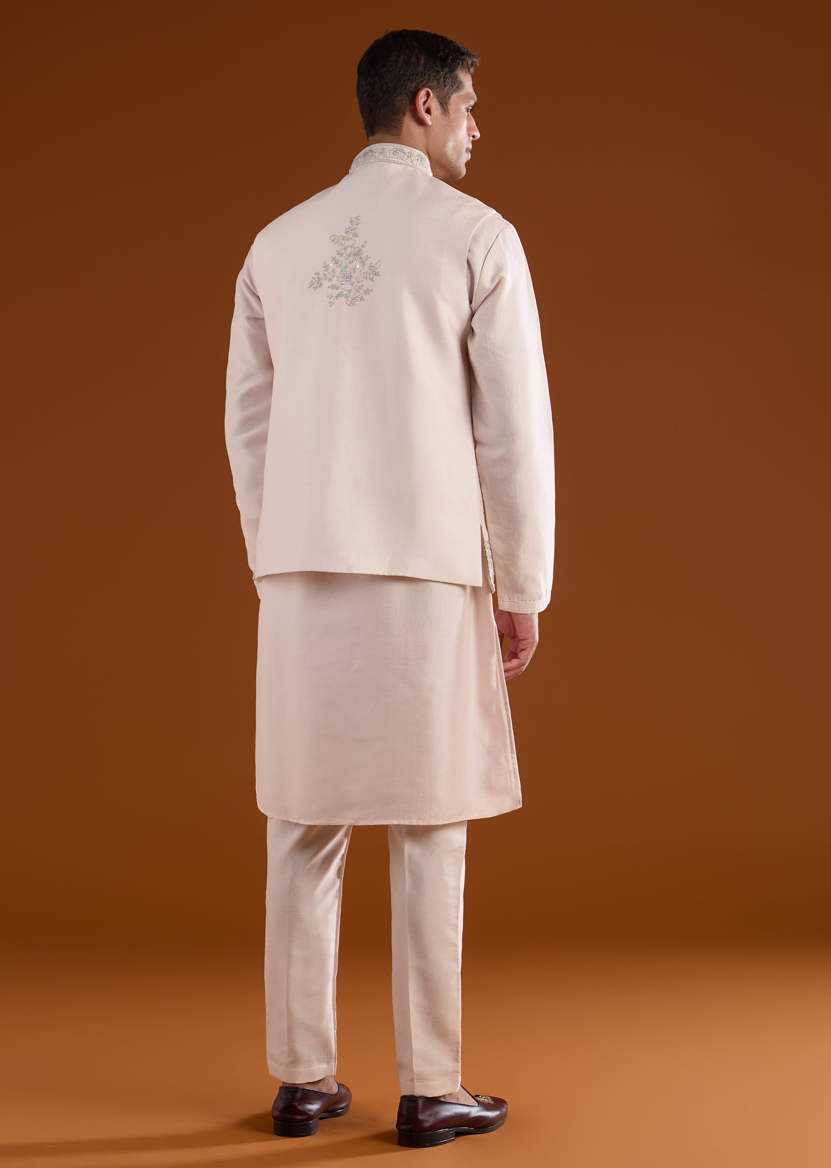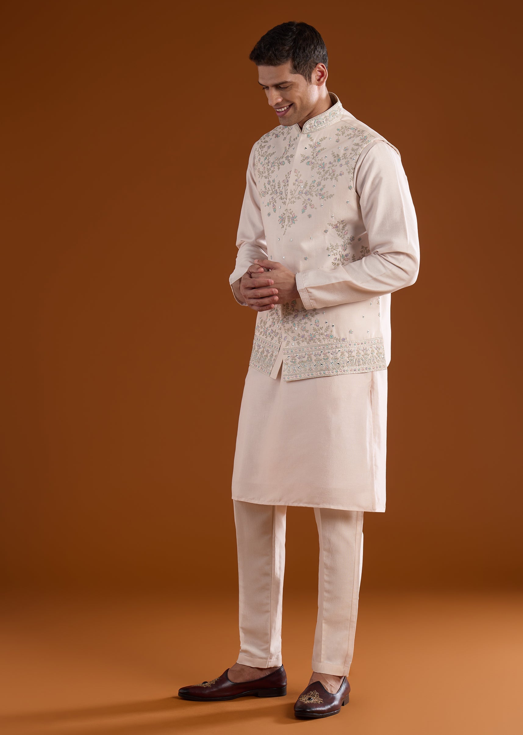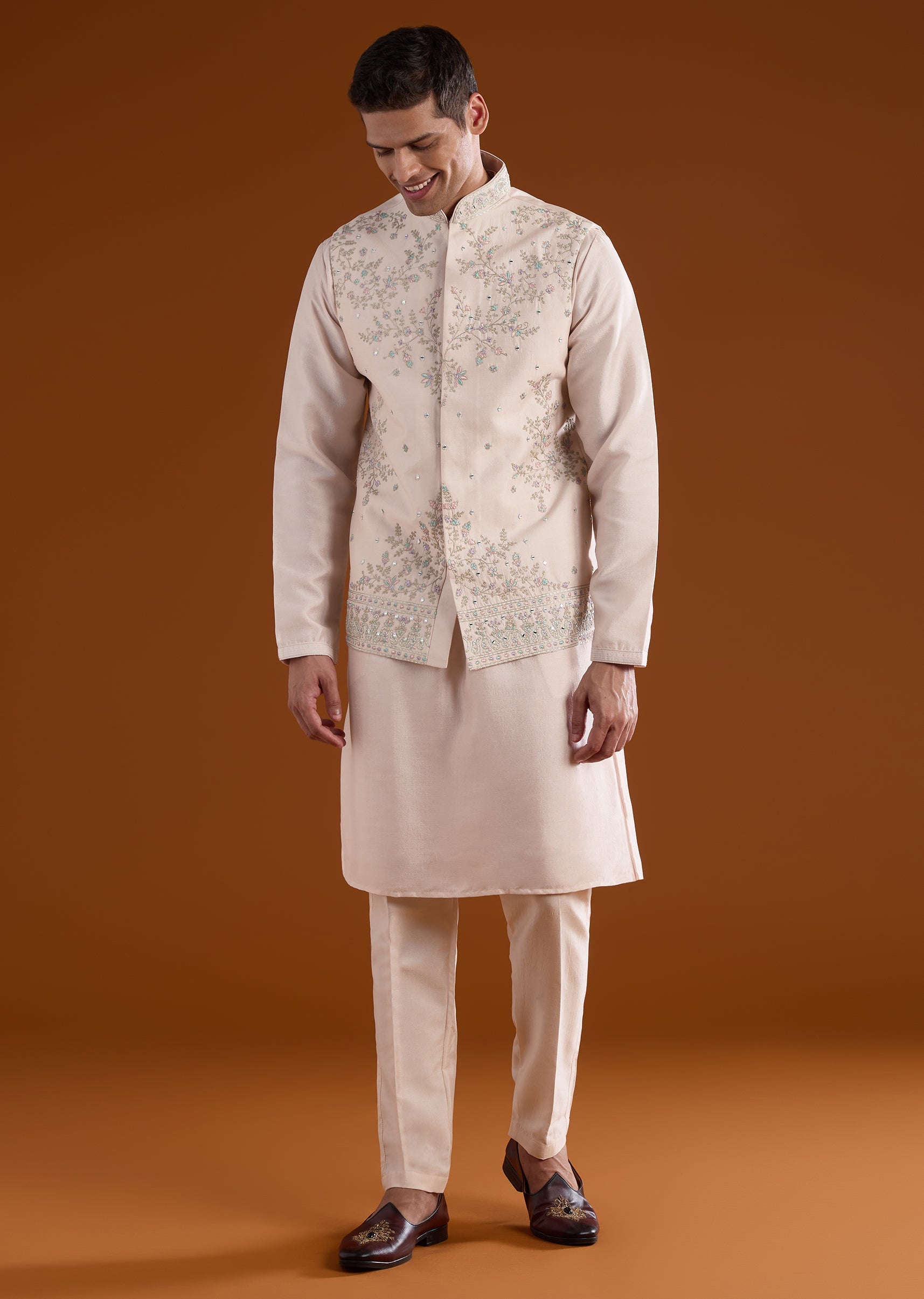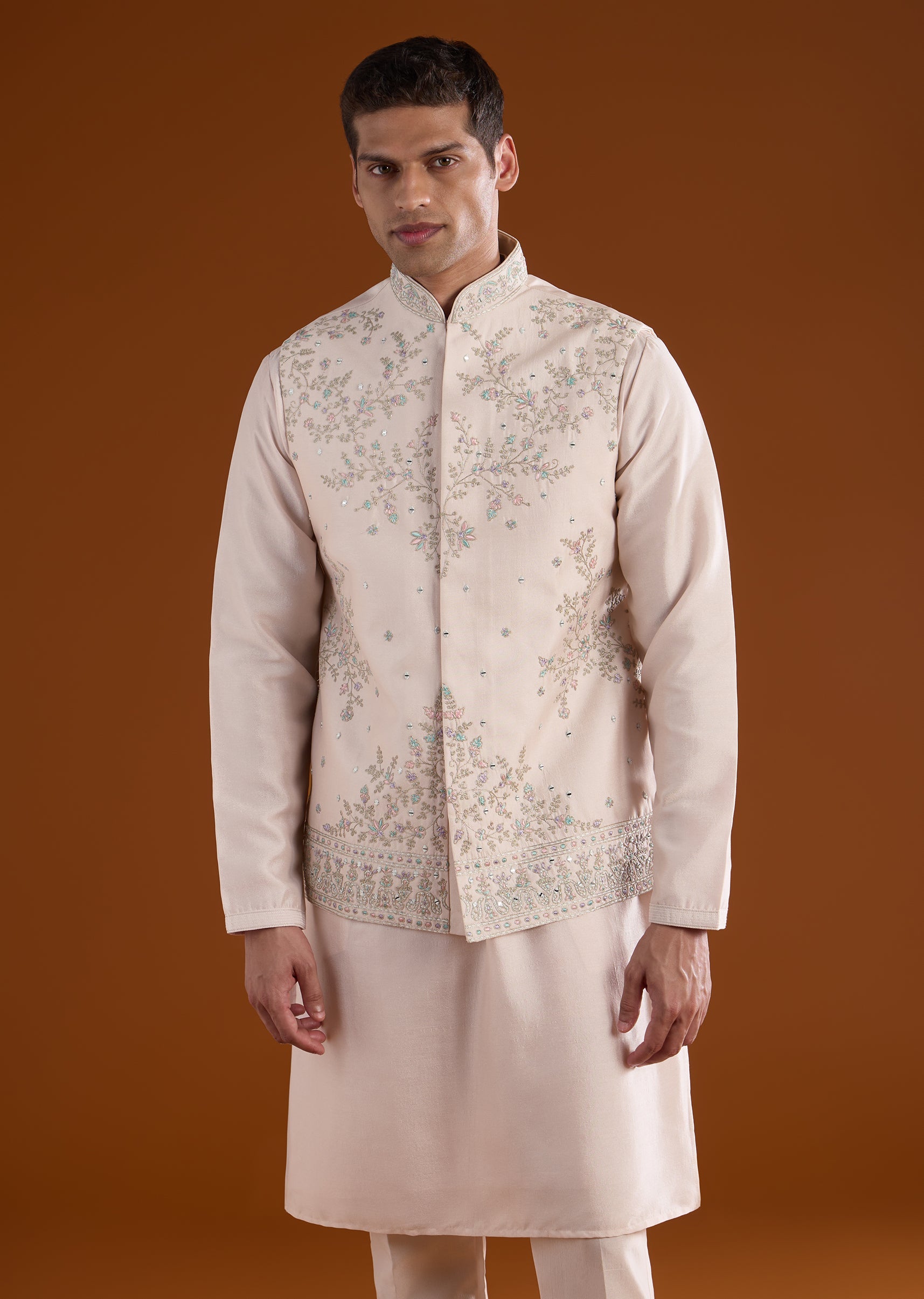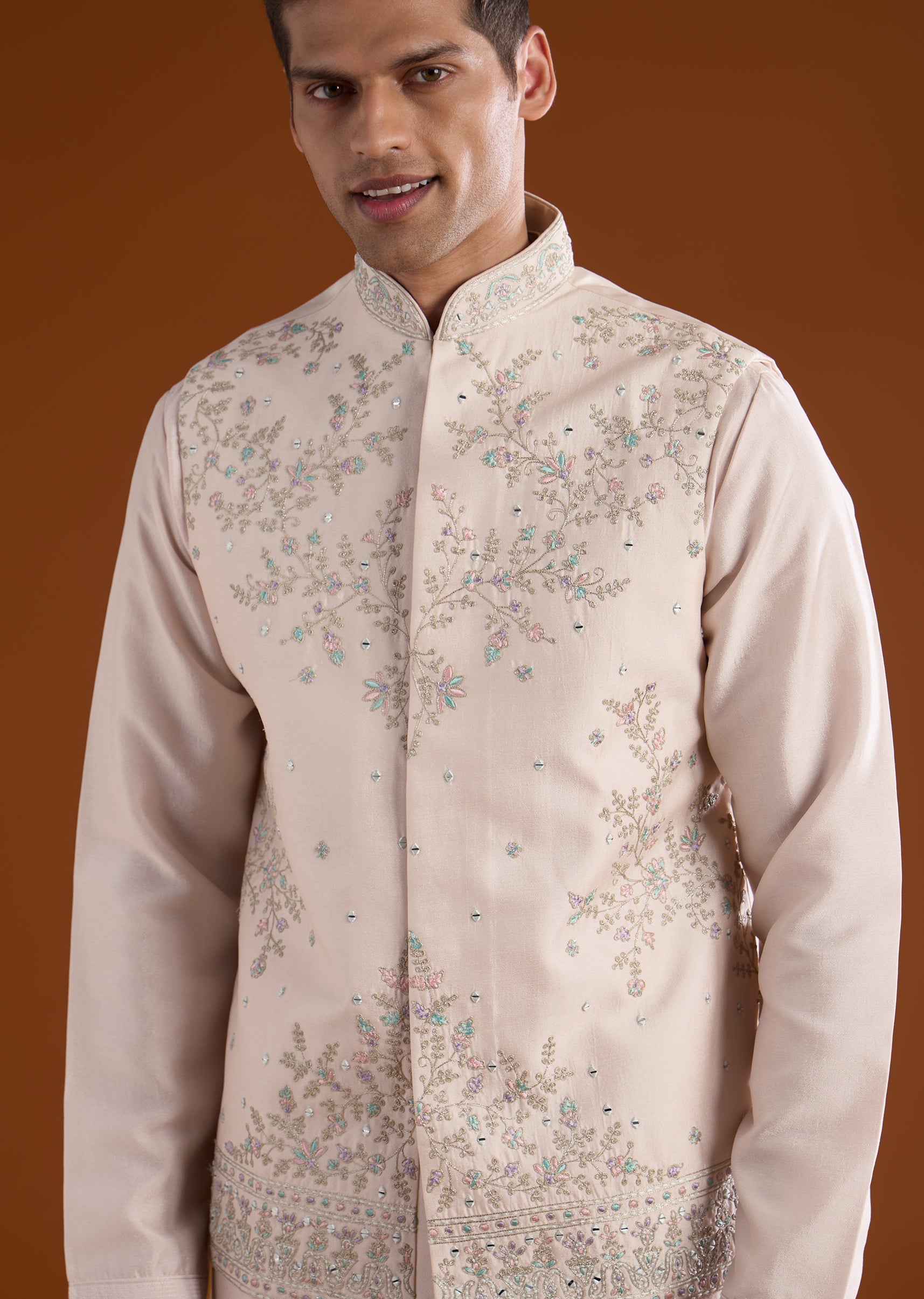 Peach Silk Mens Kurta Jacket Set With Thread Mirror And Motif Work