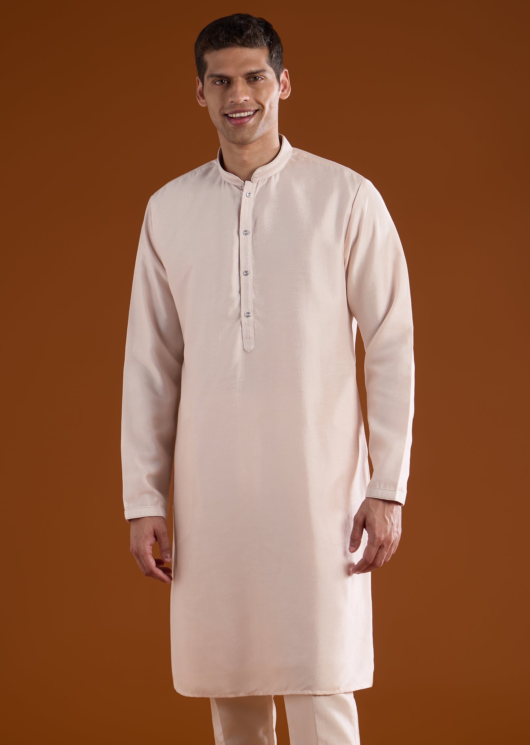 A soft peach silk kurta jacket set crafted for haldi, mehendi, and festive celebrations, perfect for wedding guests. Detailed with intricate thread, mirror, and motif work, it brings a delicate festive charm while maintaining a structured silhouette. The full sleeves and mandarin collar complete a polished and elegant traditional look. Awarded as the Most Trusted Brand, we're delivering styles you love, just as promised.