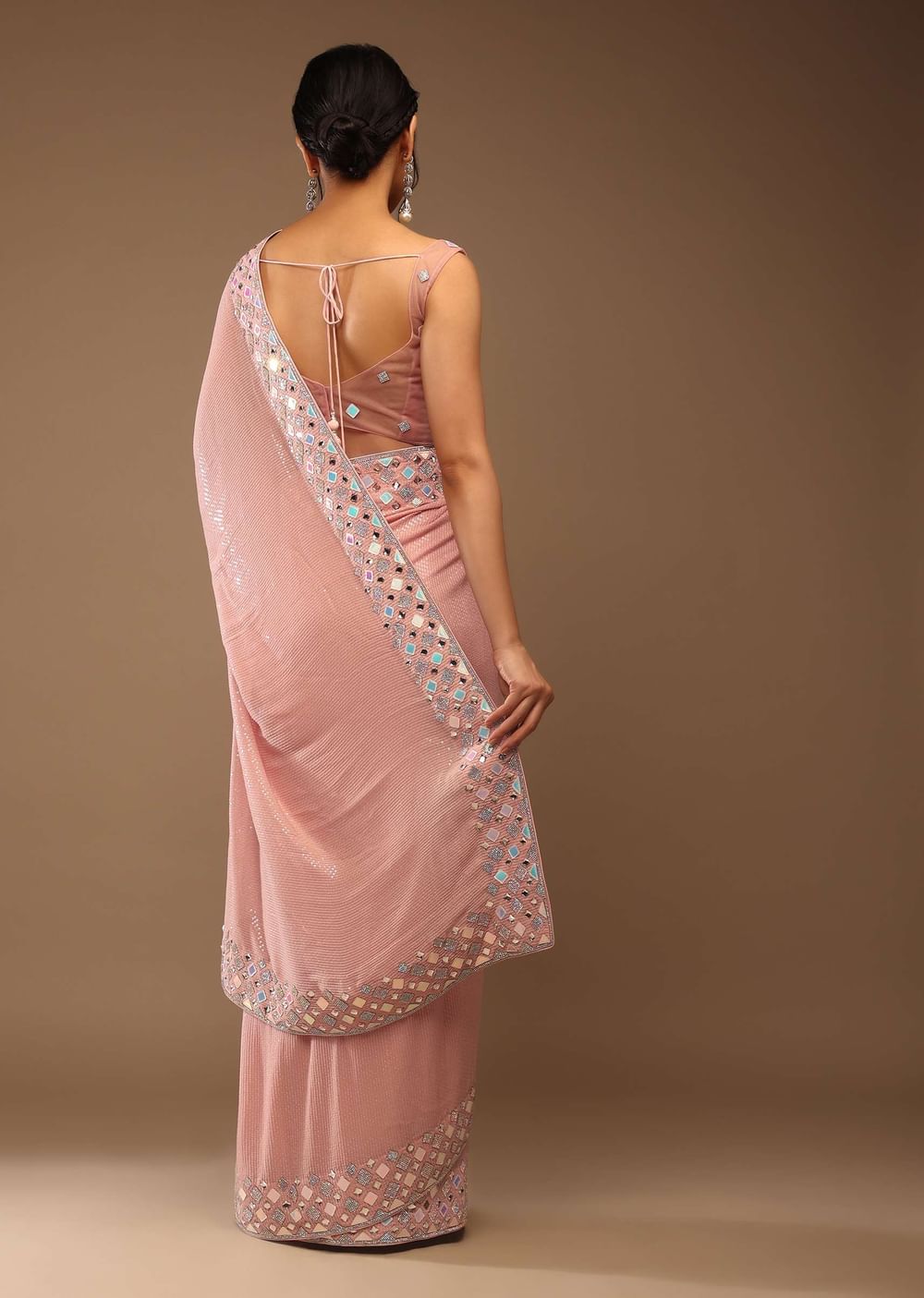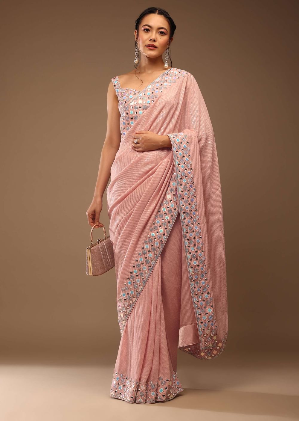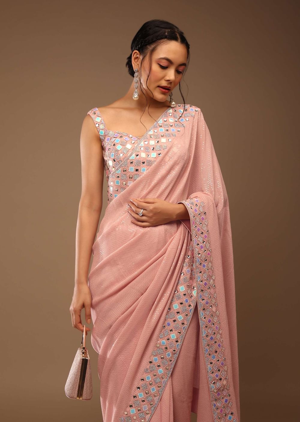 Peach Skin Saree With A Crop Top In Iridescent Foil Embellishment
