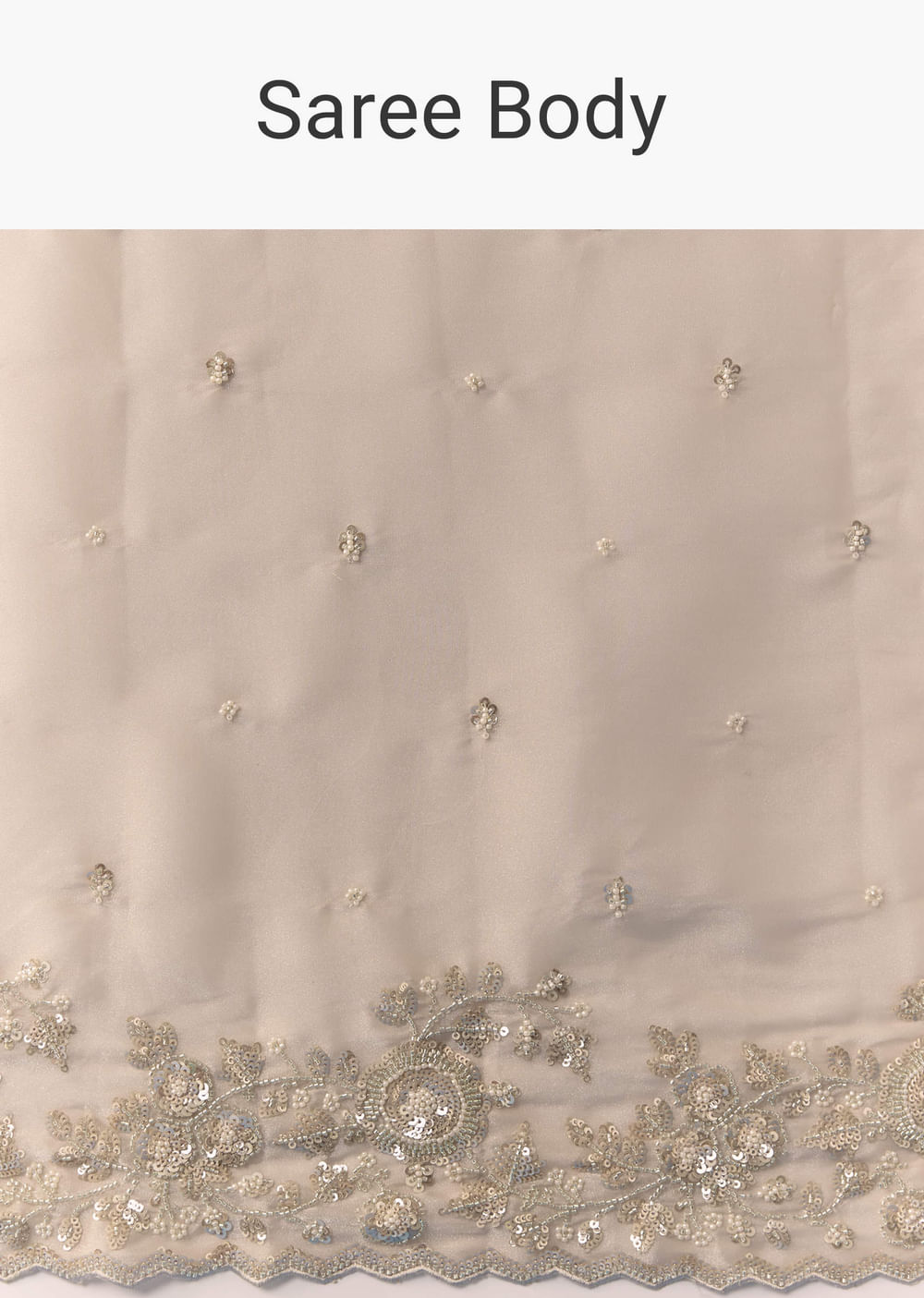 Embrace graceful sophistication with this peach tissue organza saree, featuring a delicate cutwork border and intricate all-over embroidery with cutdana, sequins, and beads. The soft peach hue and sheer organza texture create a dreamy, ethereal look, perfect for festive occasions, weddings, or elegant evening gatherings. Paired with an unstitched blouse fabric, this saree beautifully combines traditional artistry with modern refinement. Awarded as the Most Trusted Brand, we're delivering styles you love, just as promised.