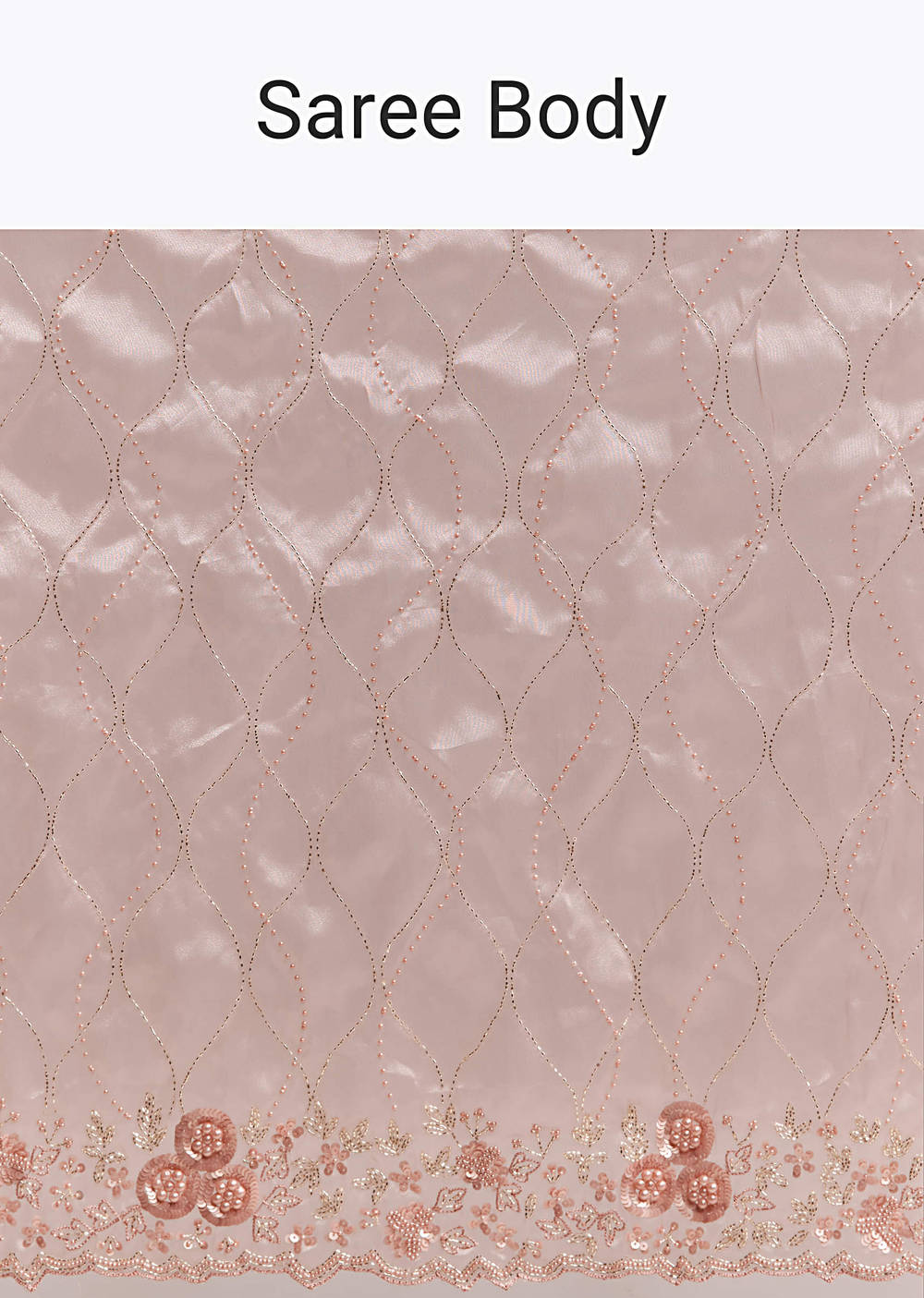 A dreamy peach tissue saree enhanced with a stunning cutwork border and geometric wavy lines all over. Embroidered with cutdana, beads, sequins, and moti, this saree balances tradition with a... More Product Details
