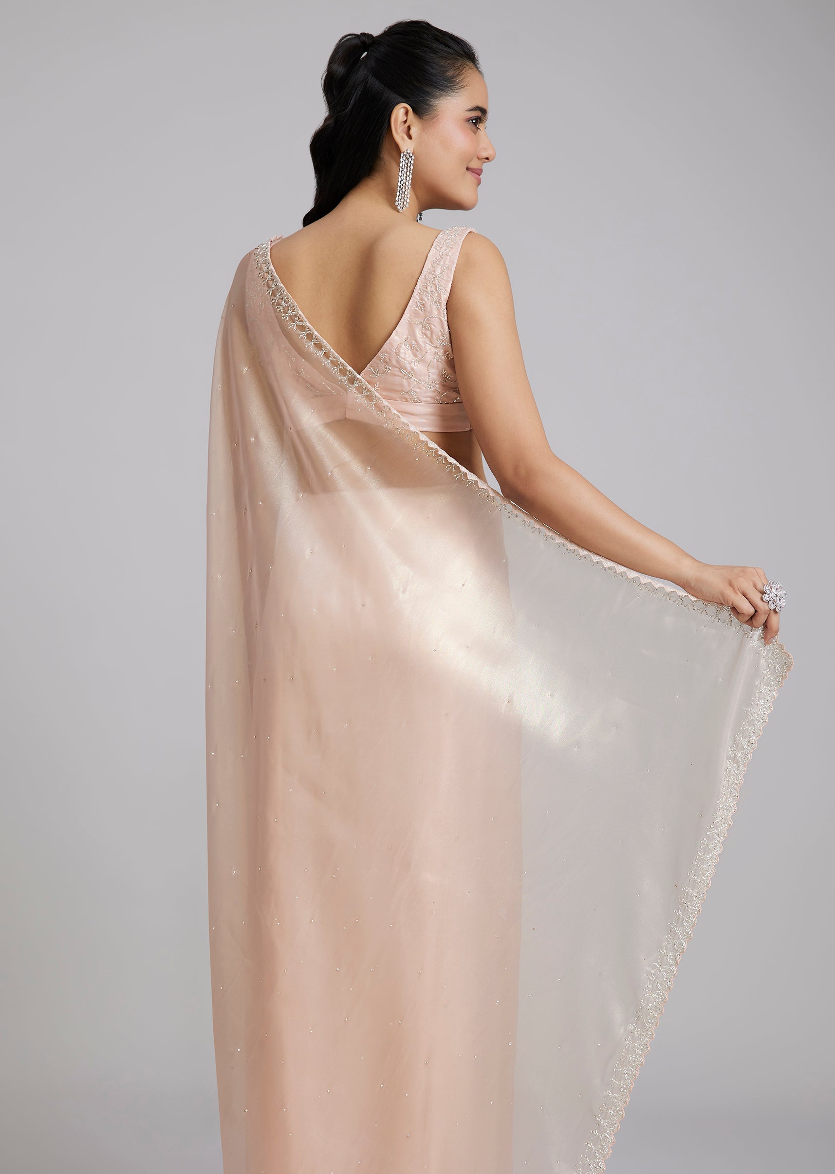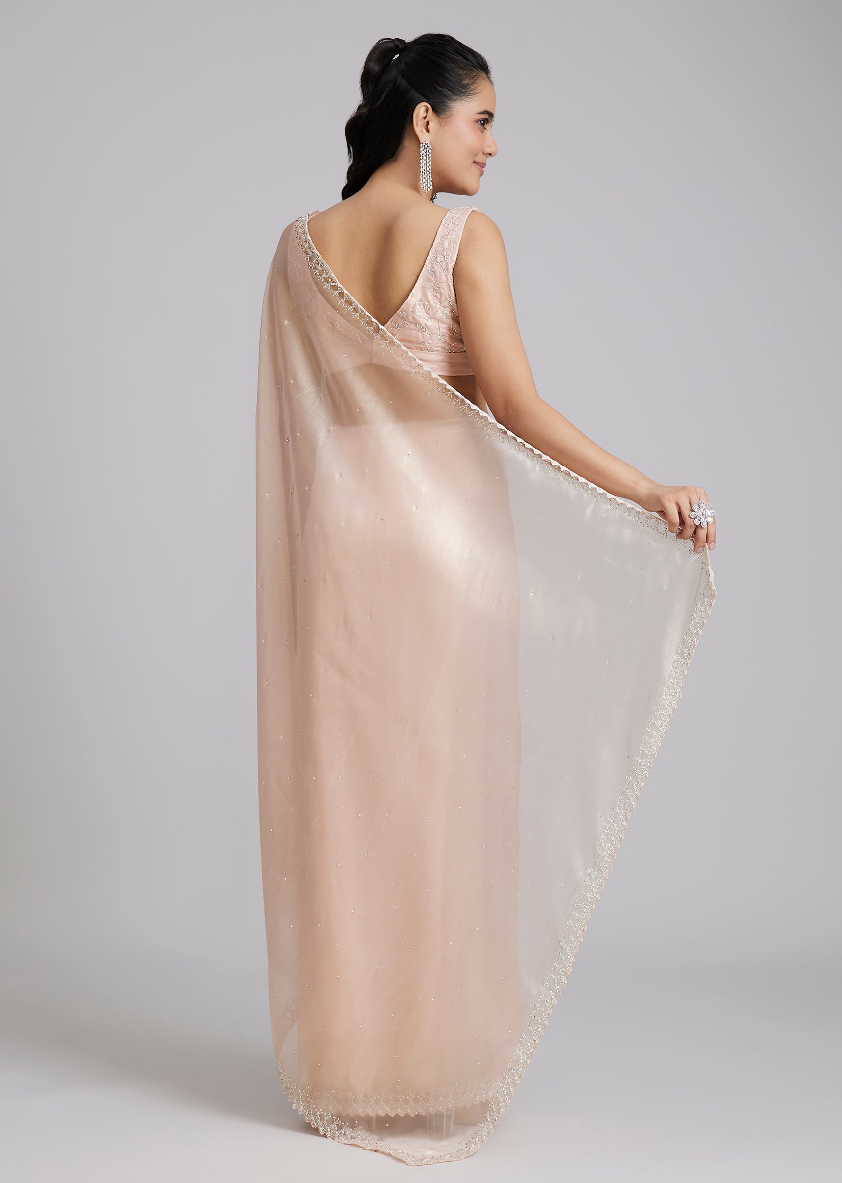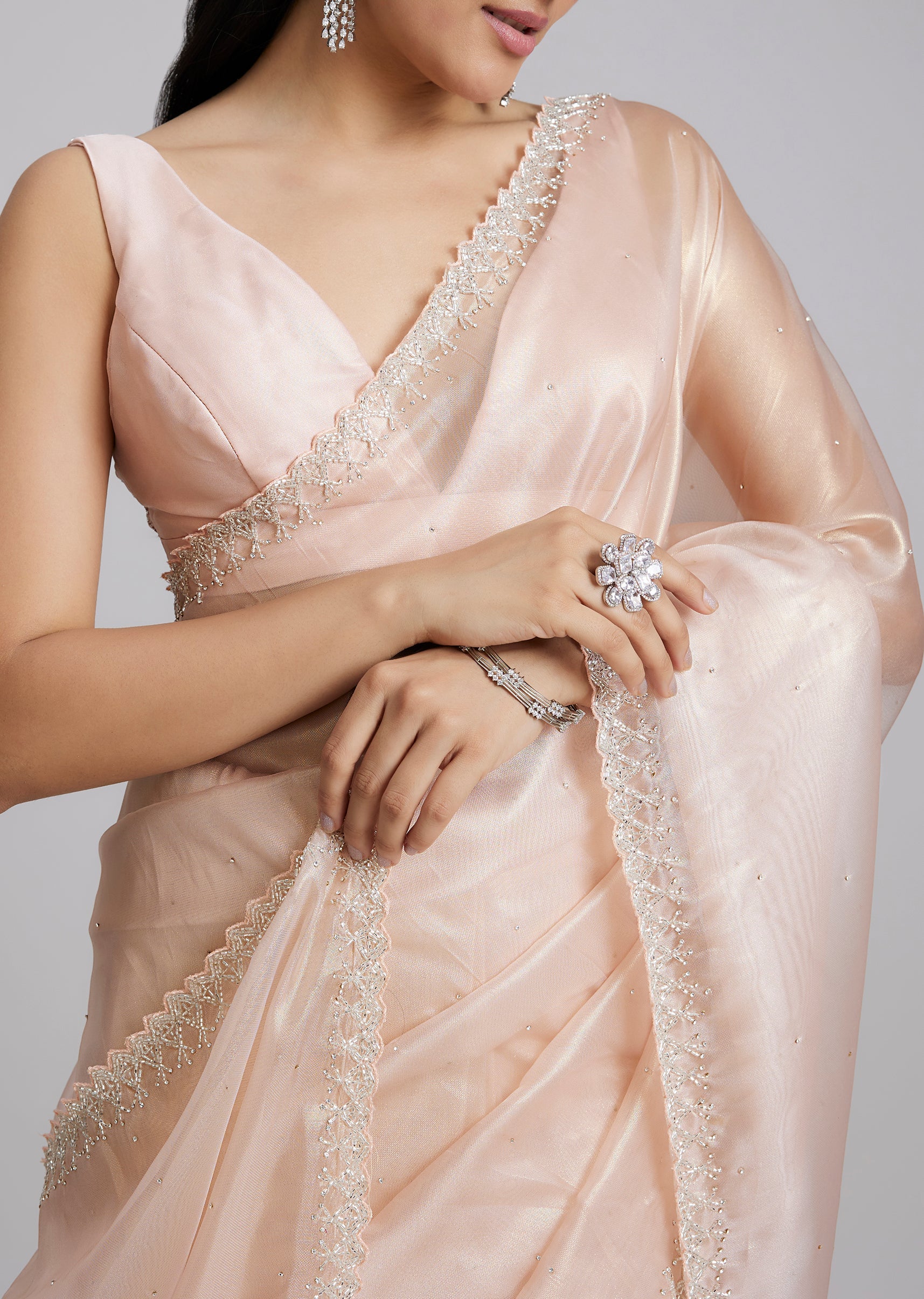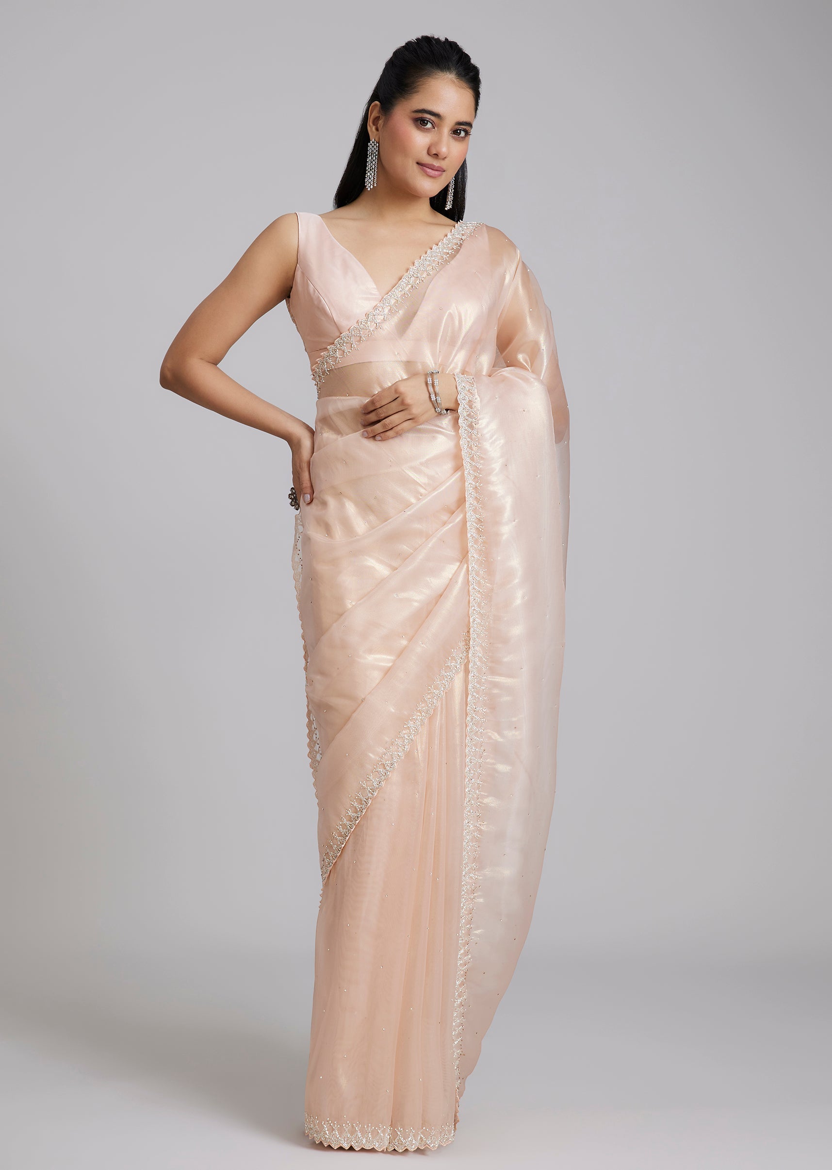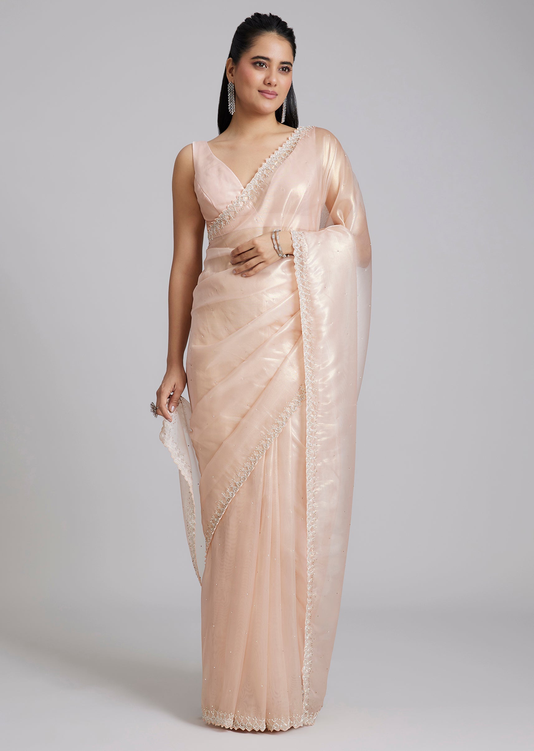 This peach tissue saree features a modern zigzag border embroidered with cut dana and finished with all-over stone embellishment for subtle sparkle. A minimal festive staple that’s easy to dress up. Awarded as the Most Trusted Brand, we're delivering styles you love, just as promised.