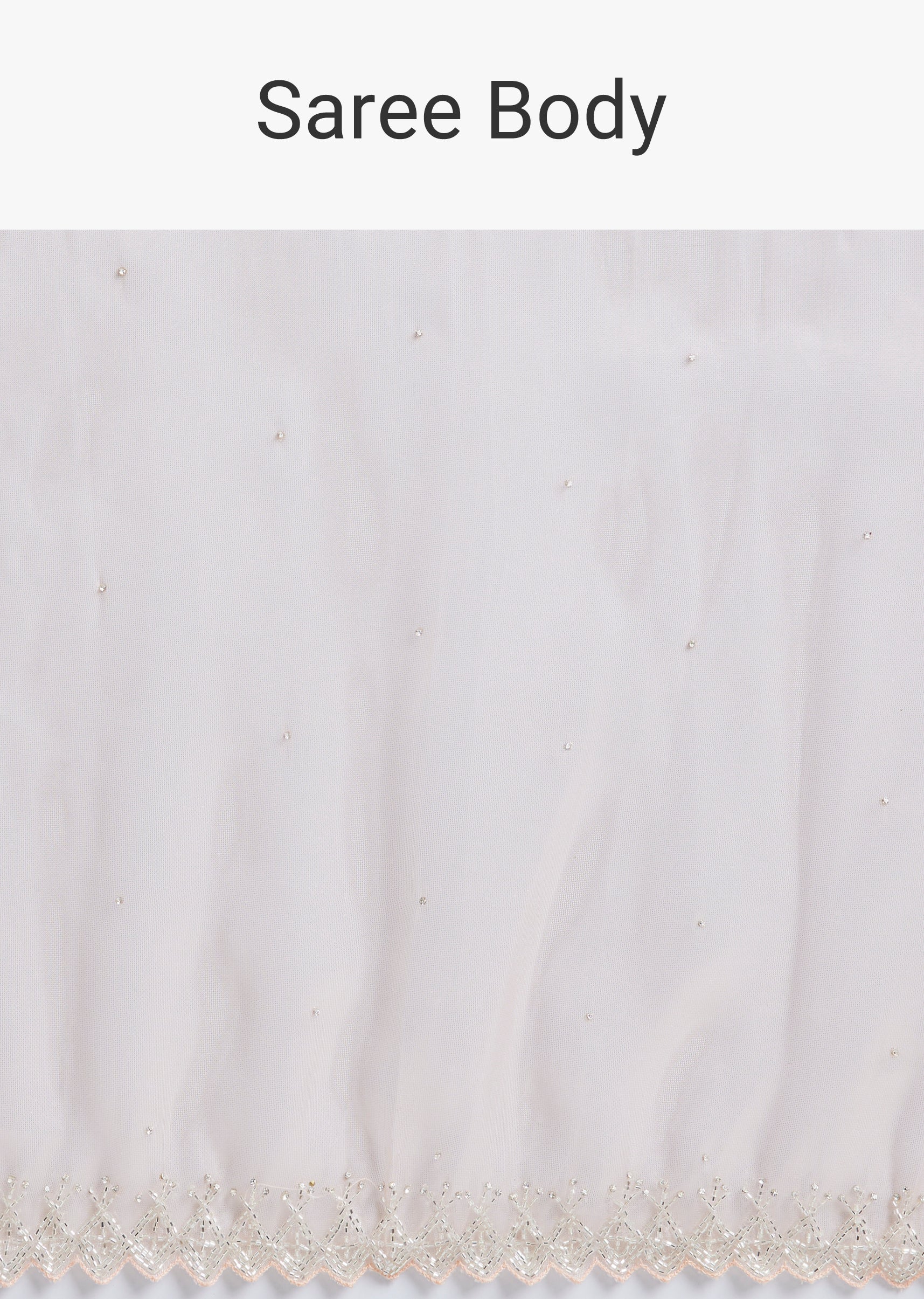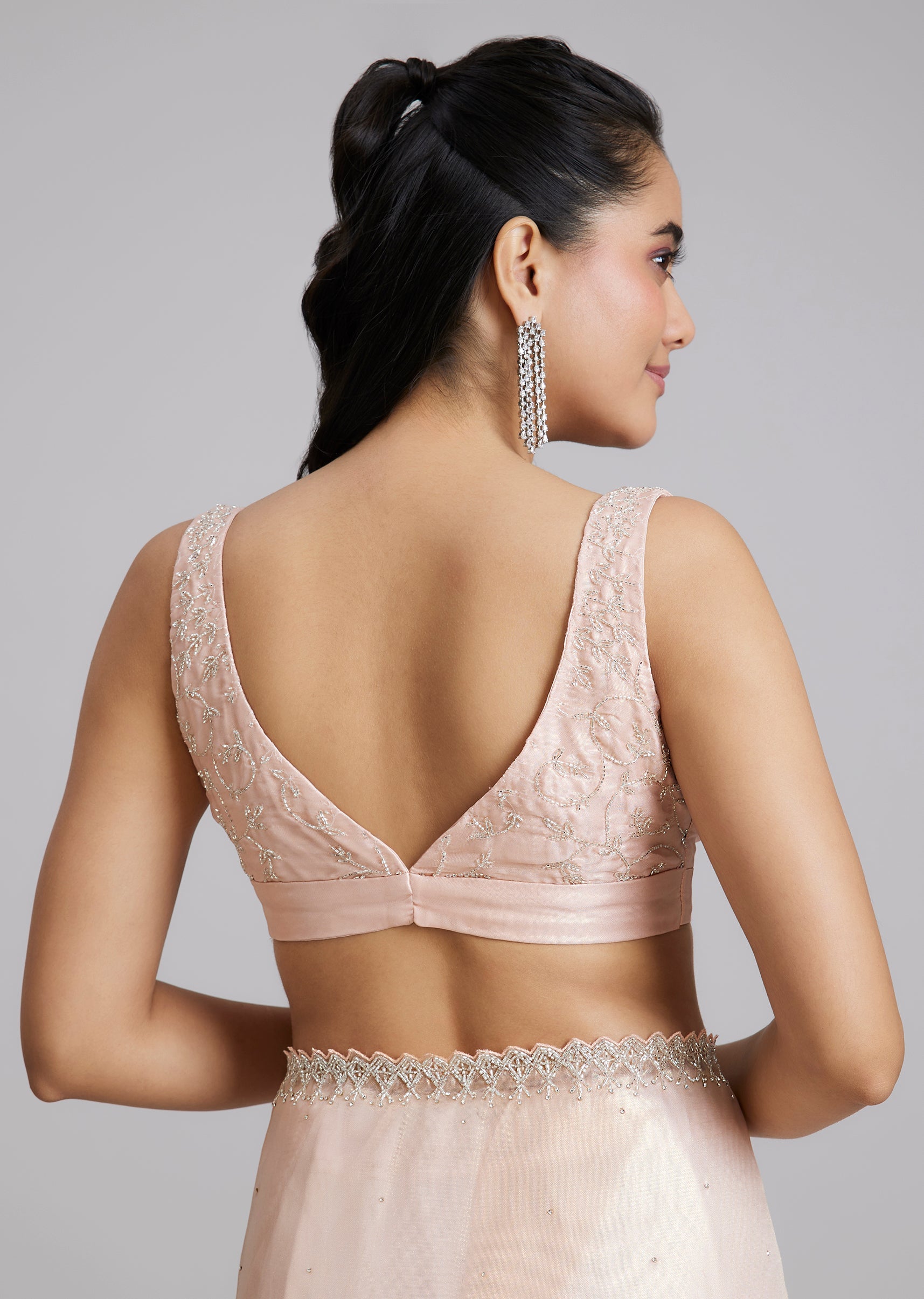 This peach tissue saree features a modern zigzag border embroidered with cut dana and finished with all-over stone embellishment for subtle sparkle. A minimal festive staple that’s easy to dress... More Product Details