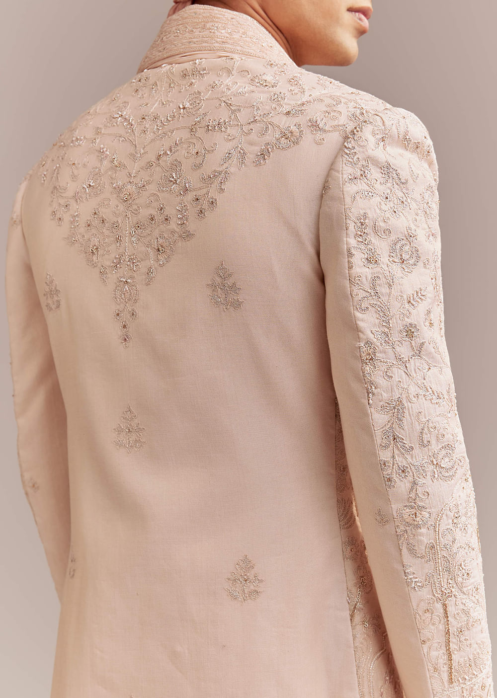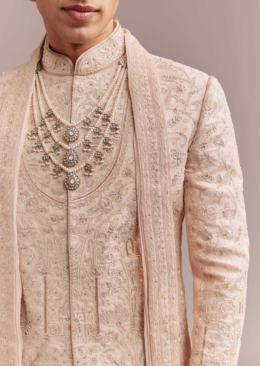 Peach Tissue Sherwani For Groom With Tonal Embroidery