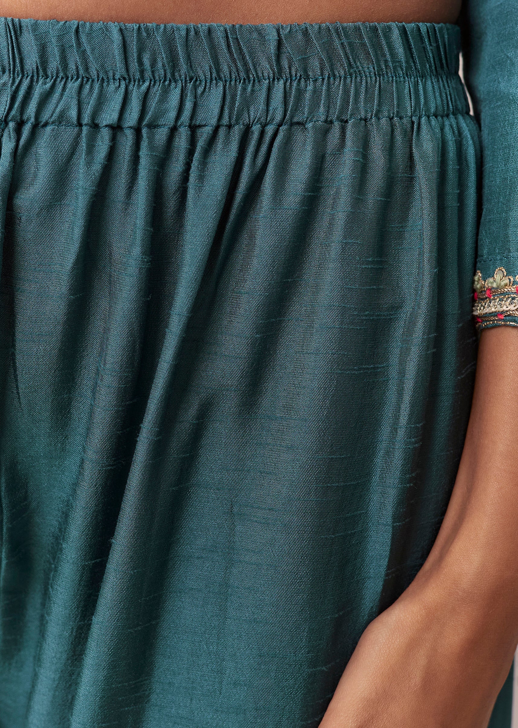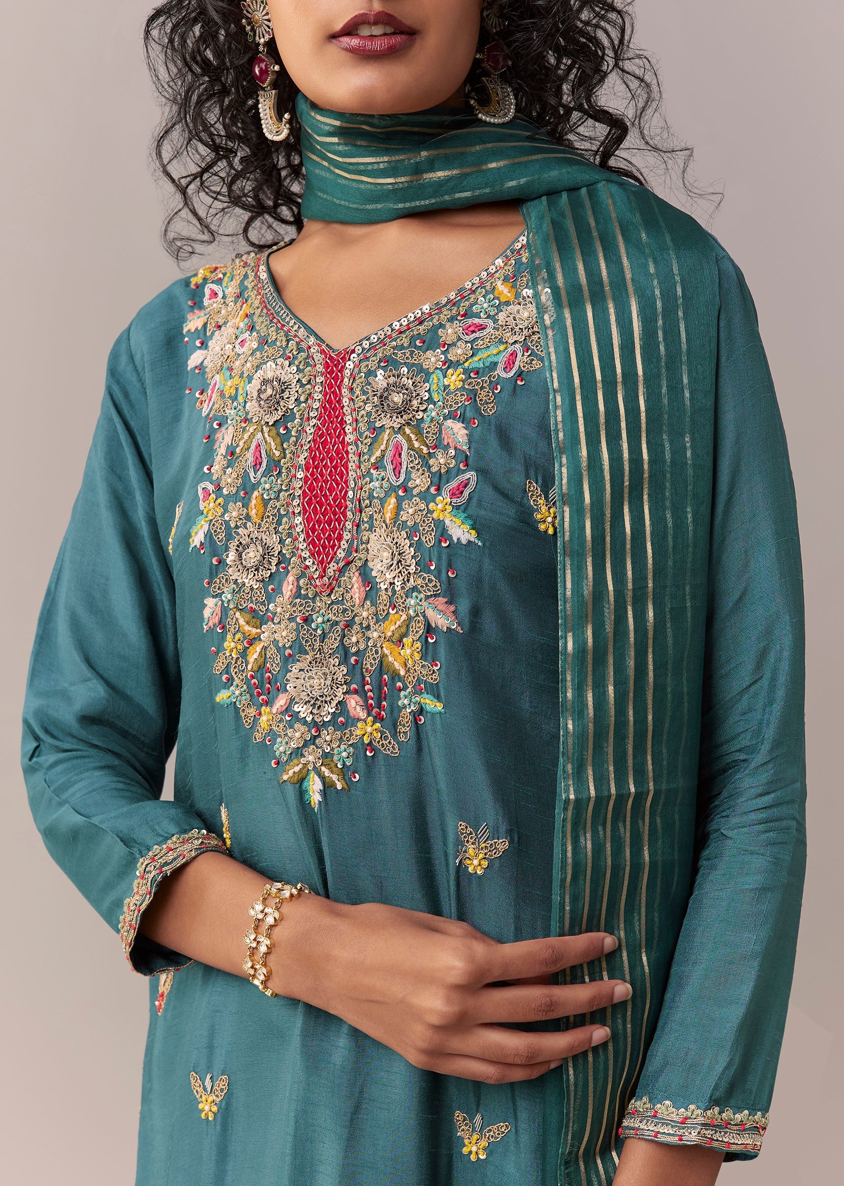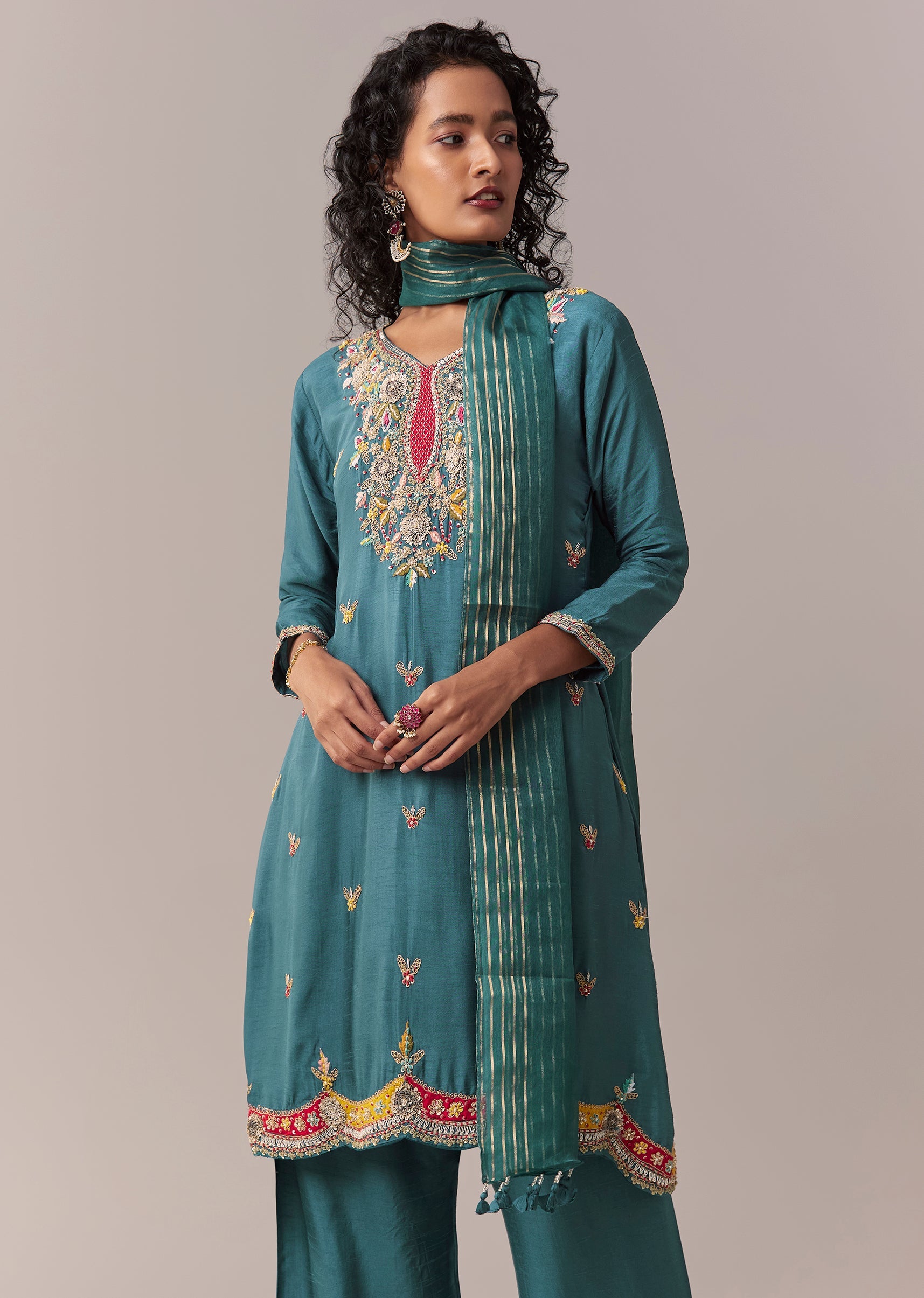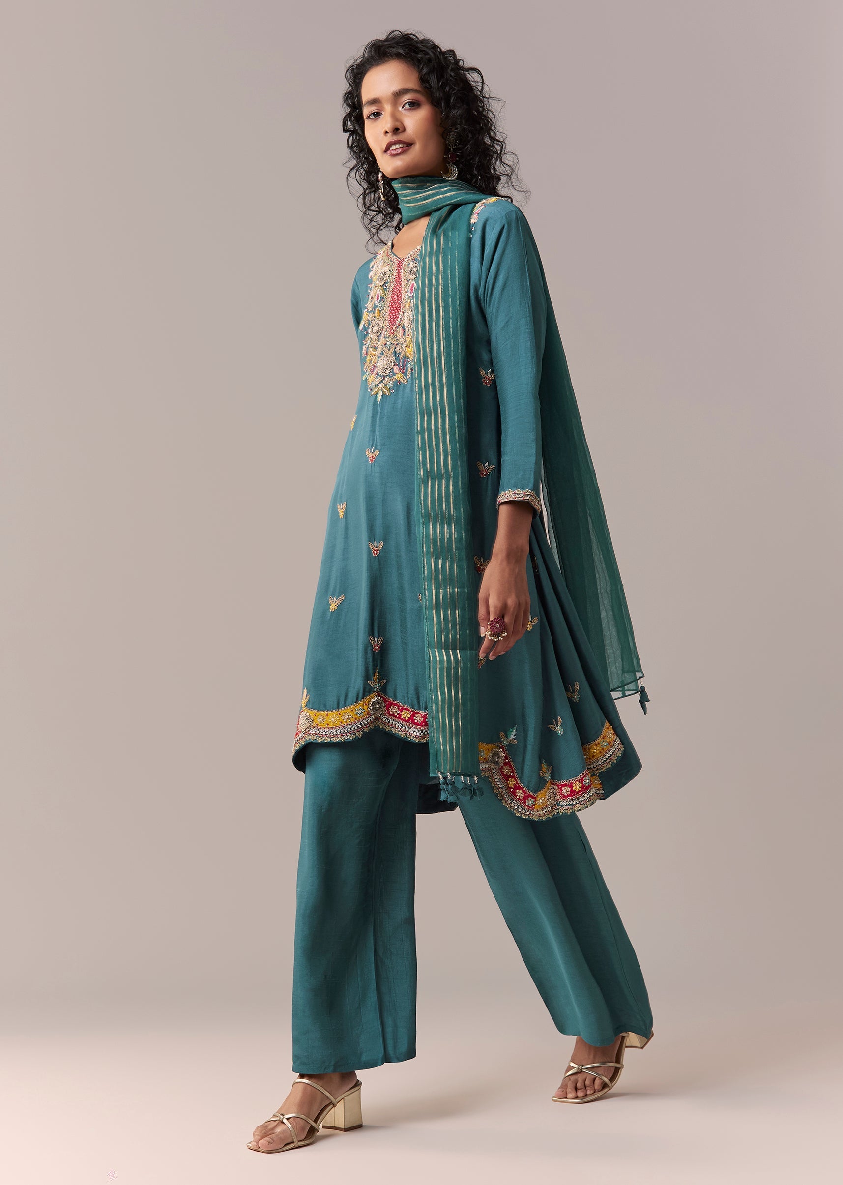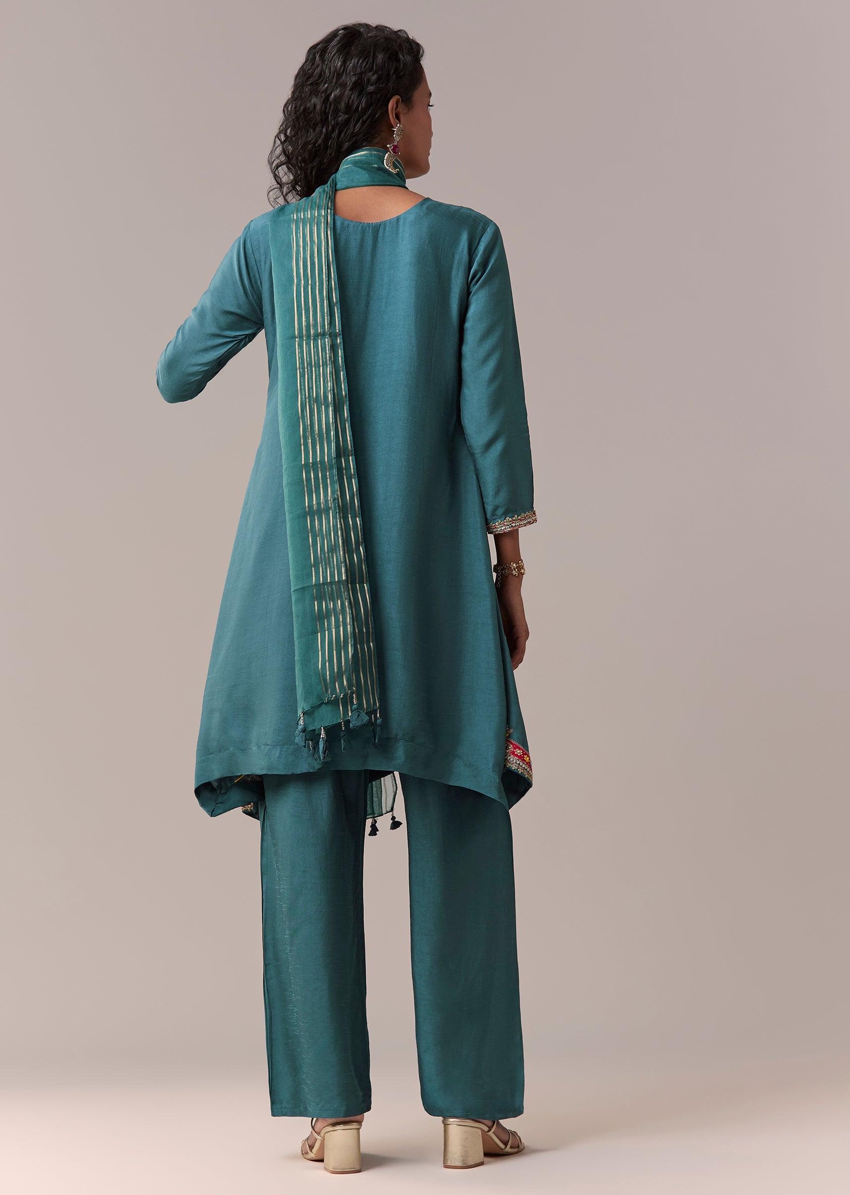 Peacock Blue Asymmetric Short Anarkali Set With Dupatta