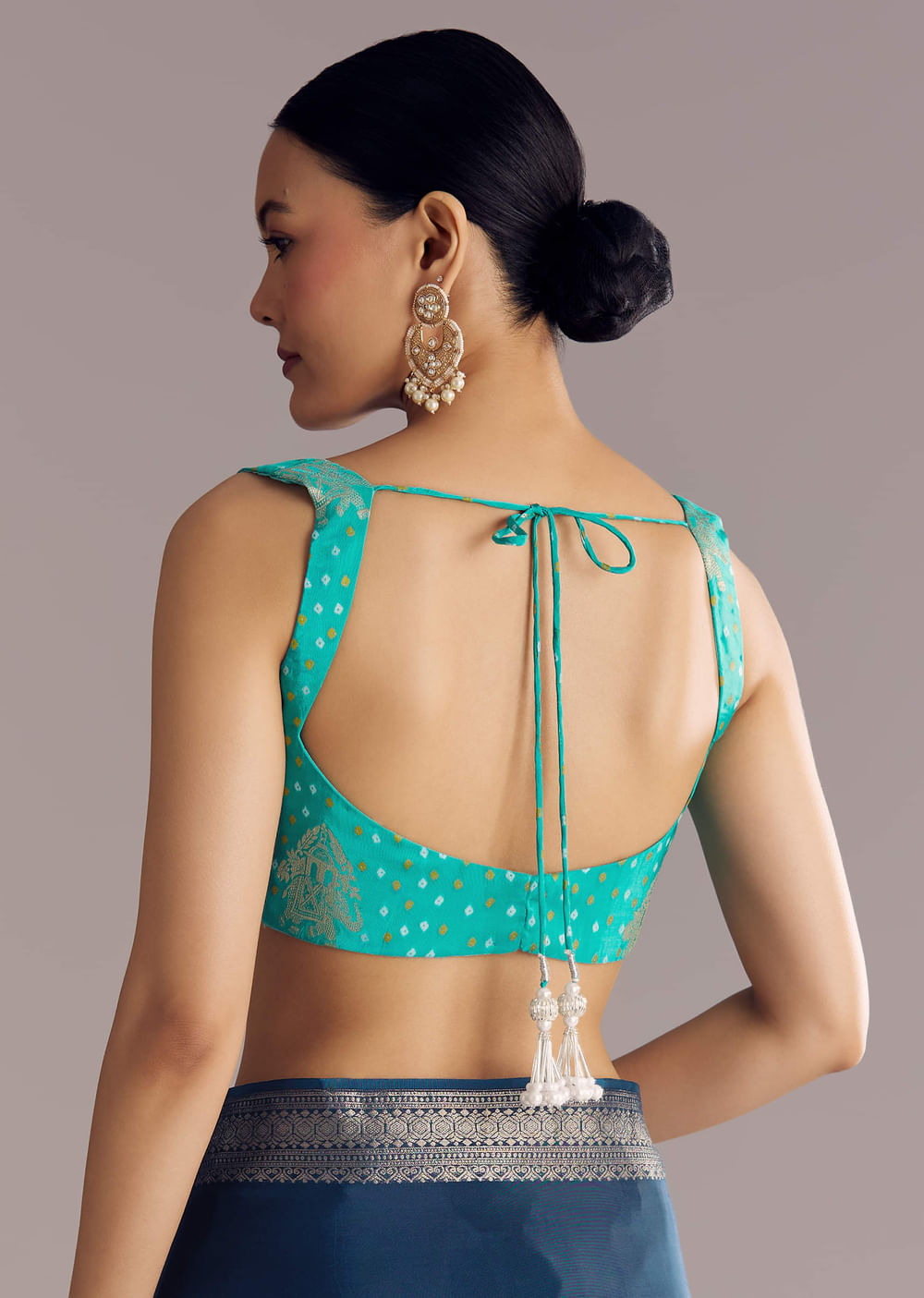 Graceful and rich in tone, this peacock blue Dola silk saree is an ode to quiet opulence. Designed with a delicately woven border and pallu, it carries the sheen and... More Product Details