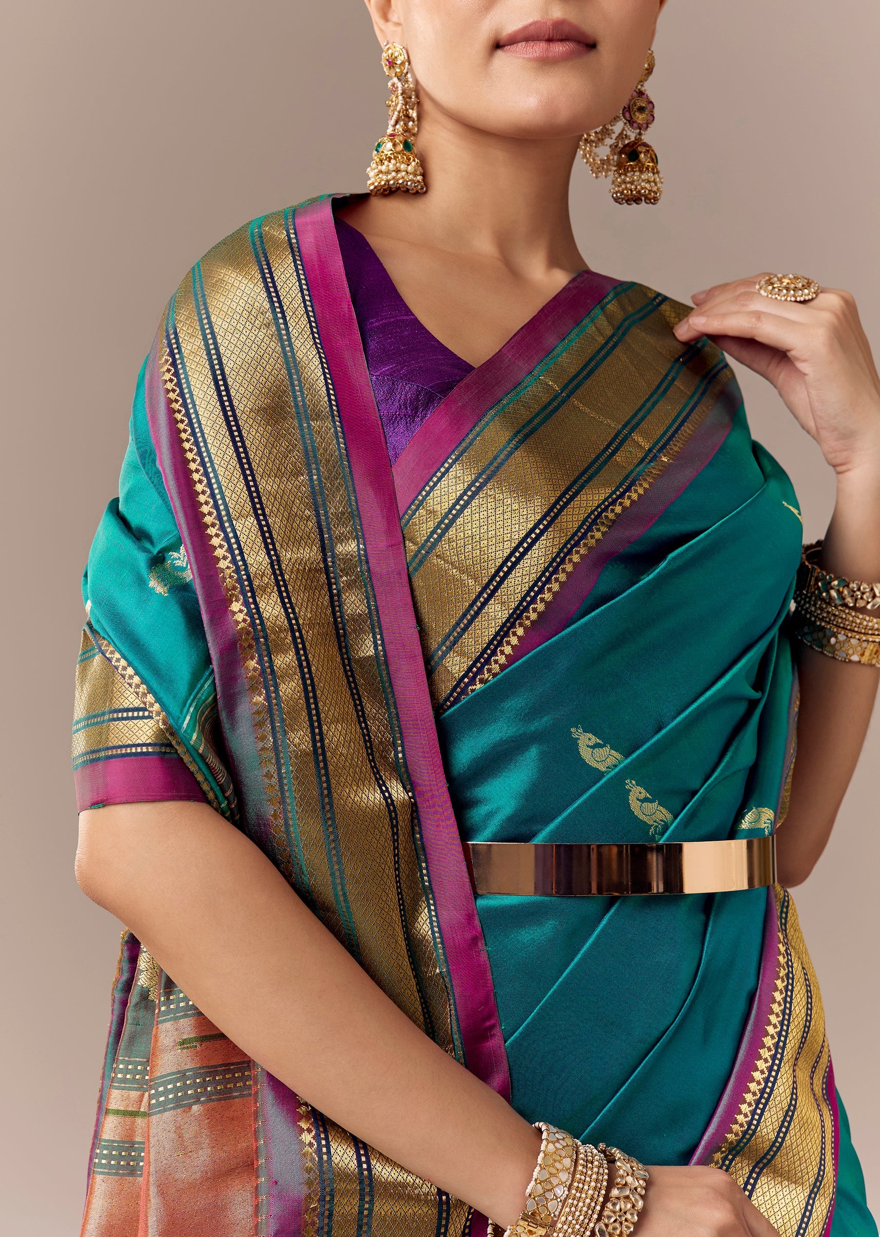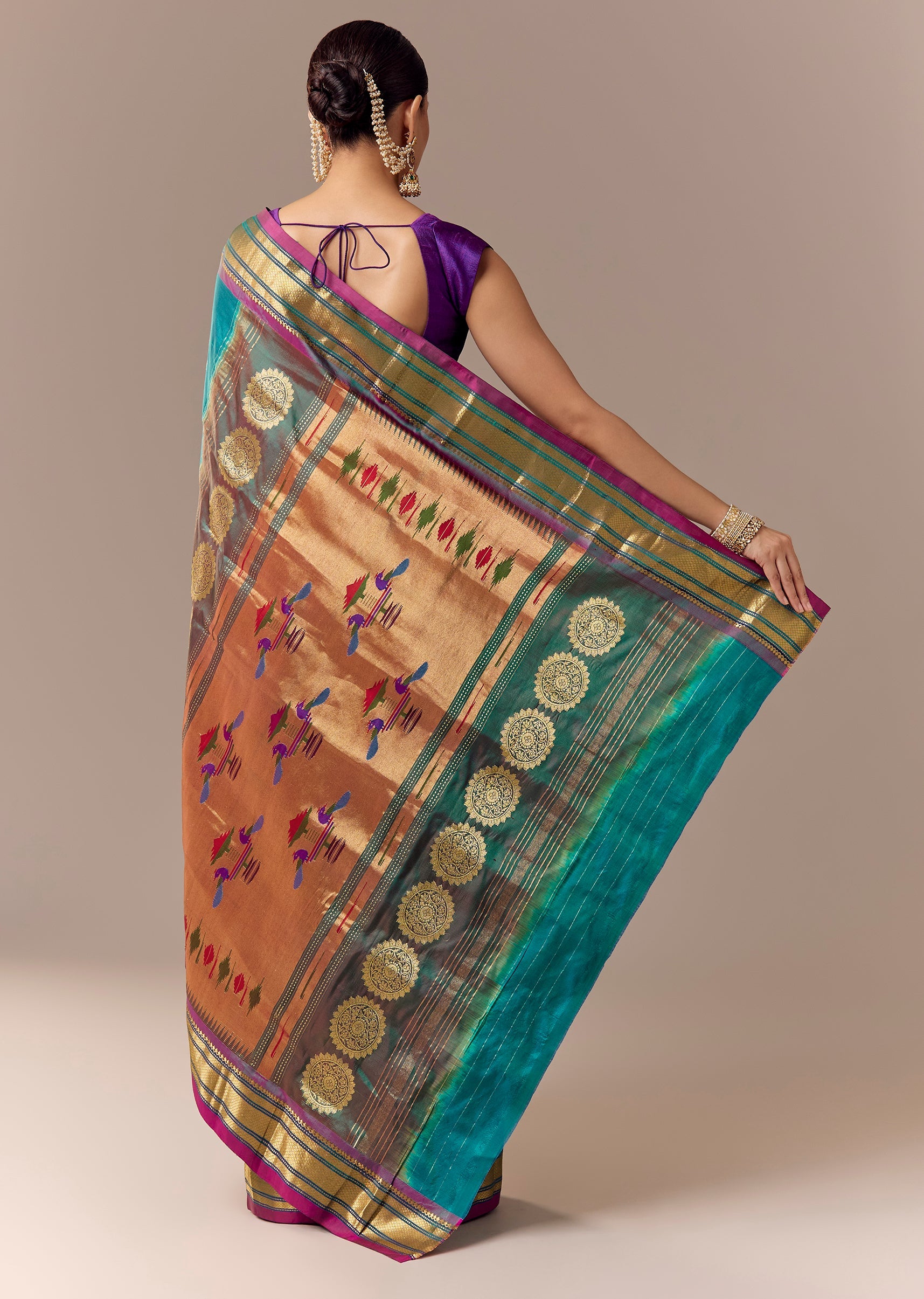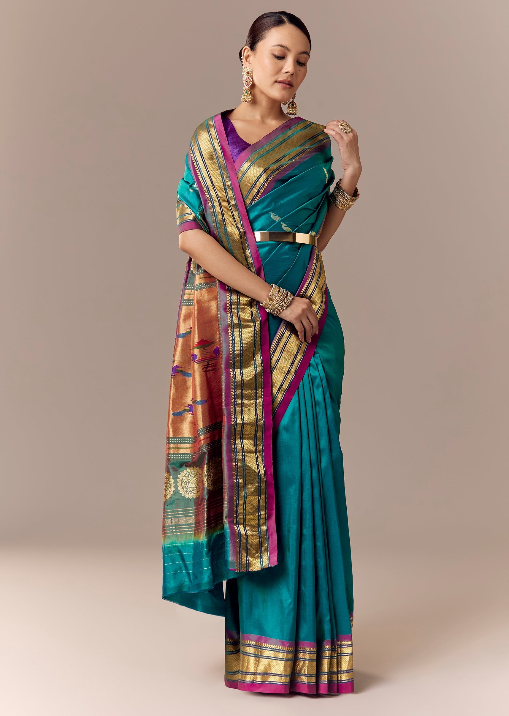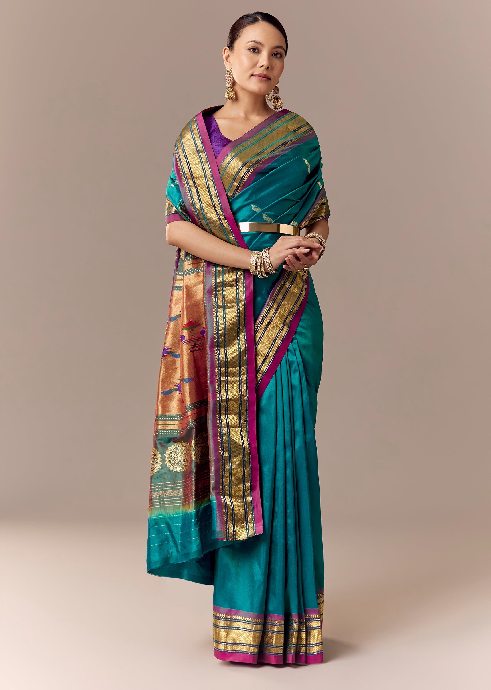 Fit Tips:Keep pleats aligned and tight—Paithani looks sharp with a structured drape.