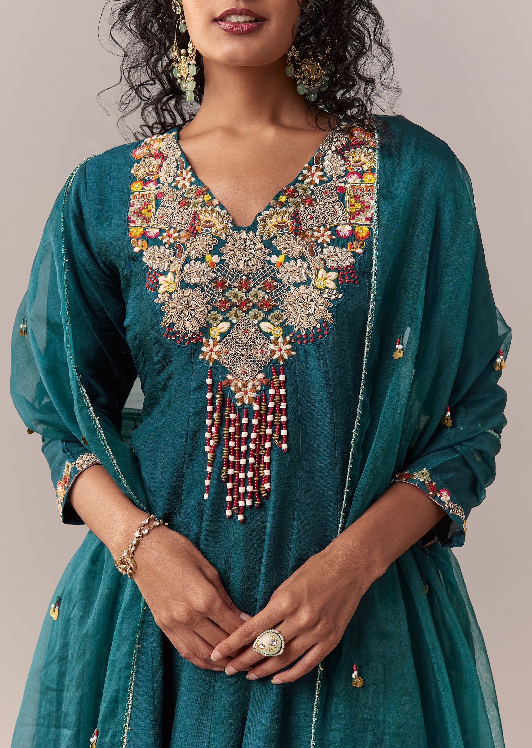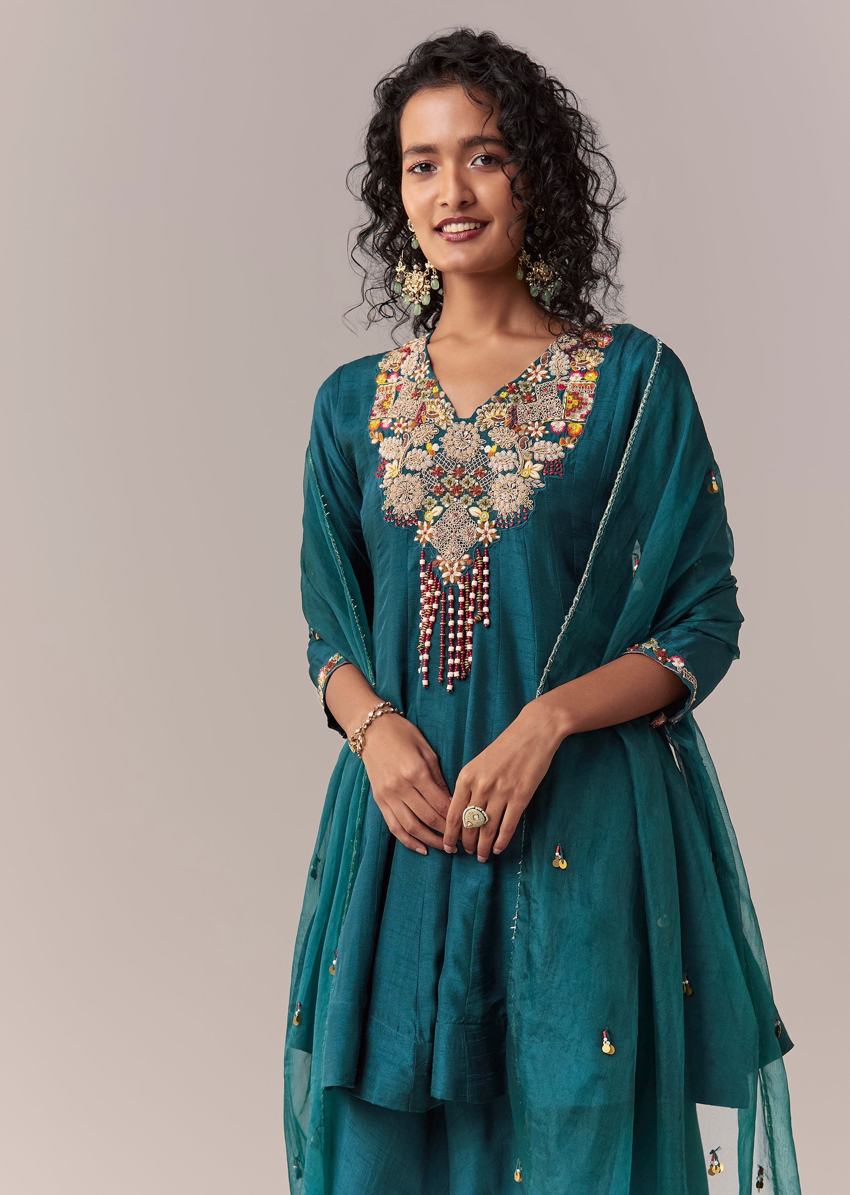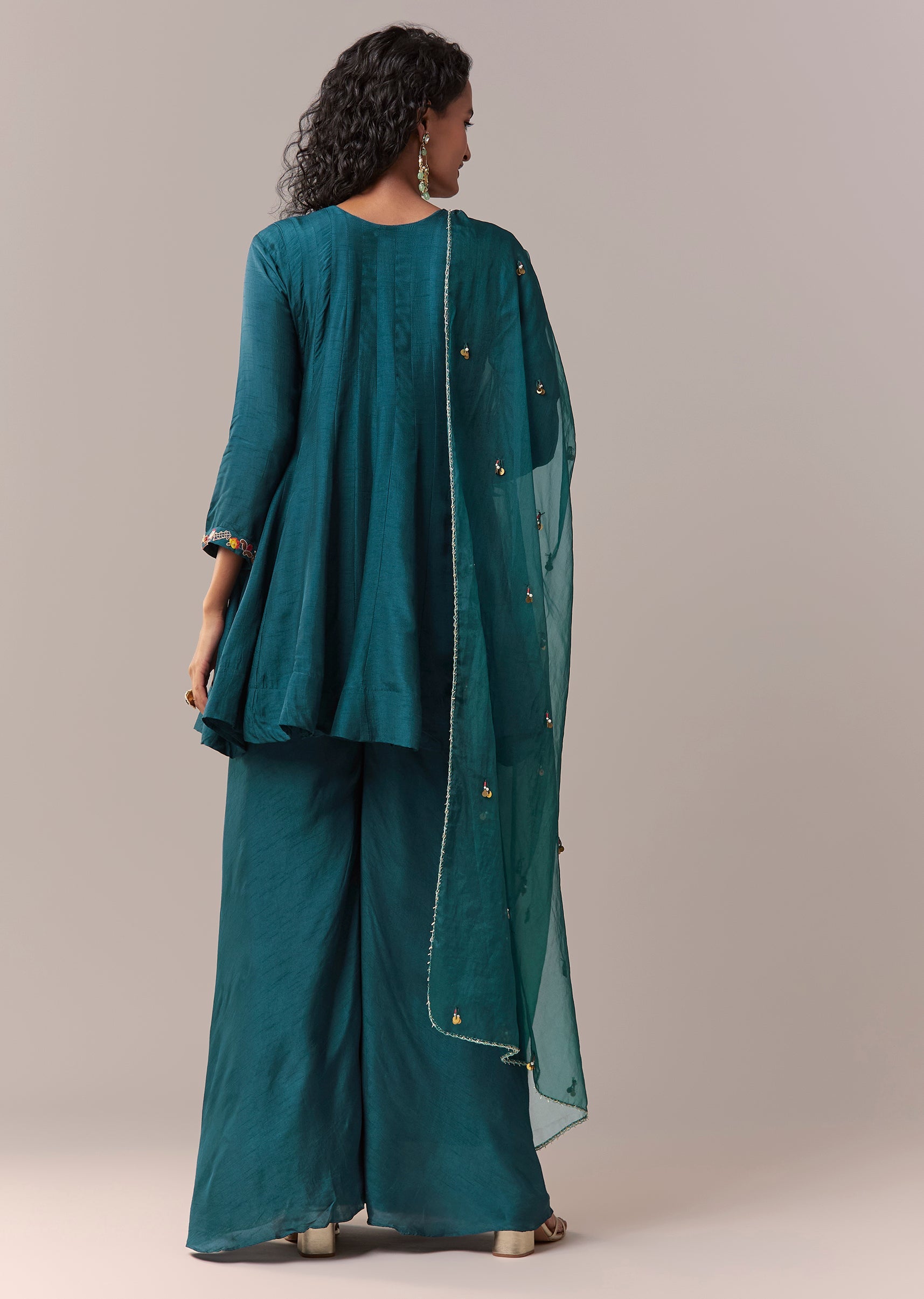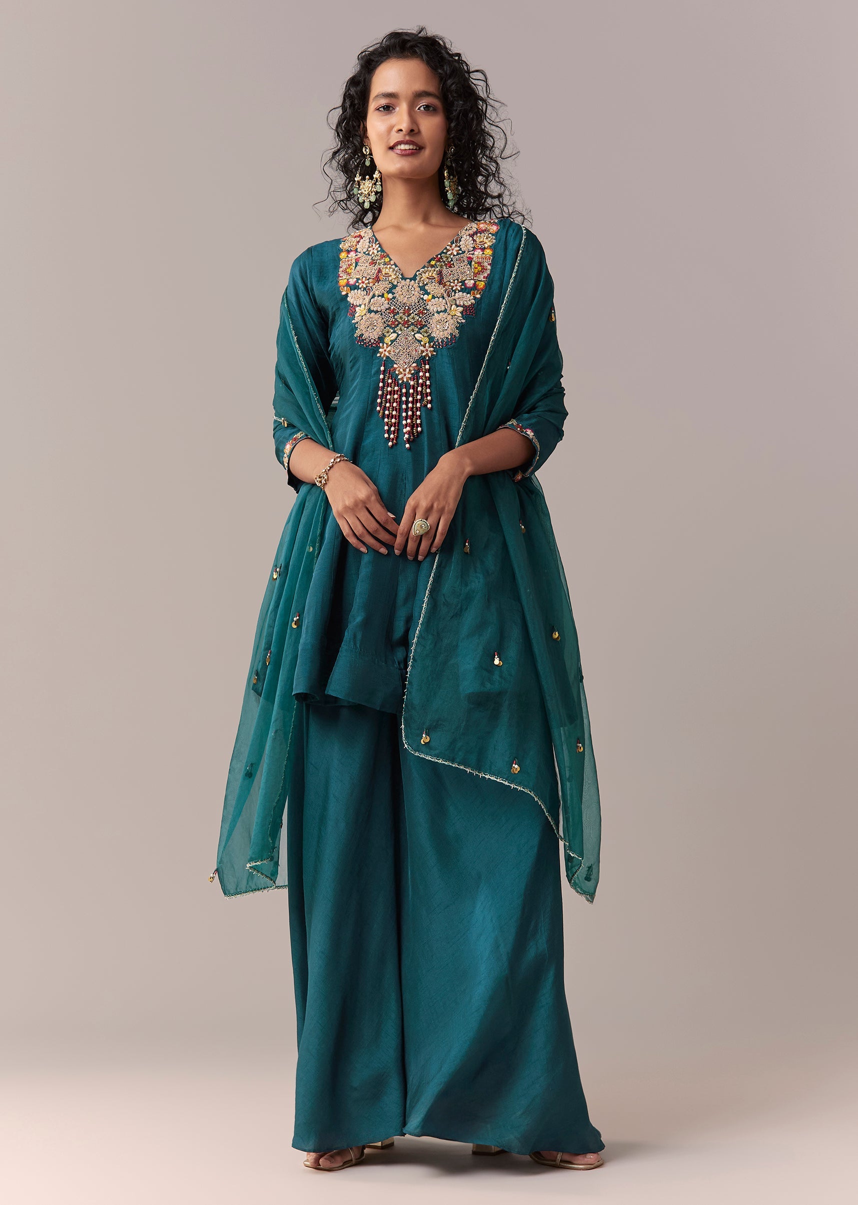 Peacock Blue Zardosi & Thread Palazzo Set With Dupatta