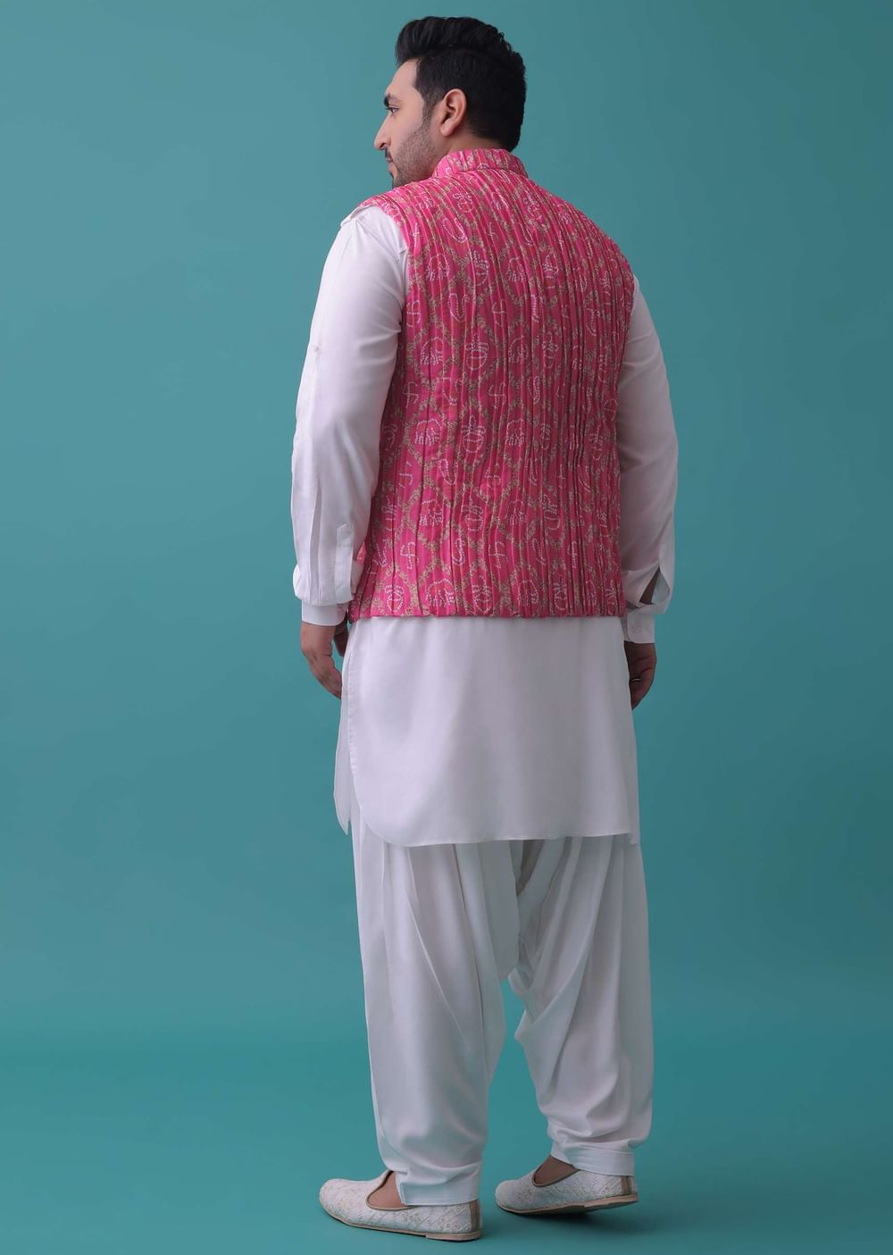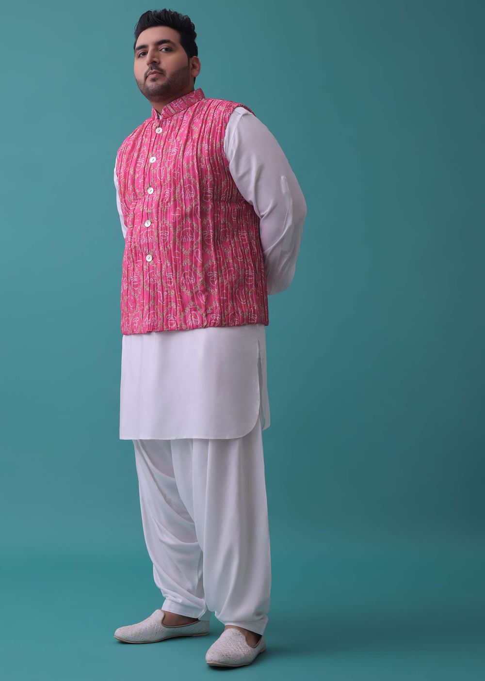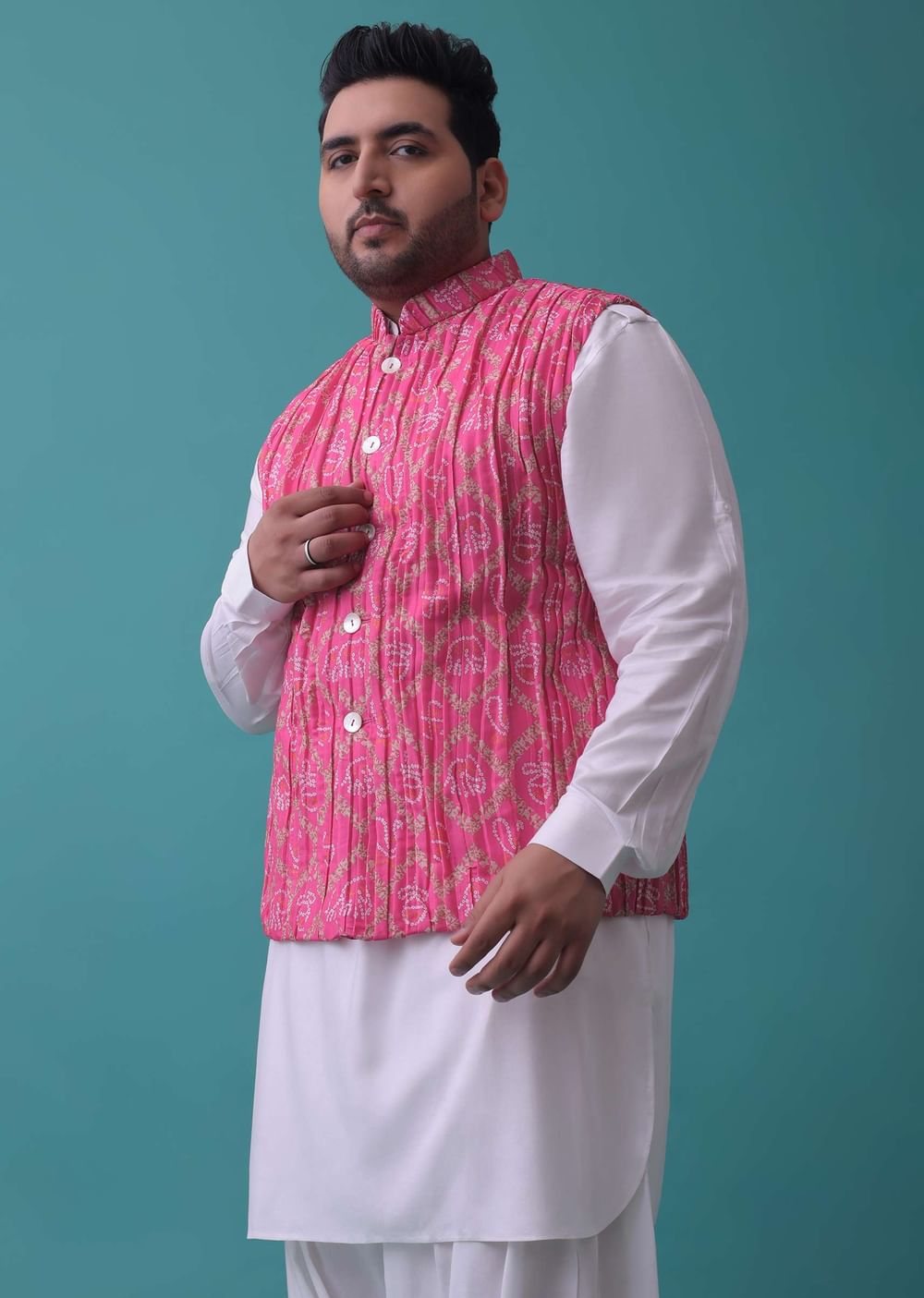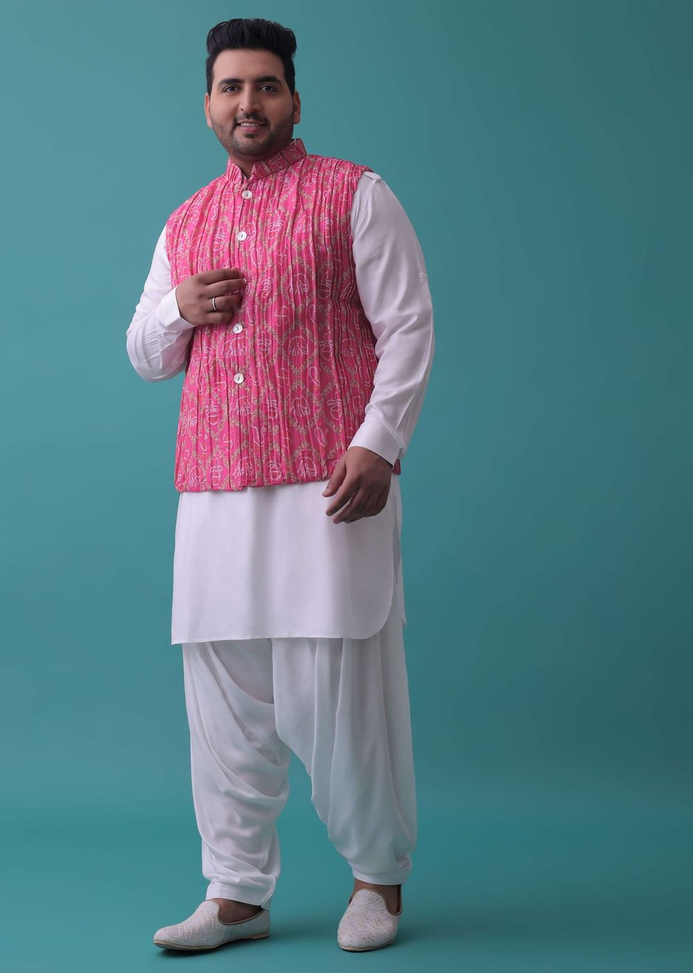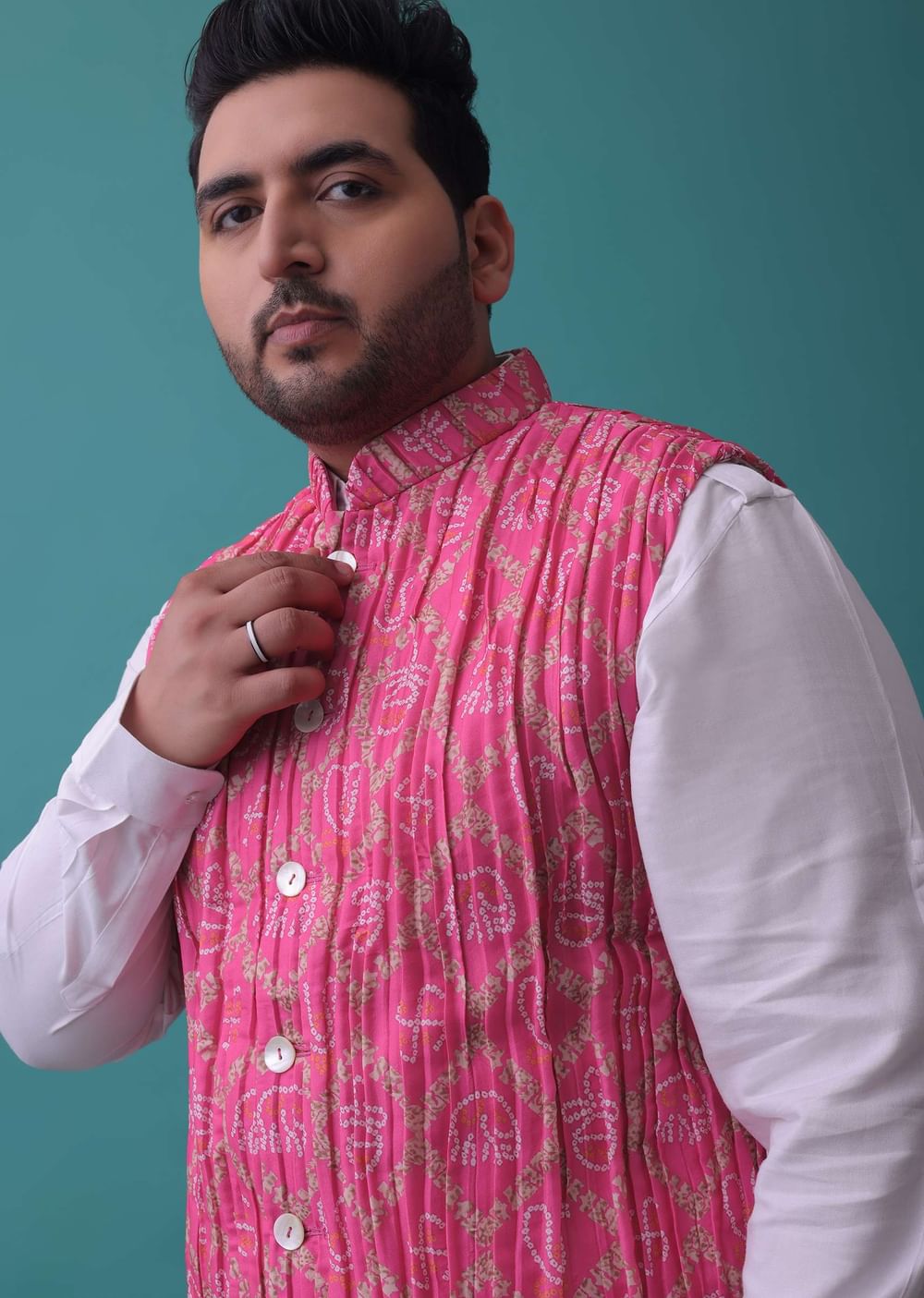 This stunning persian pink jacket kurta set is sure to catch everyone's attention.The jacket is embellished with an intricate bandhani print and a mandarin collar, adding to its charm.A matching patiala completes the set.EVENT - Perfect for attending day weddings.NOTE - Buttons and Accessories may vary in color, shape, and size. Awarded as the Most Trusted Brand, we're delivering styles you love, just as promised.