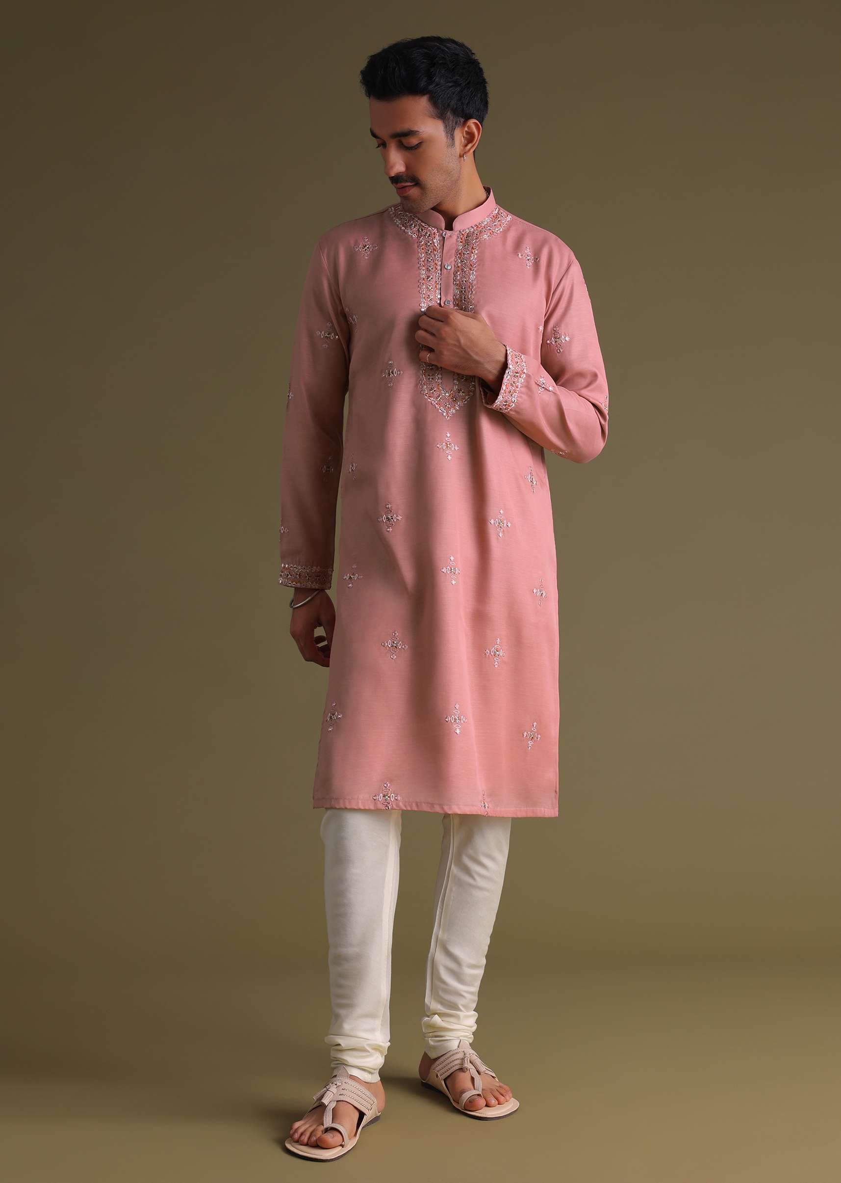 Petal Pink Kurta Set In Silk With Mirror Embroidery