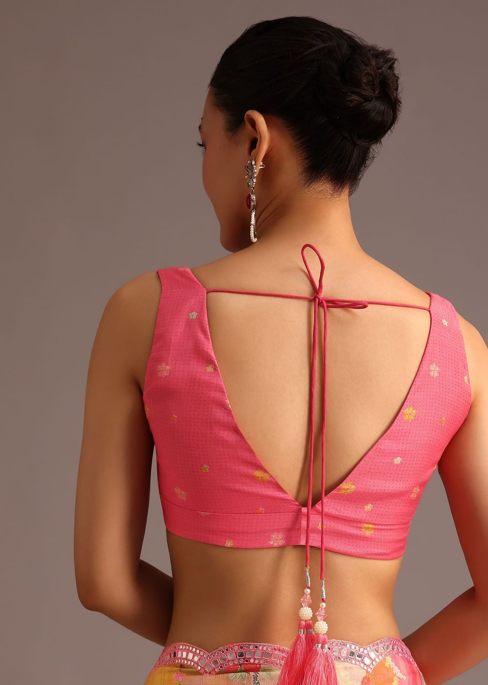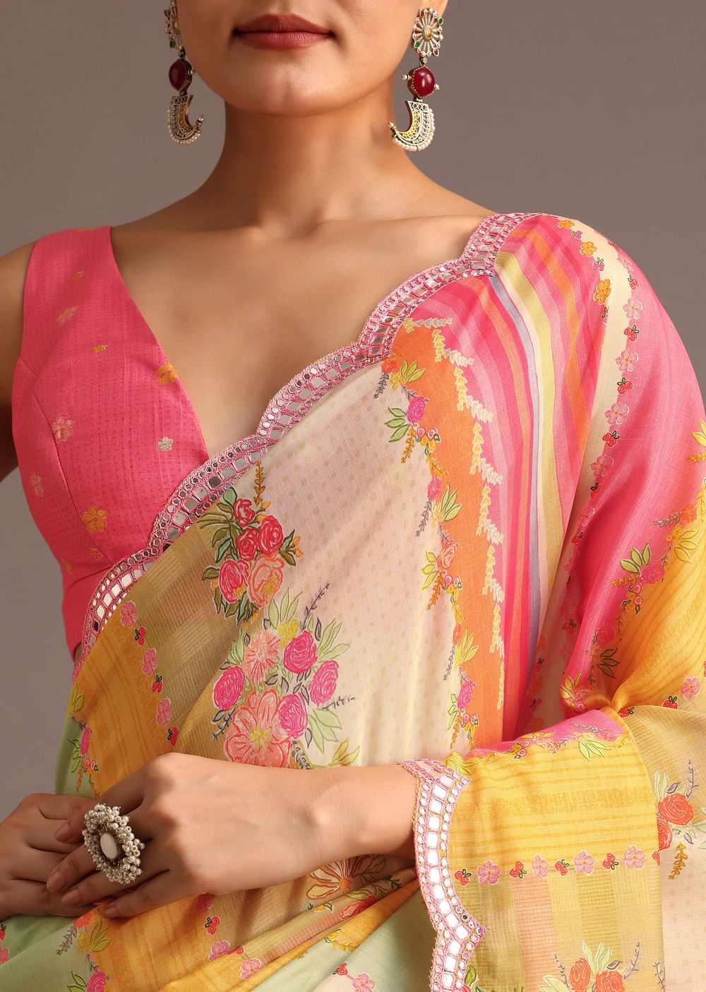 Style TipPair with a contrasting blouse, such as deep green or mustard, to create a striking visual contrast that enhances the saree's vibrant prints.Fit TipOpt for a tailored fit with your saree draping; ensure the pleats are neatly tucked and the pallu falls elegantly.