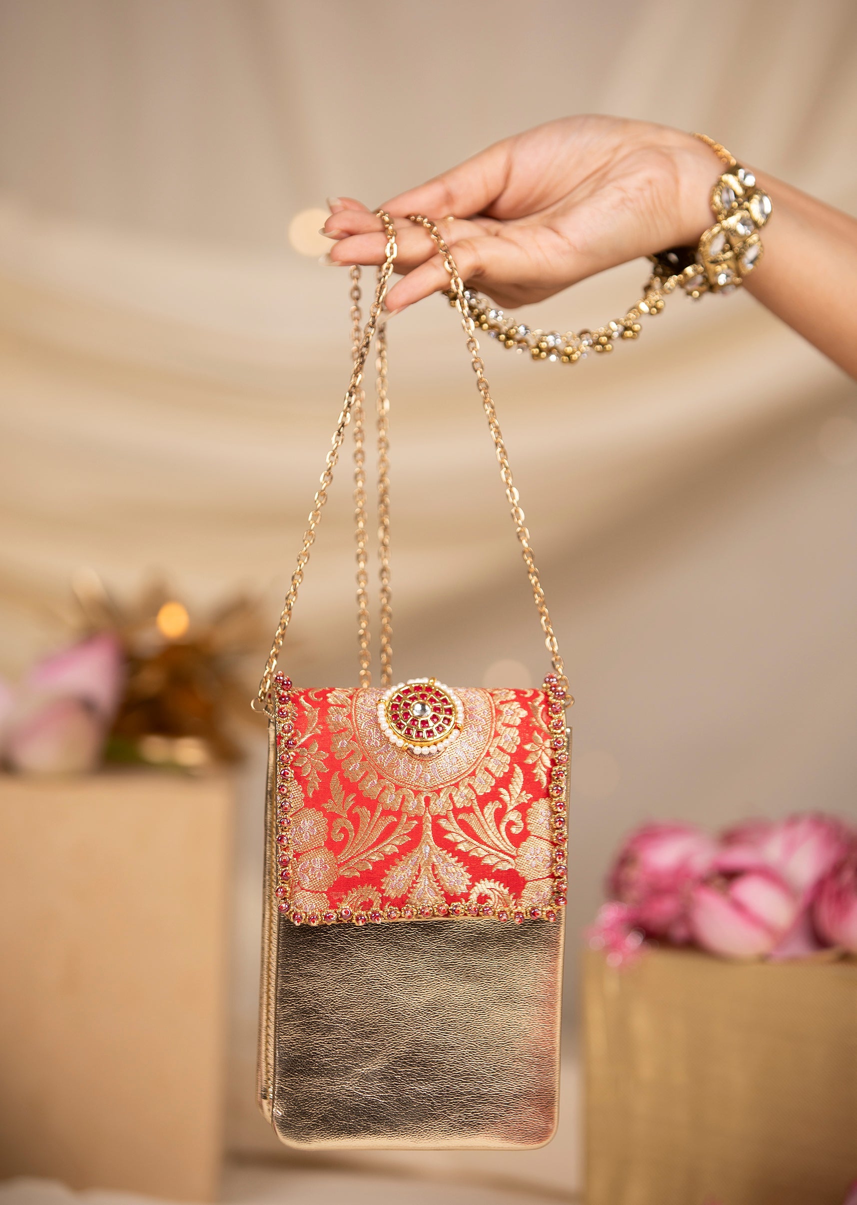 Make an elegant festive statement with this pink and gold flap bag, featuring exquisite zari embroidery and a bold Kundan centerpiece that instantly draws the eye. The rich colours and... More Product Details