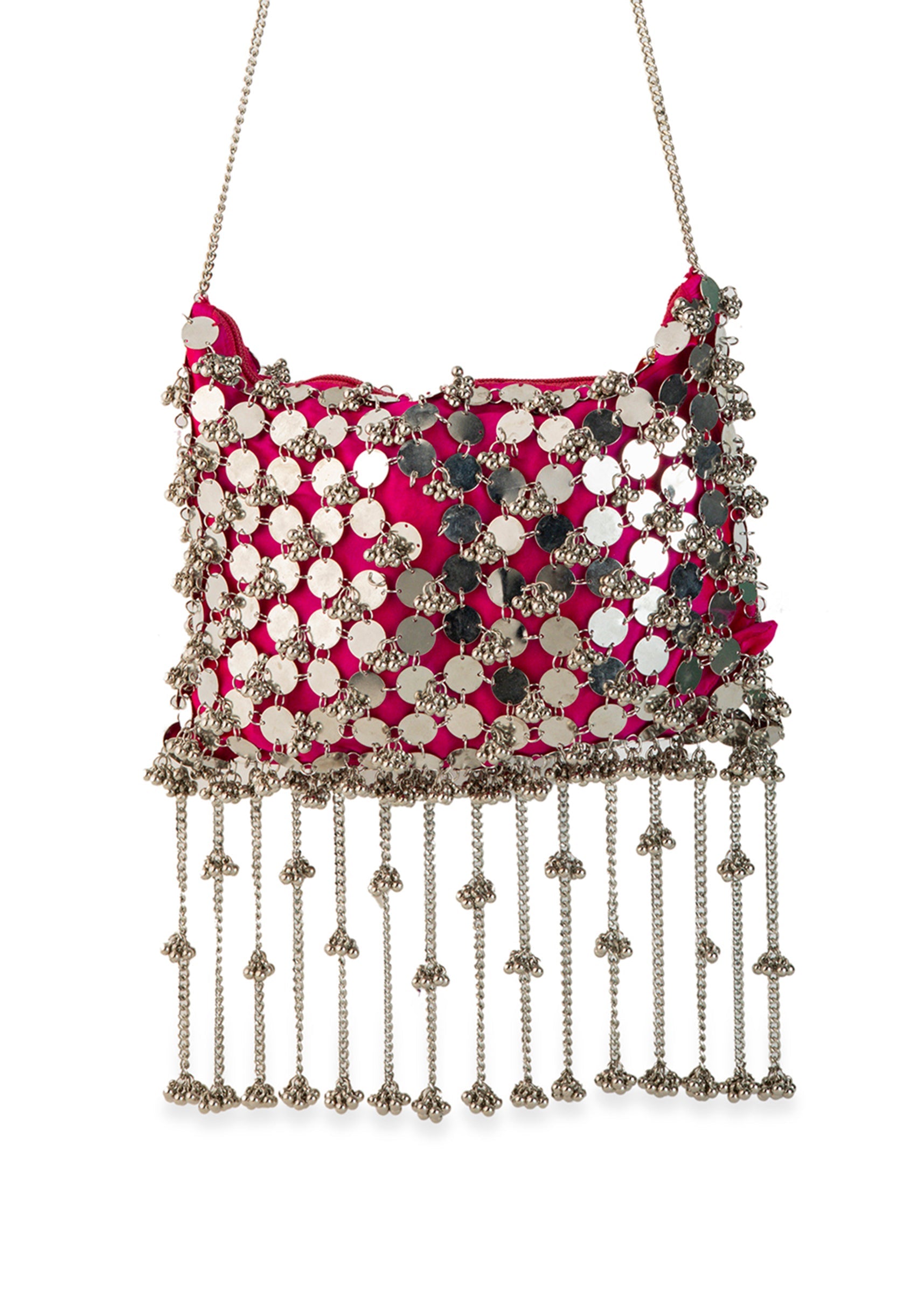 Turn up the festive flair with this pink and silver bag, adorned with cascading gold embellishments and mirror-like discs that sparkle with every move. The dynamic detailing and front zip... More Product Details