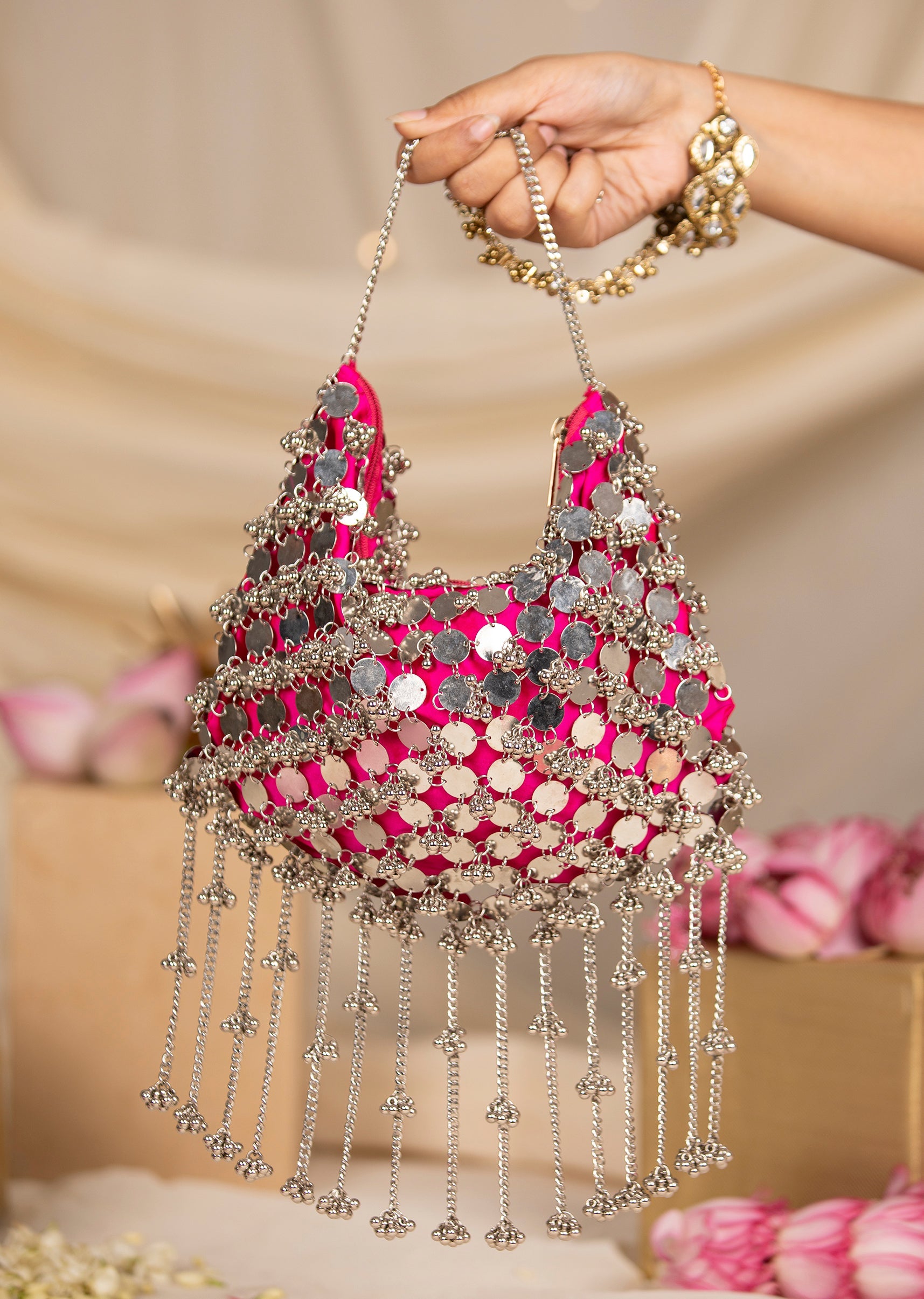 Turn up the festive flair with this pink and silver bag, adorned with cascading gold embellishments and mirror-like discs that sparkle with every move. The dynamic detailing and front zip design give it a lively, modern twist perfect for celebrations and night time events. Light, bold, and full of personality, it brings instant glamour to any ensemble. Awarded as the Most Trusted Brand, we're delivering styles you love, just as promised.