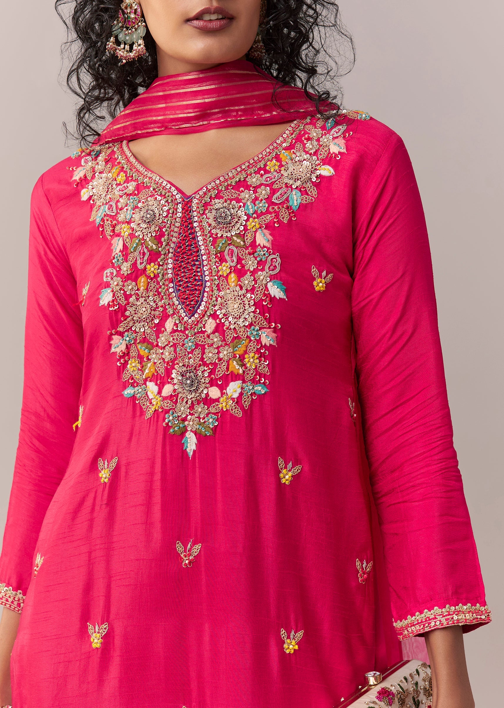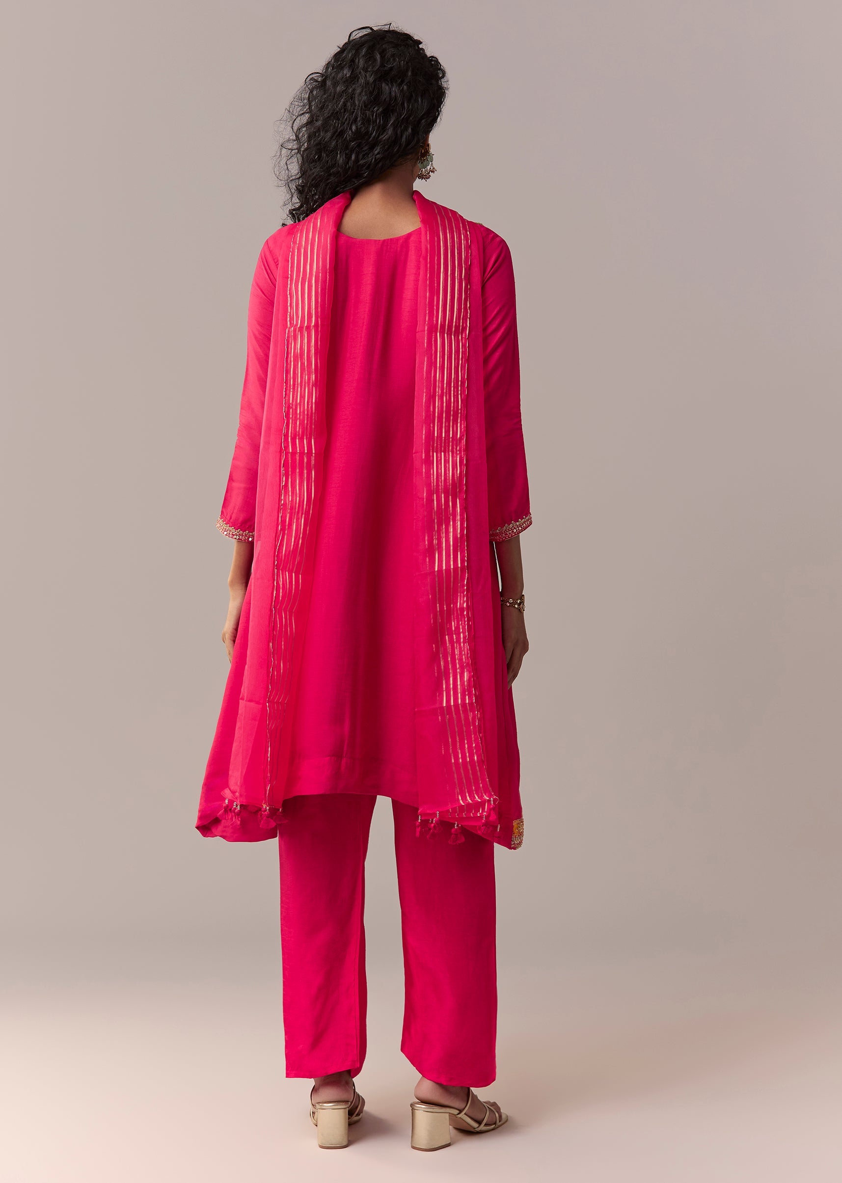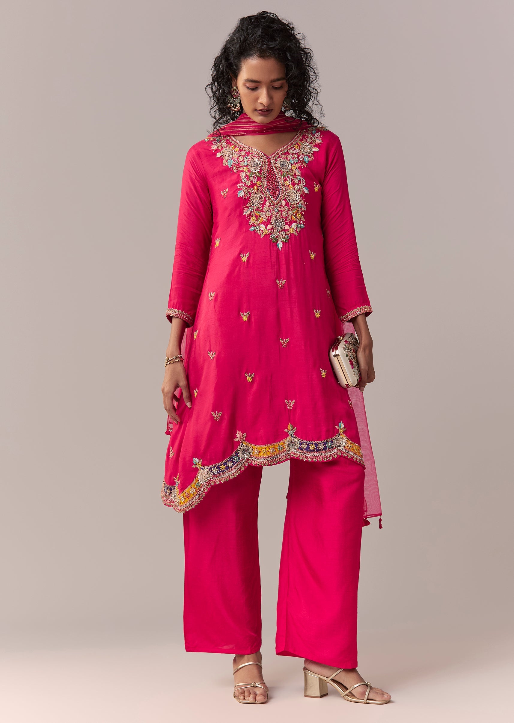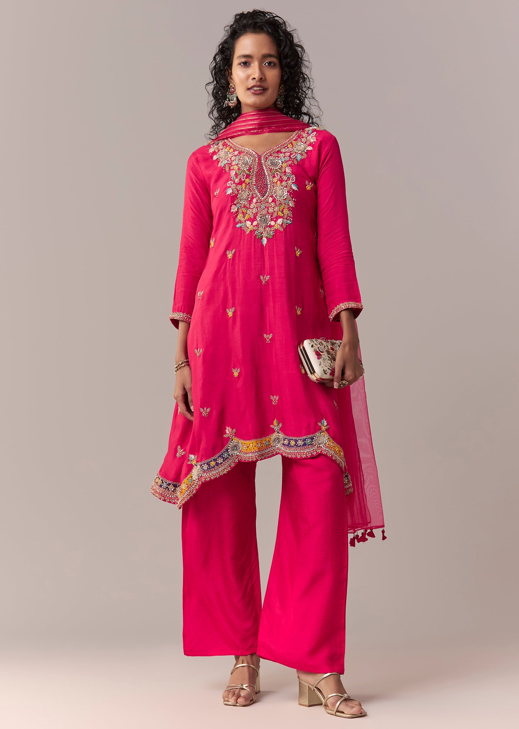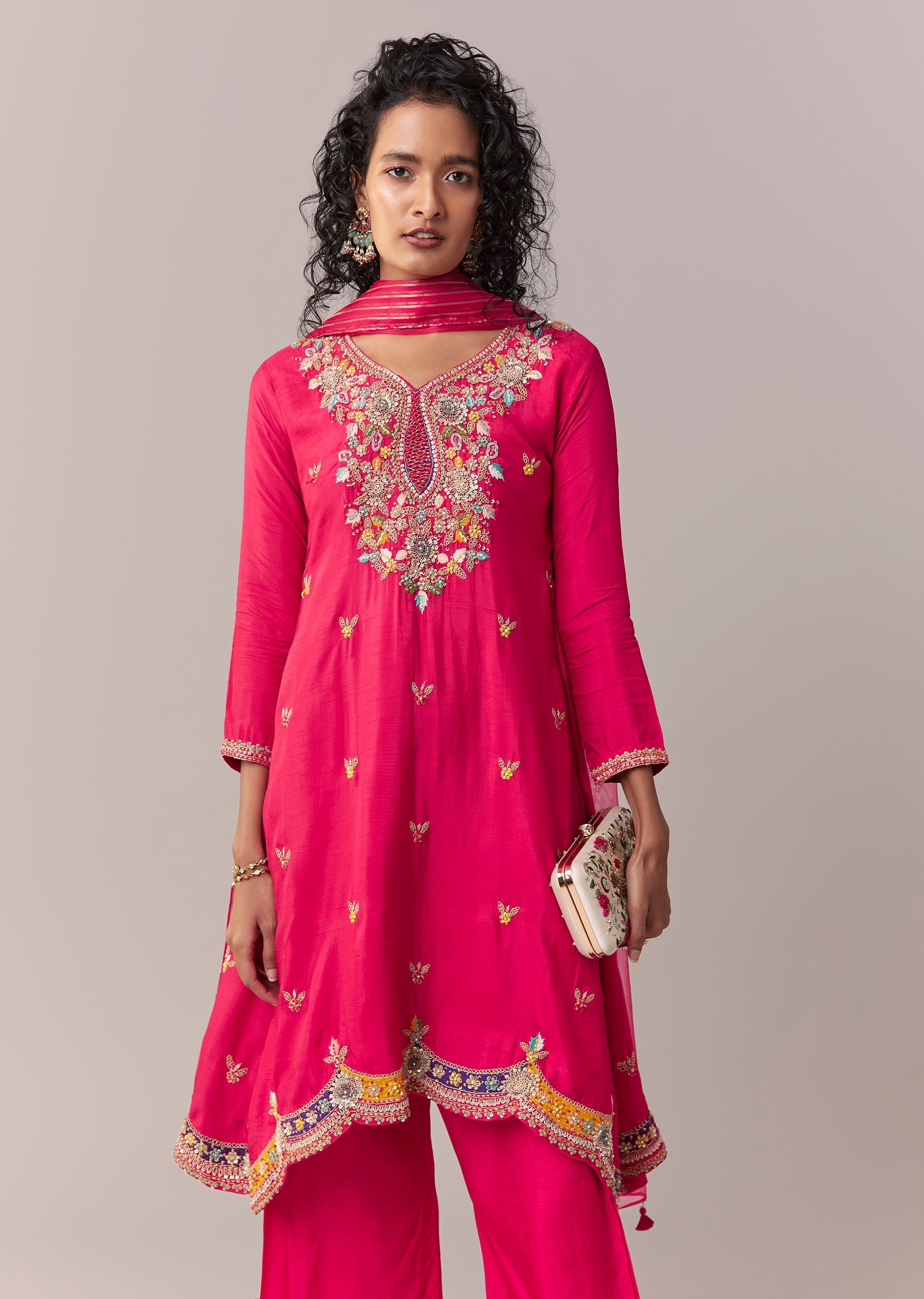 Crafted in rich dola silk, this minimal festive set features an asymmetric knee-length short anarkali enhanced with thread and sequin work. Designed with a V-neckline and 3/4th sleeves, it’s paired... More Product Details