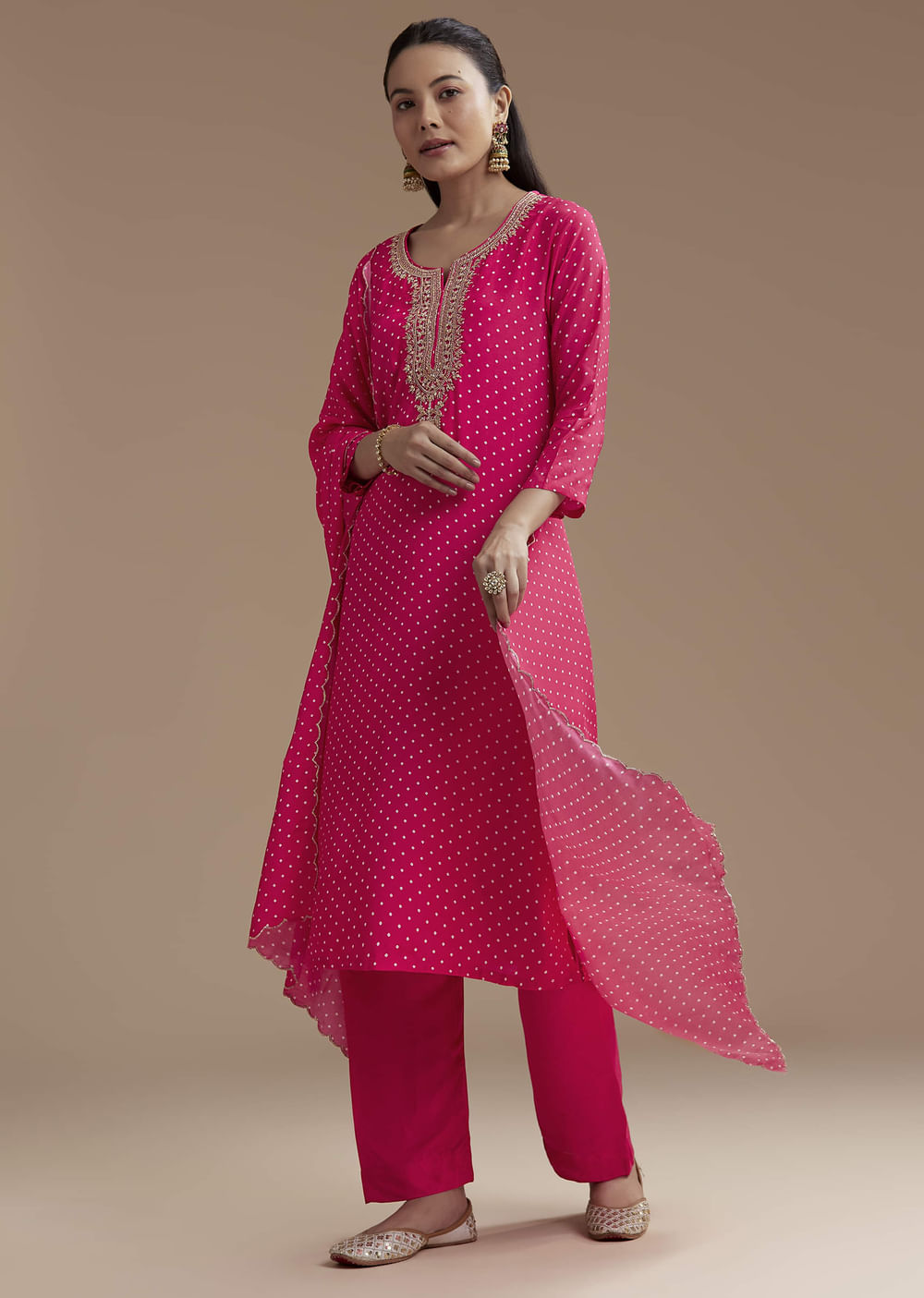 Pink Bandhani Printed Silk Kurta Set with Zari Work