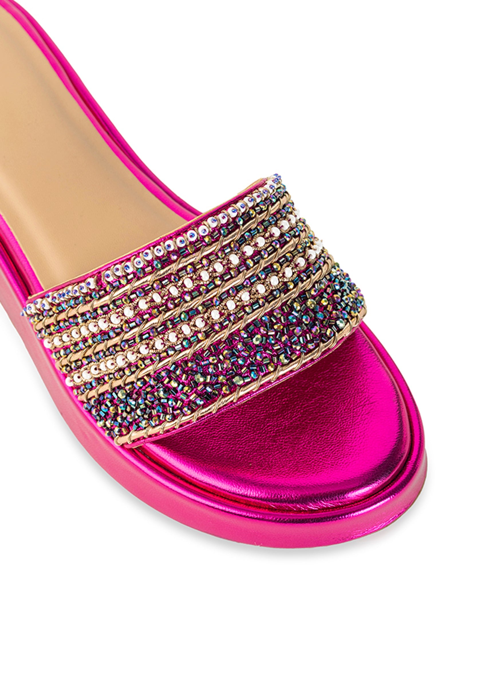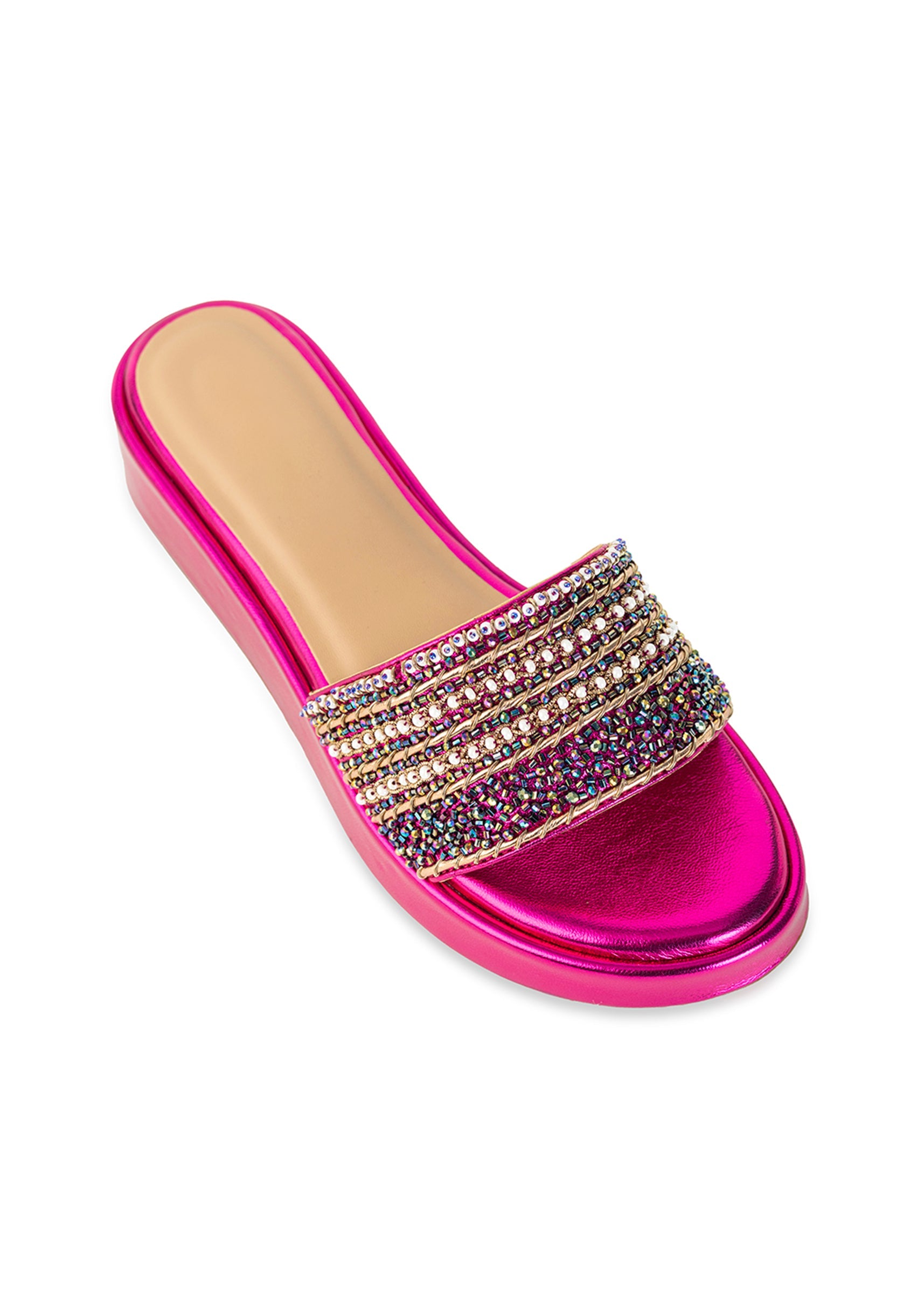 Step into the fun of the festivities with heels that glow in a metallic pink hue and dazzle with intricate hand embellished beads and sequins. Set on smooth faux leather,... More Product Details