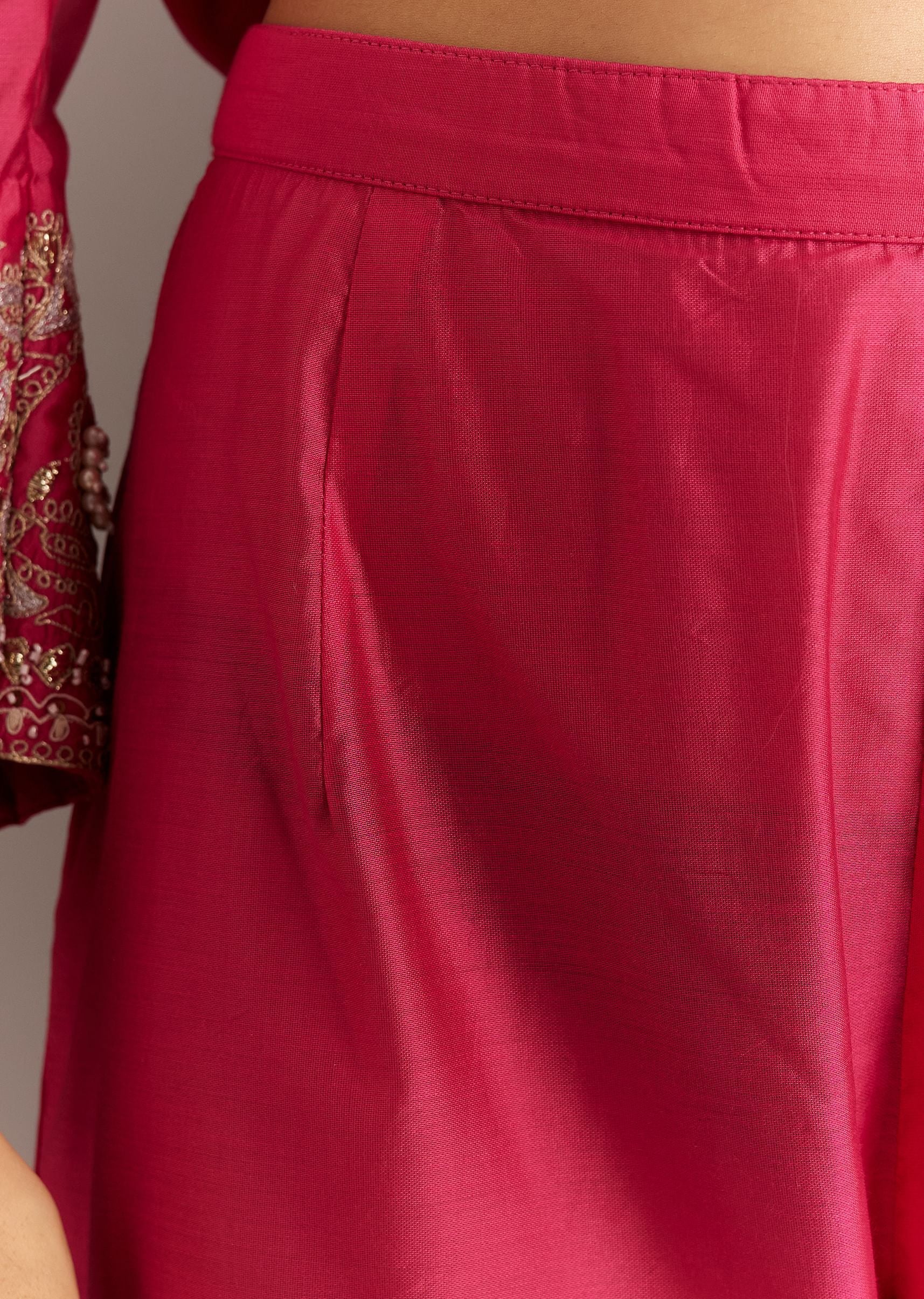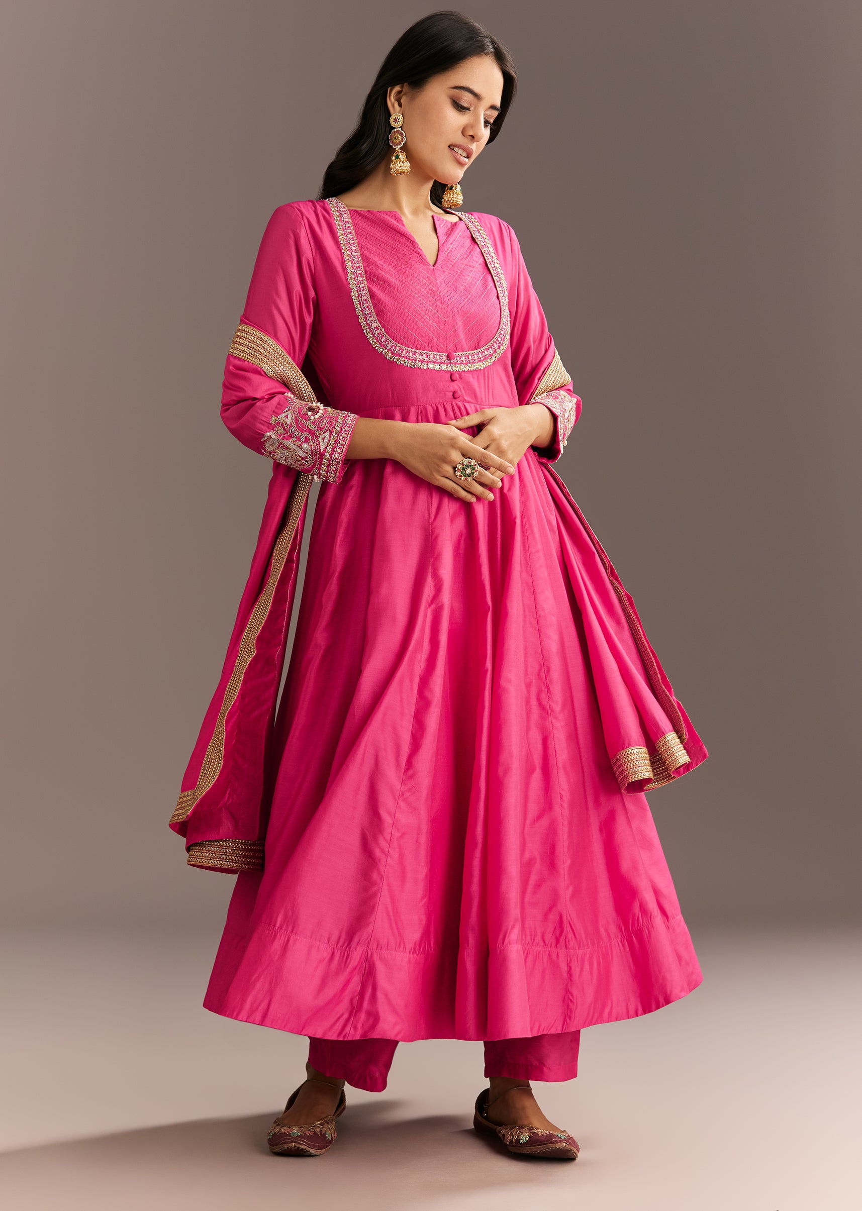 Pink Chanderi Anarkali With Gotta Moti Neckline And Lace Dupatta