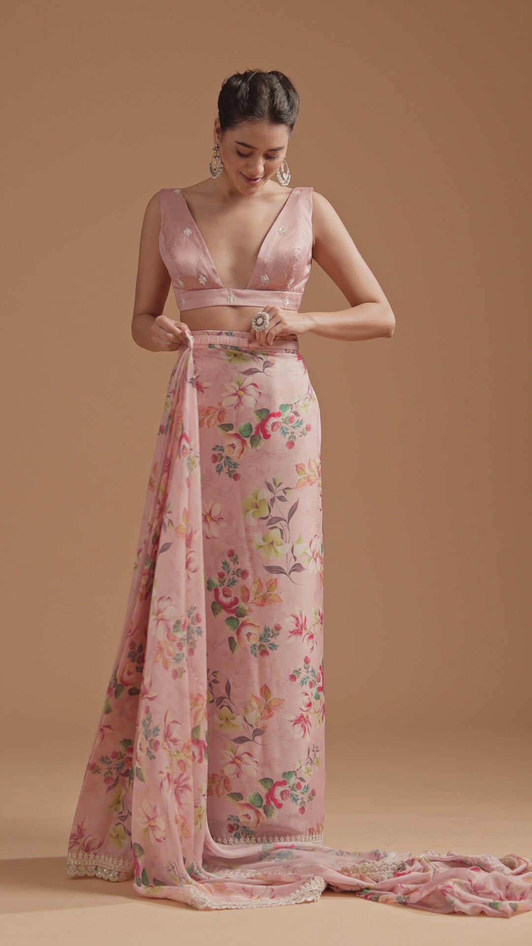 Pink Chiffon Ready To Wear Saree With Floral Prints And Unstitched Blouse Piece