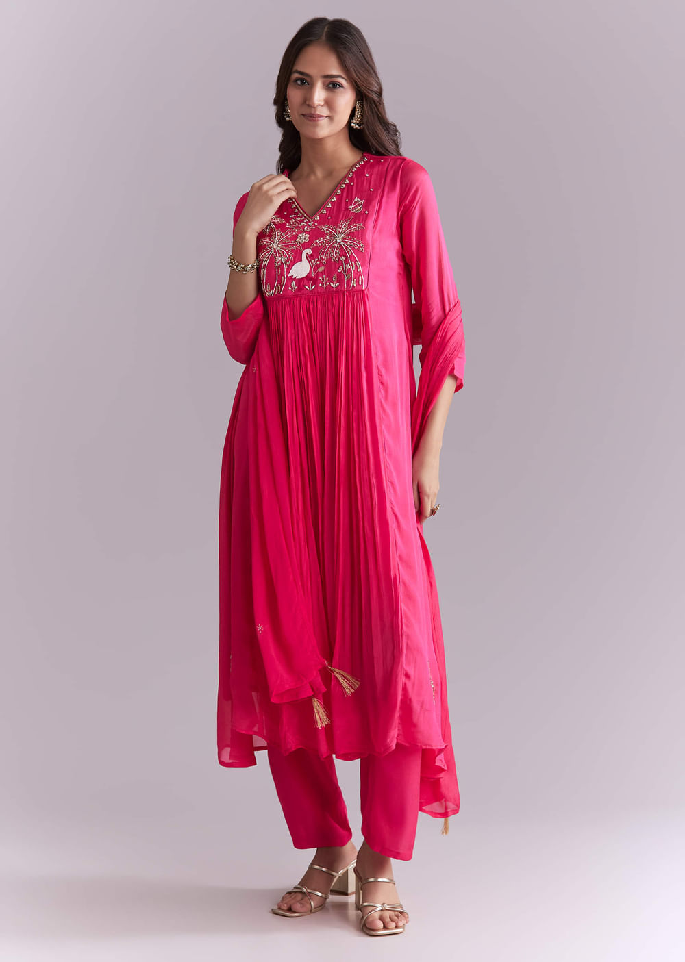 For evenings that ask for shimmer with softness, this pink chinon anarkali suit moves lightly and photographs beautifully. Moti and resham embroidery plays across the anarkali for a refined, festive... More Product Details
