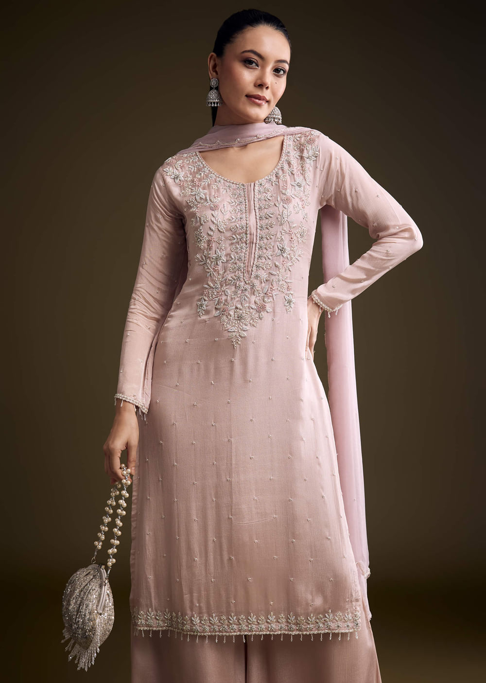 Pink Chinon Palazzo Suit With Zardosi And Cutdana Embroidery