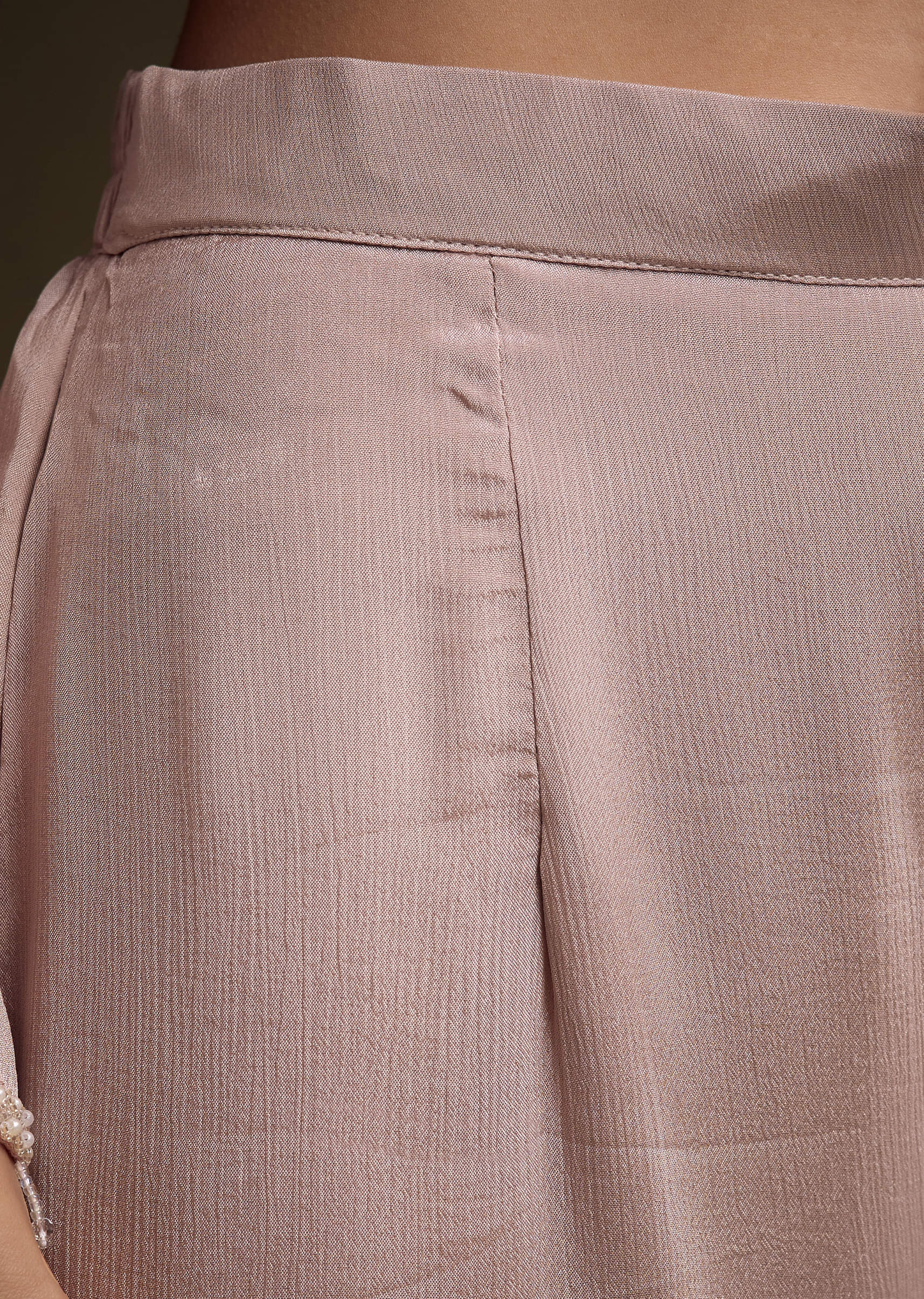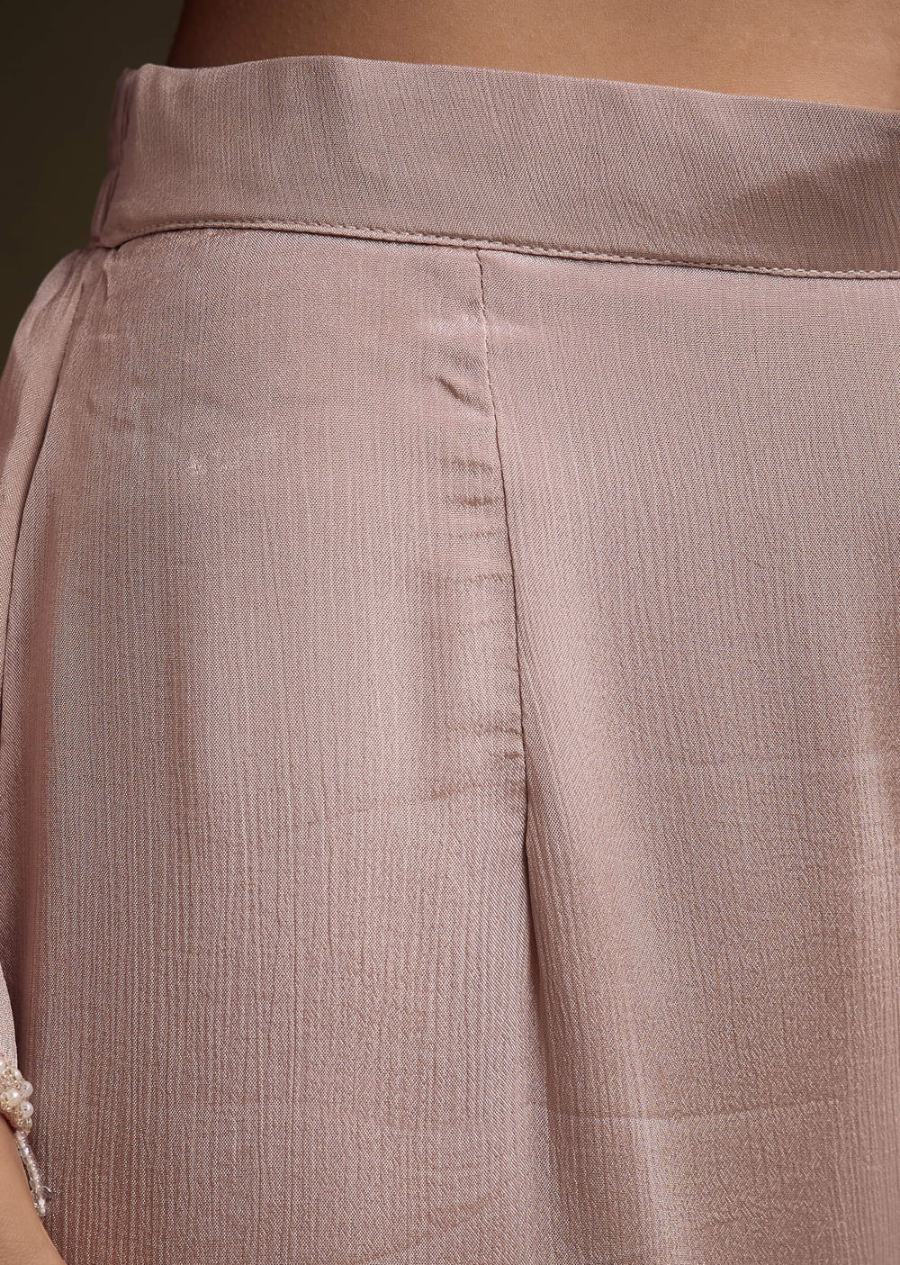 For feminine colour with artisanal detail, this pink chinon palazzo suit balances soft drape with crafted shine. Zardosi and cutdana embroidery lift the neckline and yoke for a ceremonial finish.... More Product Details