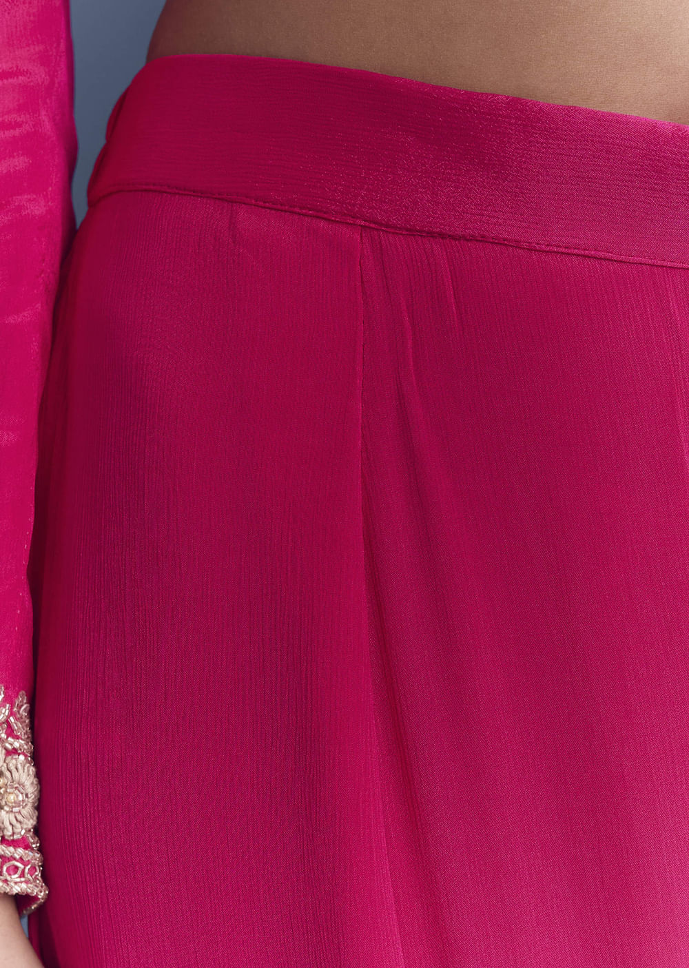 When the brief is soft colour with sparkle, this pink chinon sharara suit keeps the drape light and the styling simple. Cutdana and sequins embroidery adds a refined glow that... More Product Details