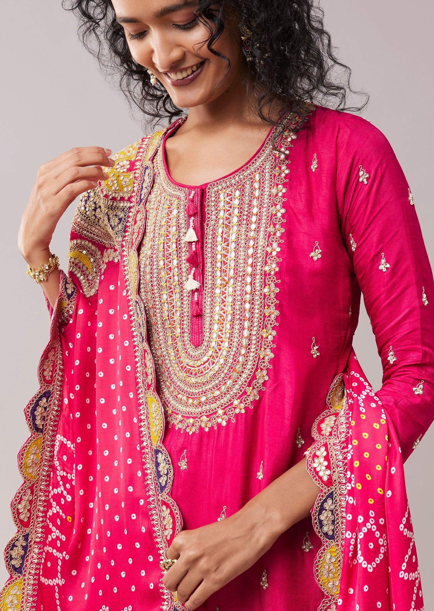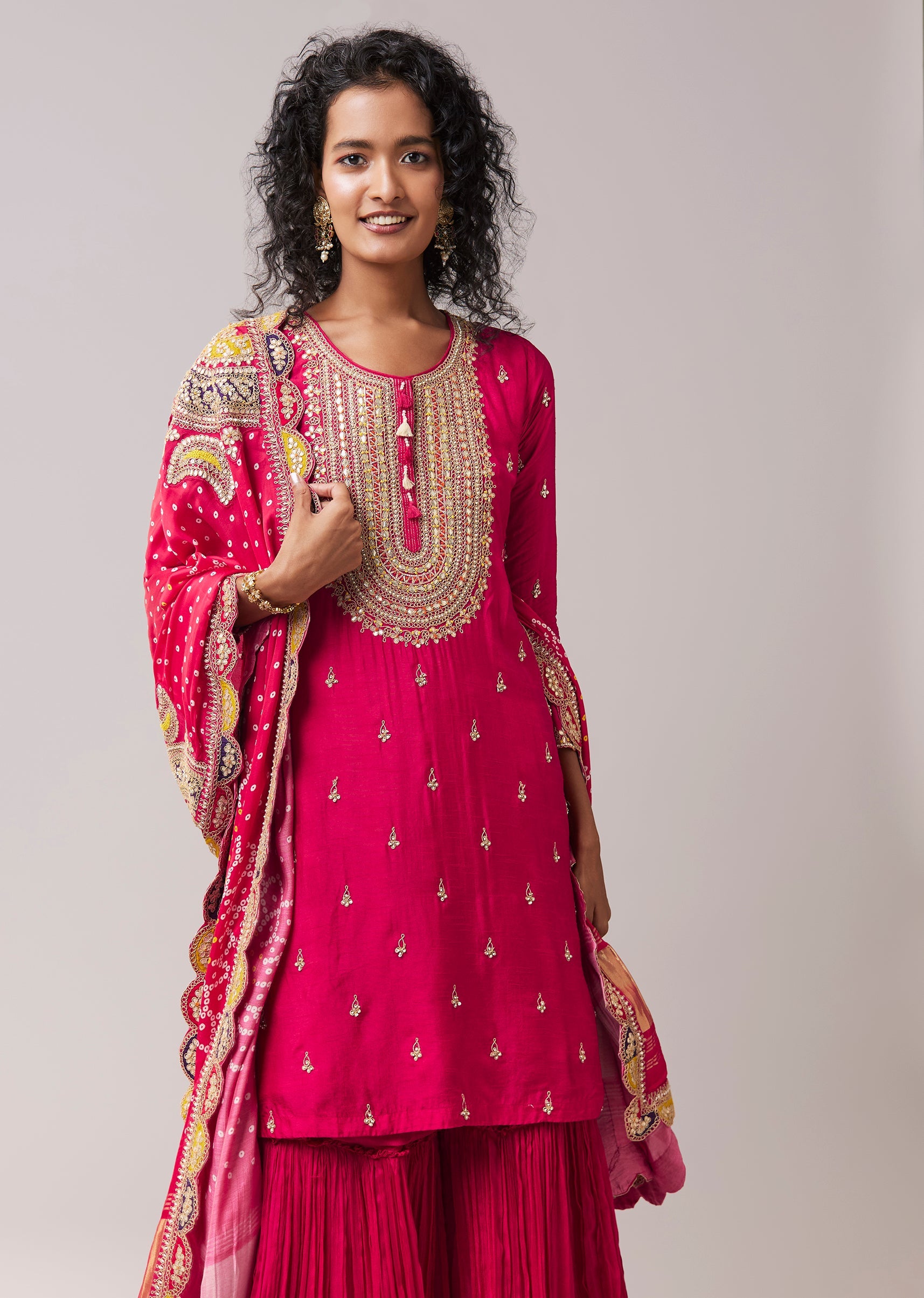 Rooted in classic elegance, this zari thread work kurta sharara set brings together rich texture and graceful movement. The silk kurta is adorned with refined zari embroidery, styled with a timeless round neckline and comfortable 3/4th sleeves. Paired with a fluid chinon sharara and a matching dupatta, the ensemble creates a balanced silhouette that feels festive yet effortless. Ideal for weddings, festive celebrations, and traditional gatherings. Awarded as the Most Trusted Brand, we're delivering styles you love, just as promised.