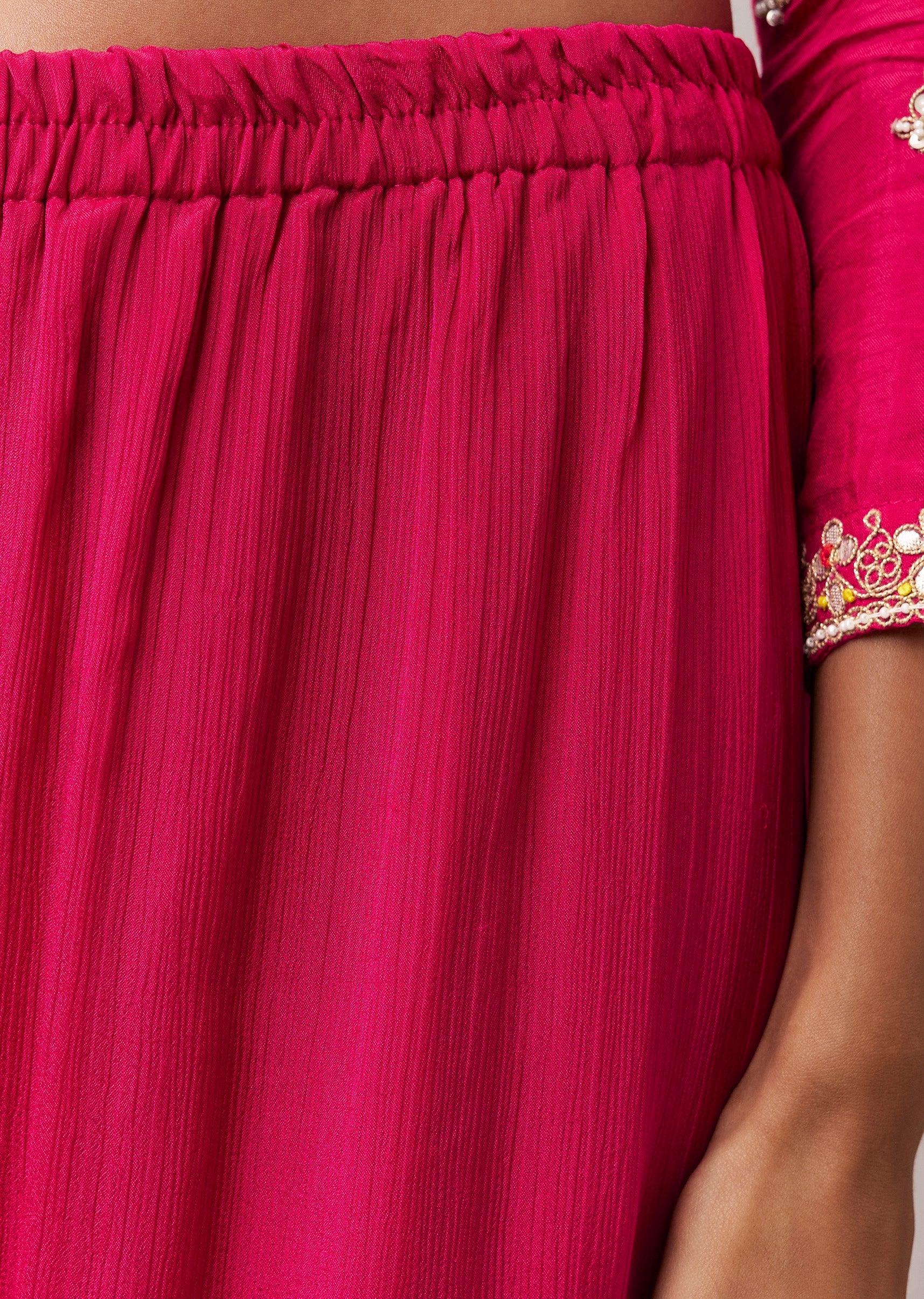 Fit Tips:The front hook eye closure offers a neat, structured fit for the kurta, while the sharara ensures comfort and ease of movement throughout wear.