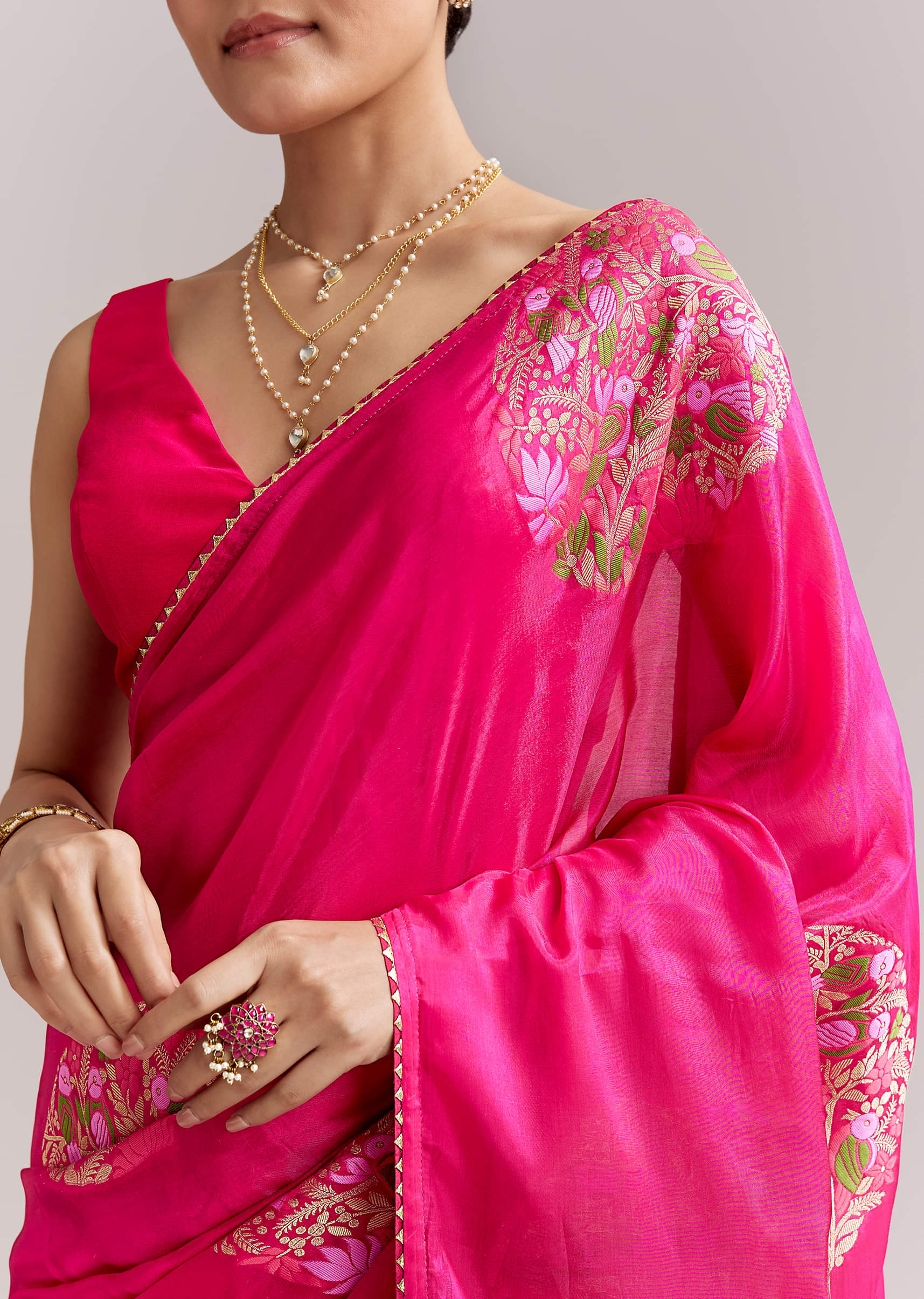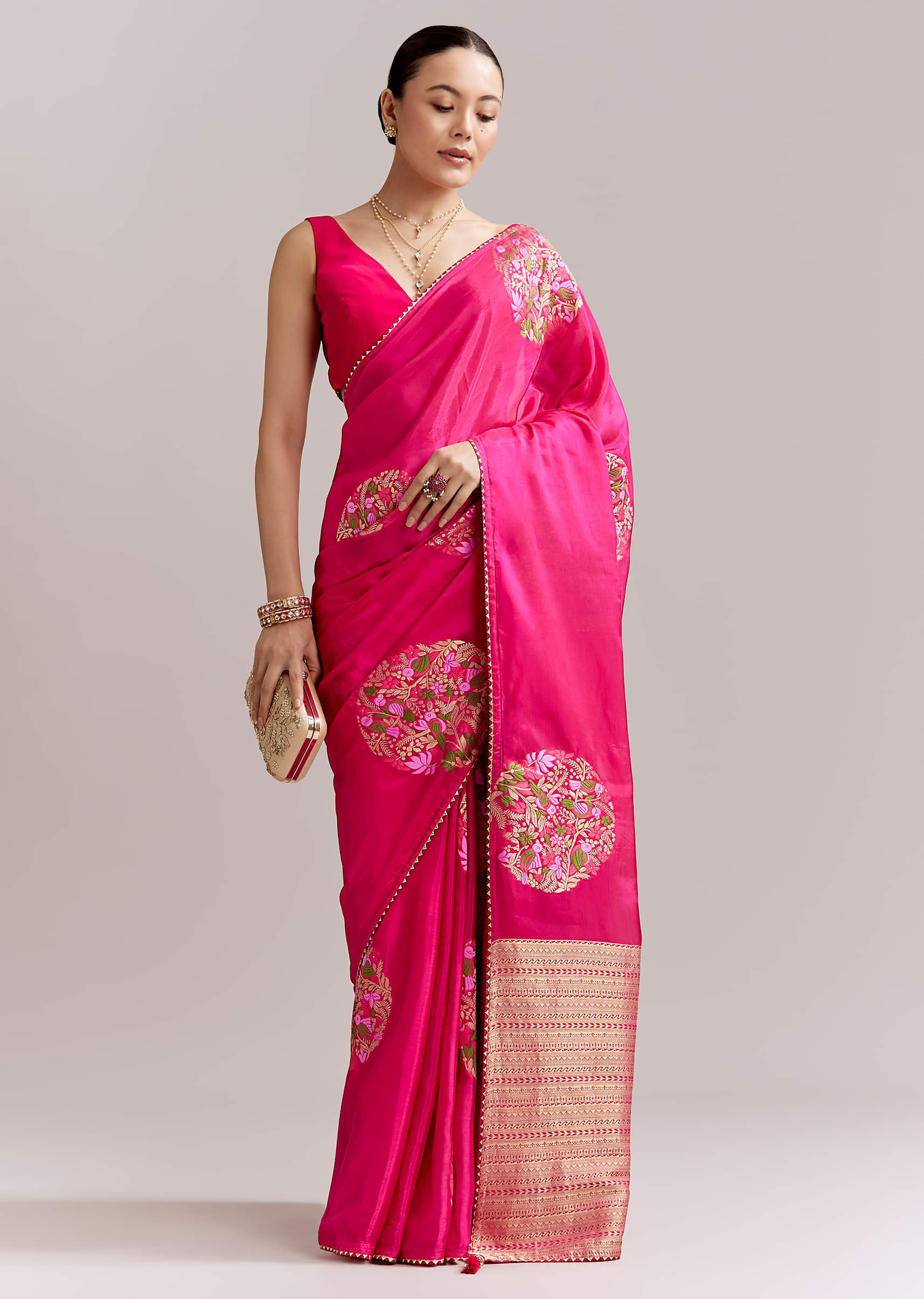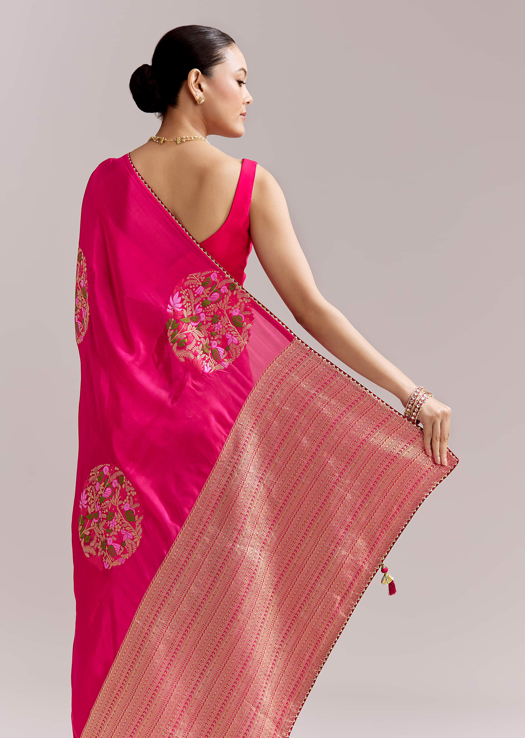 Pink Chinon Woven Saree With Multicolour Circular Motifs