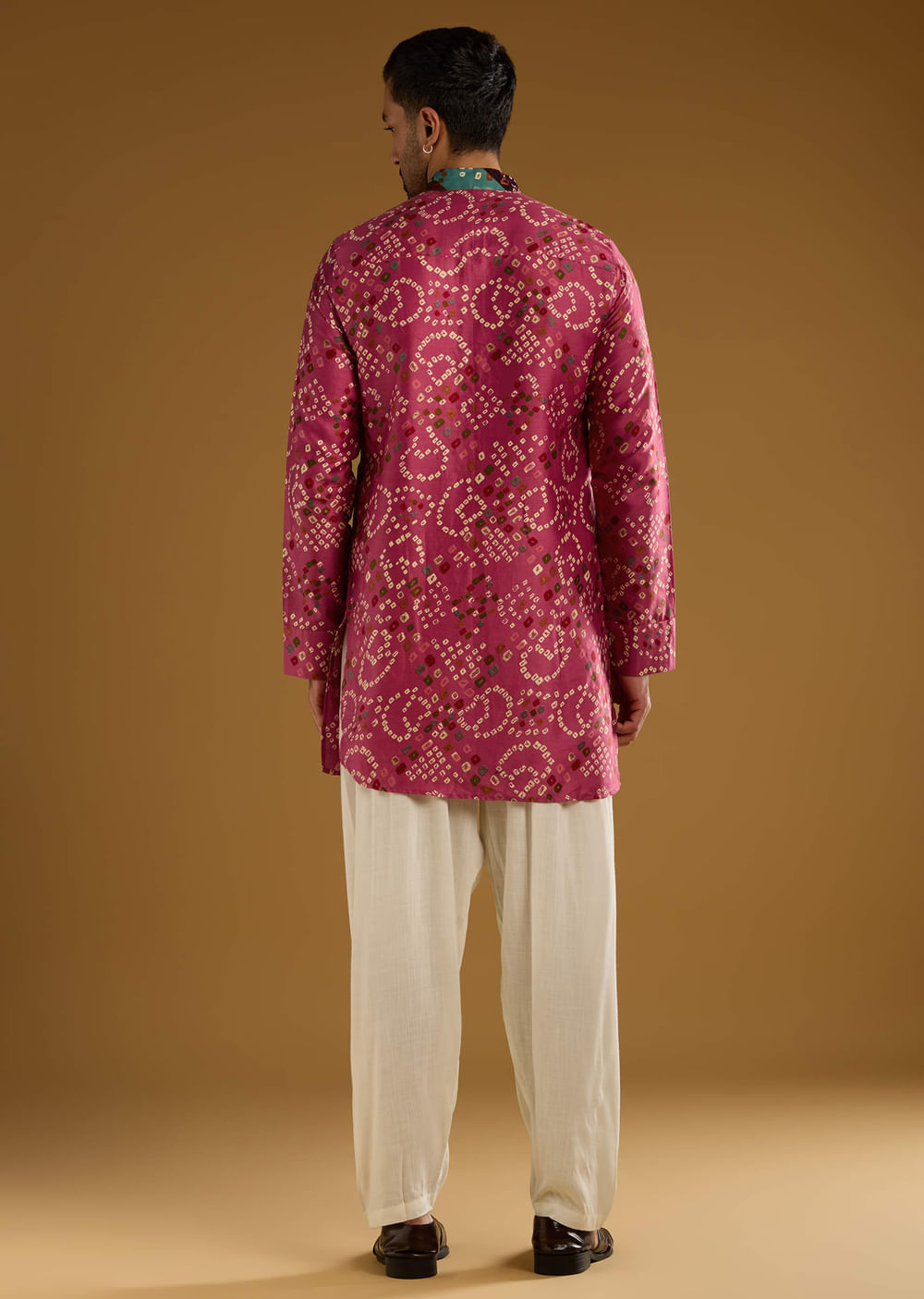 Pink Cotton Silk Kurta Set For Men With Hand Dyed Bandhani Print