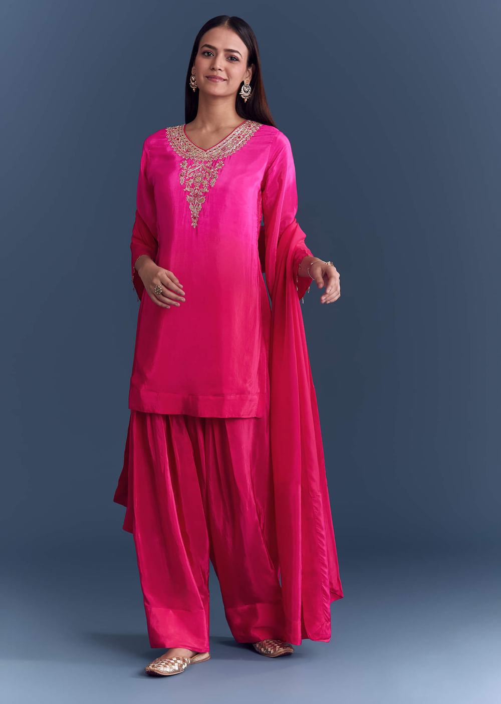 For a tailored take on festive dressing, this pink crepe kurta set pairs delicate zardosi work with modern farzi pants. The clean lines keep the look sharp while the embroidery... More Product Details