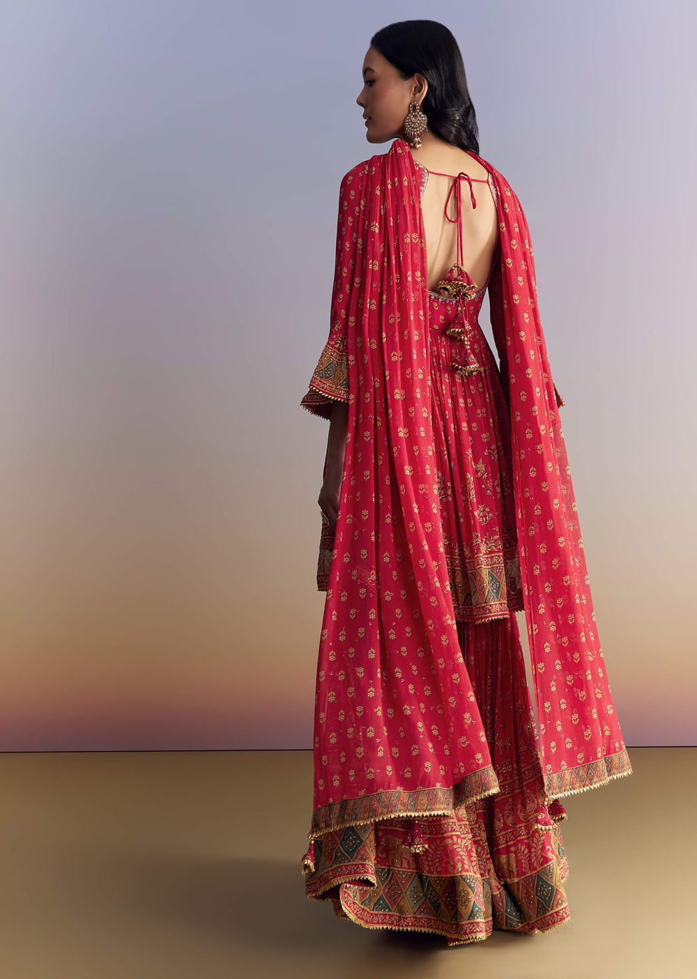 The kurta should feel easy and secure through the bodice with gentle room at the peplum, while the sharara sits mid-waist with a smooth, twirl friendly flare.