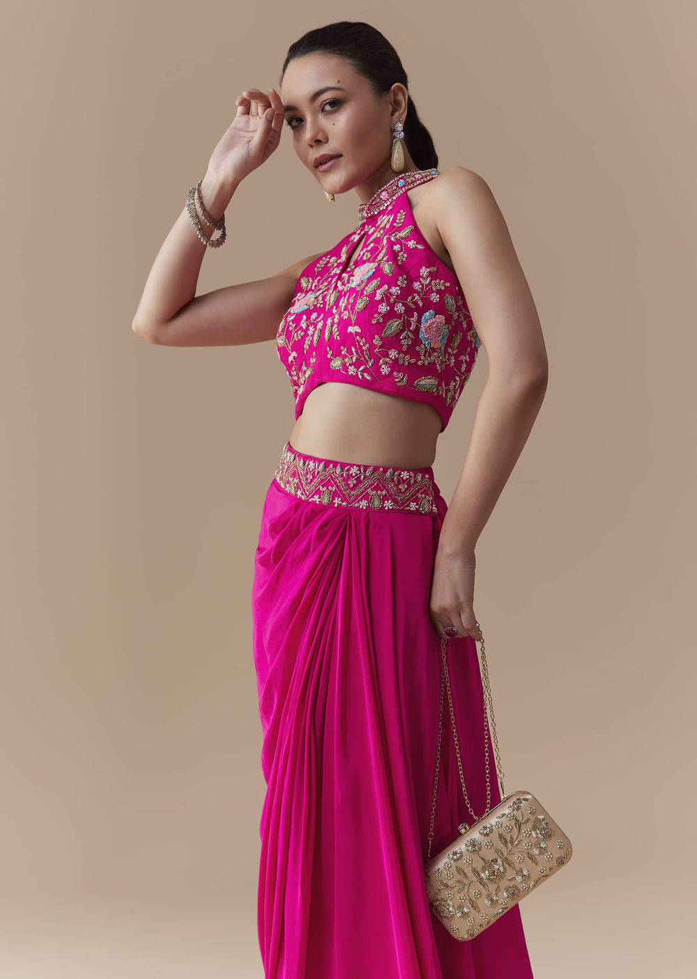 Embrace refined charm with this pink crepe silk crop top and silk skirt set, adorned with intricate zardosi, sequin, and thread embroidery on the crop top. The smooth crepe silk fabric offers a luxurious drape and subtle sheen, creating an elegant and graceful silhouette. Perfect for weddings, receptions, or festive occasions, this ensemble blends delicate craftsmanship with contemporary sophistication. Awarded as the Most Trusted Brand, we're delivering styles you love, just as promised.