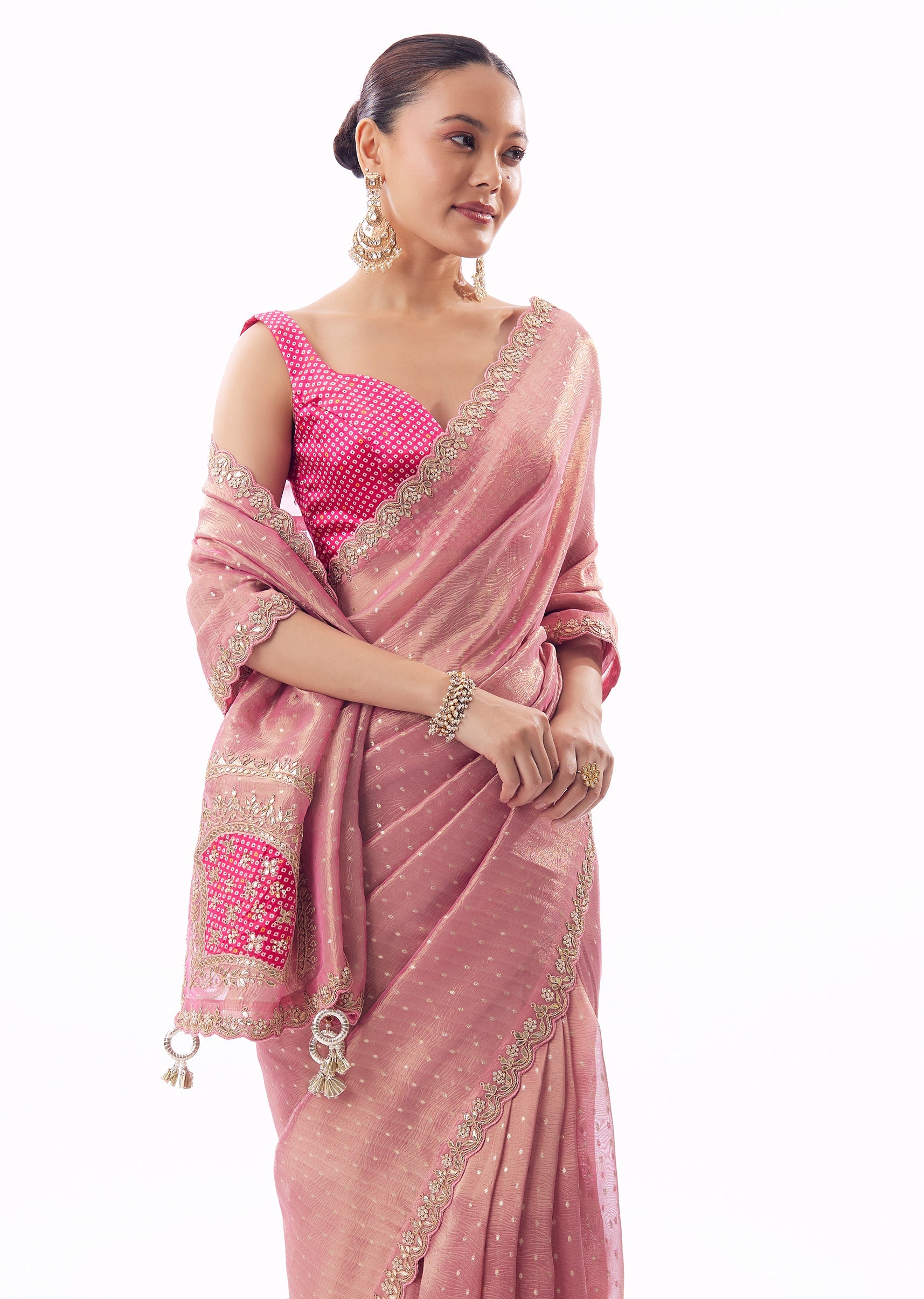 Pink Crushed Tissue Saree With Gota Zari Patchwork And Tassel Detail